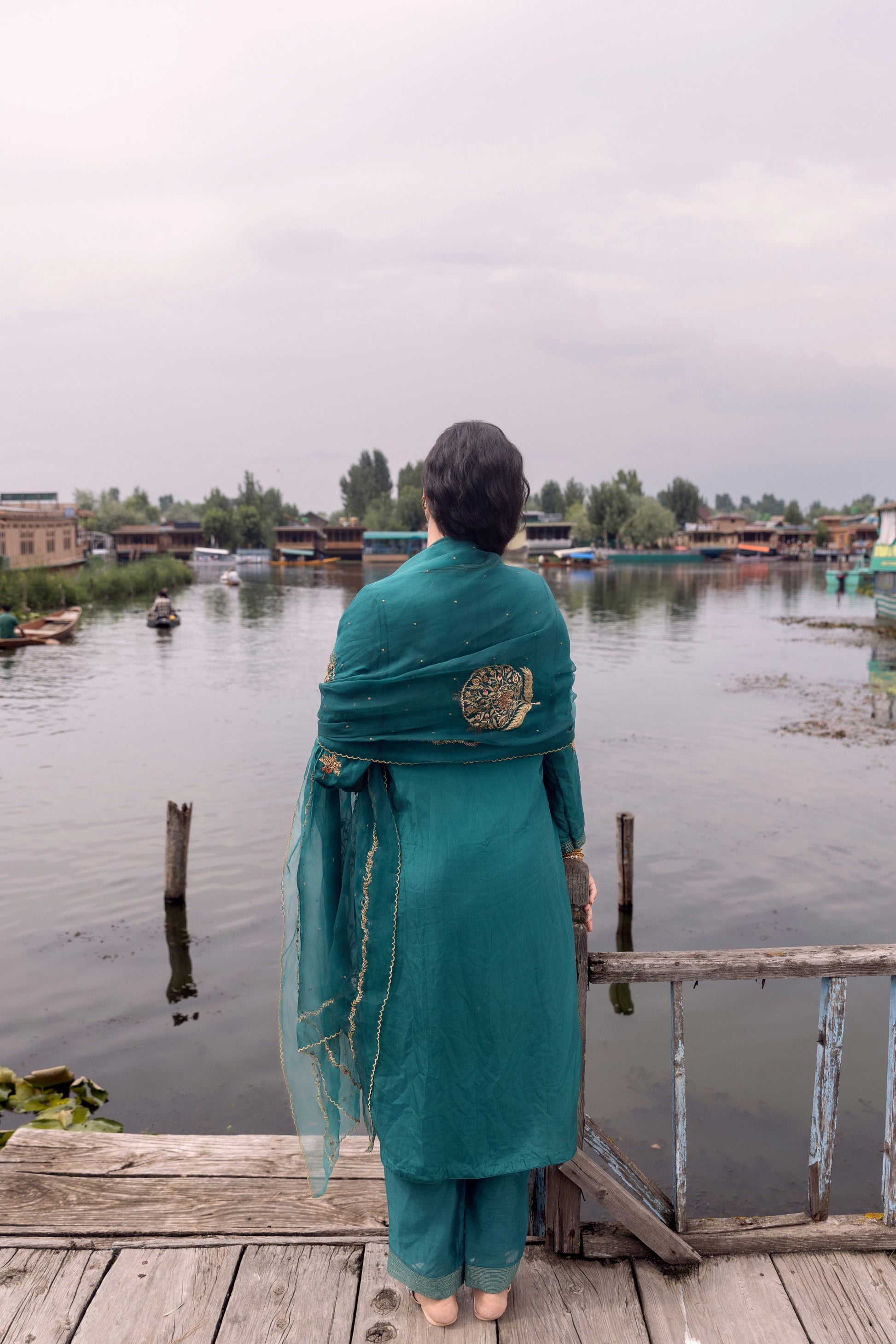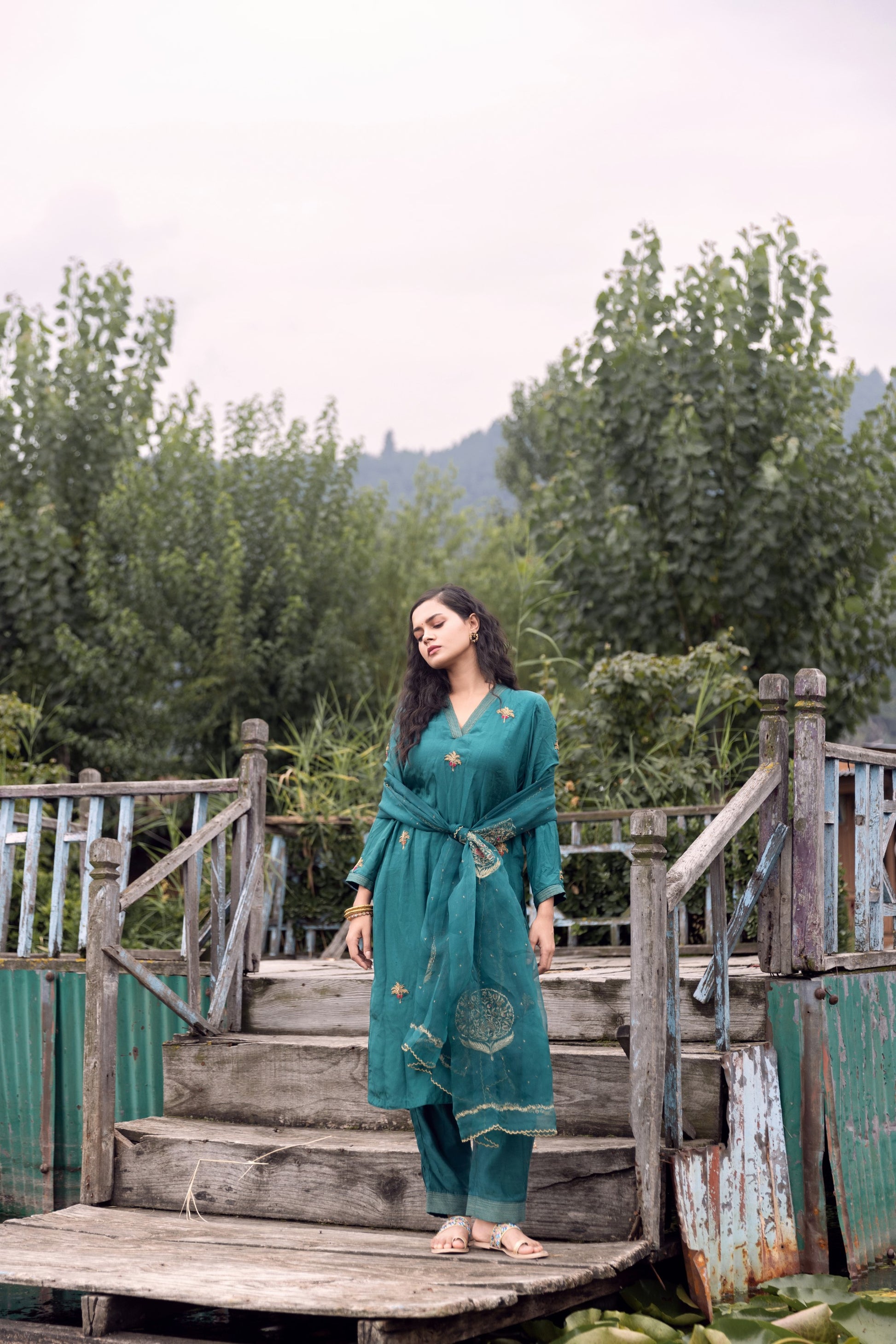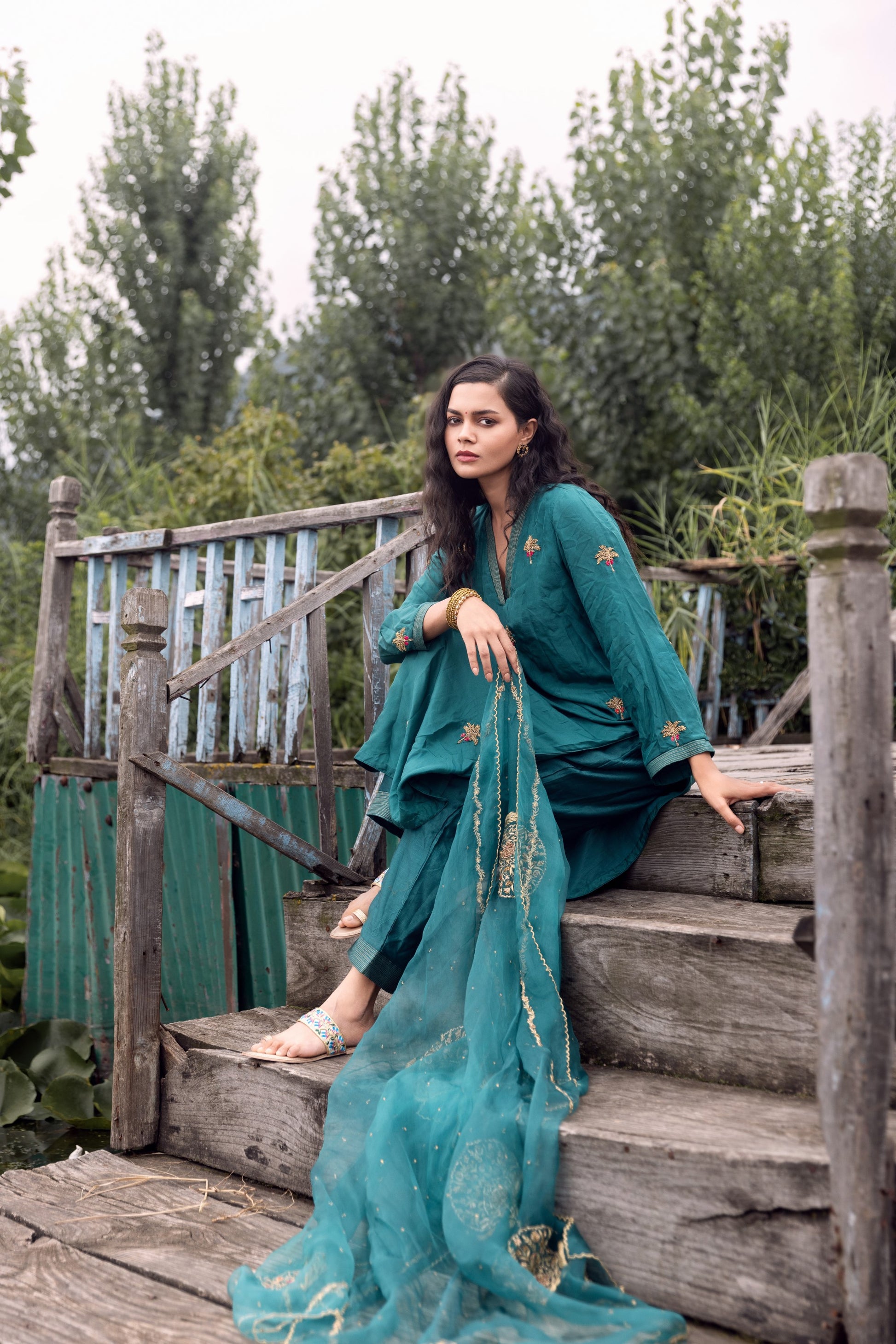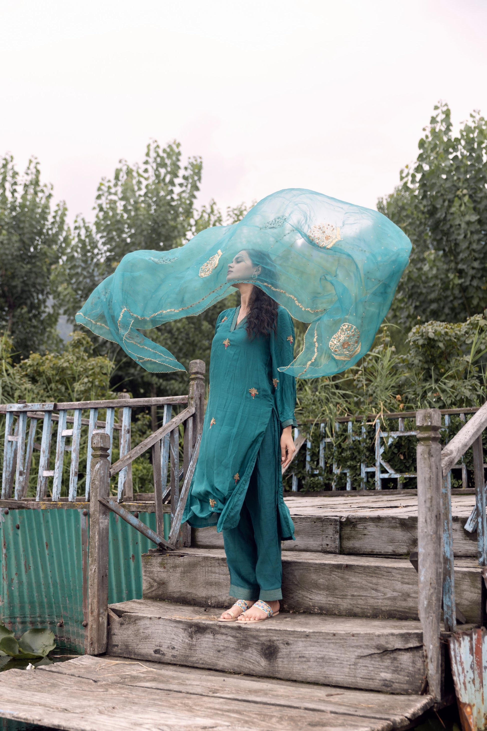 Teal-colored silk kurta coupled with a chanderi and silk organza dupatta, showcasing exquisite zari and dapka zardozi antique craftsmanship.