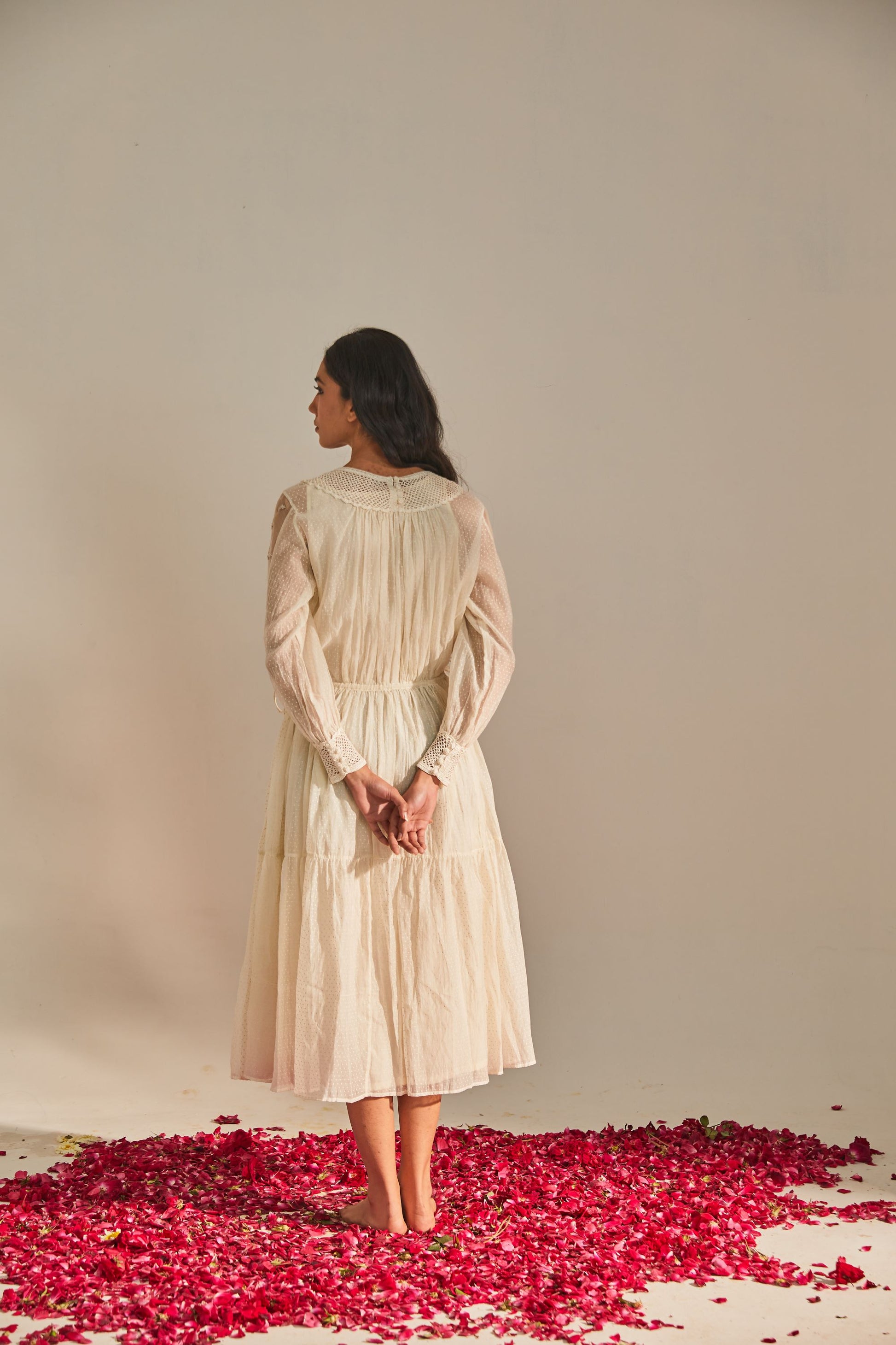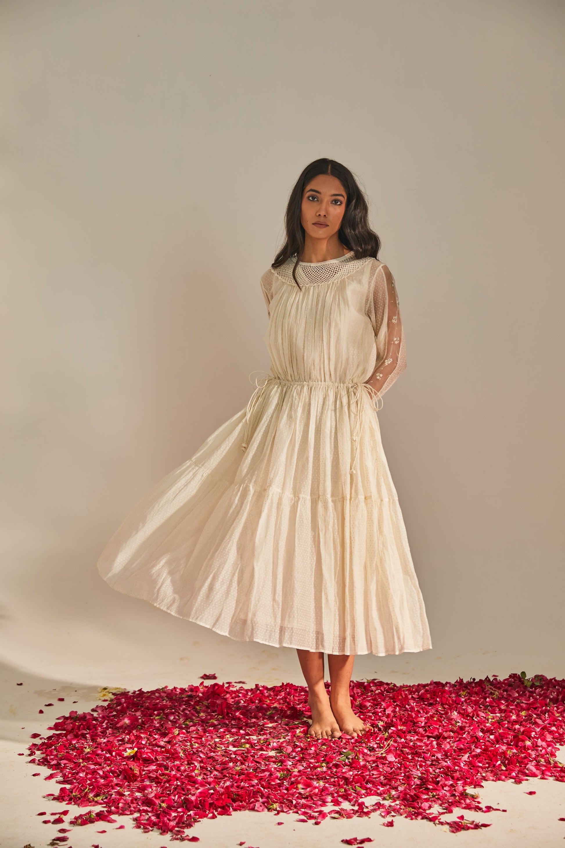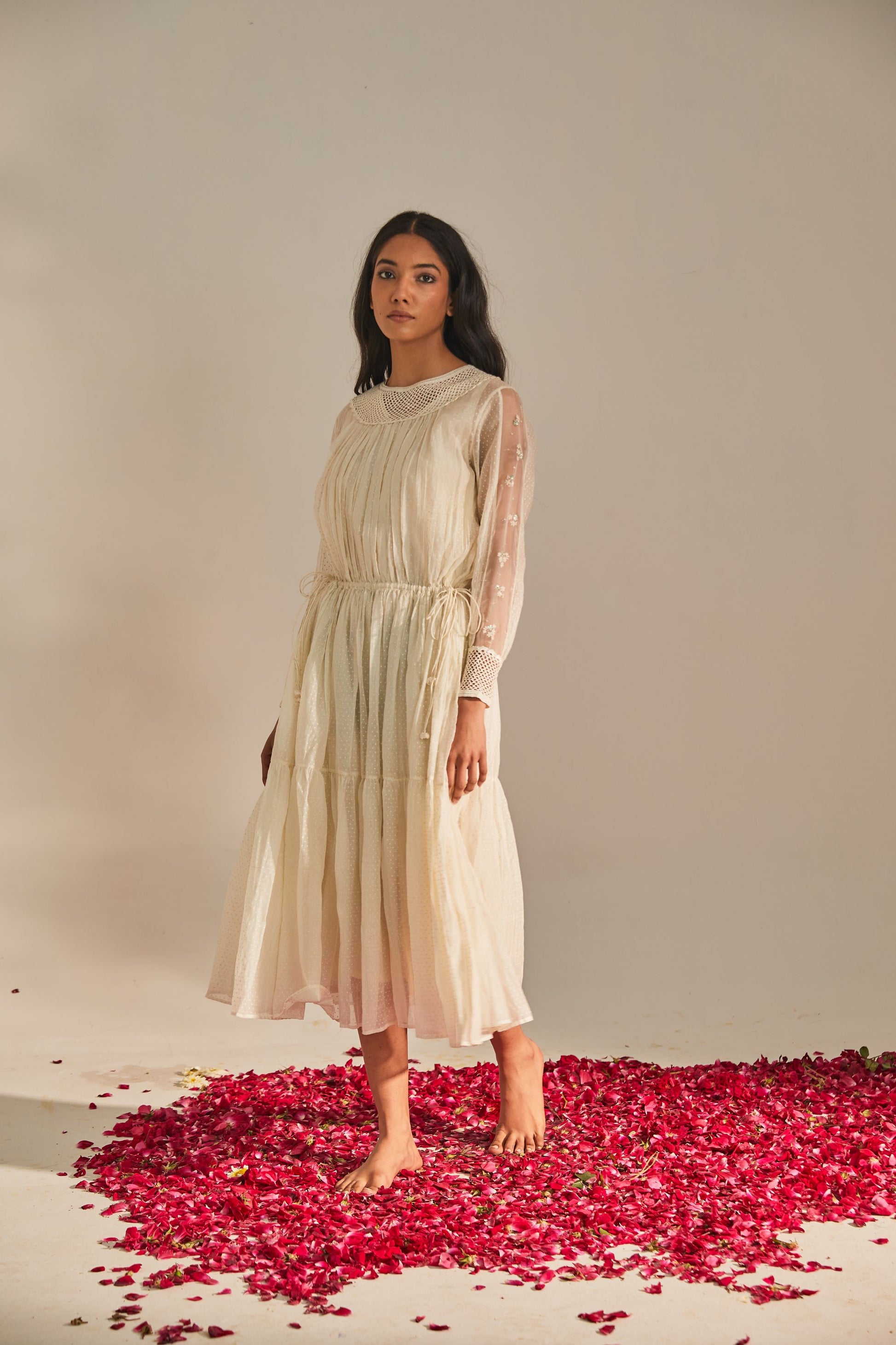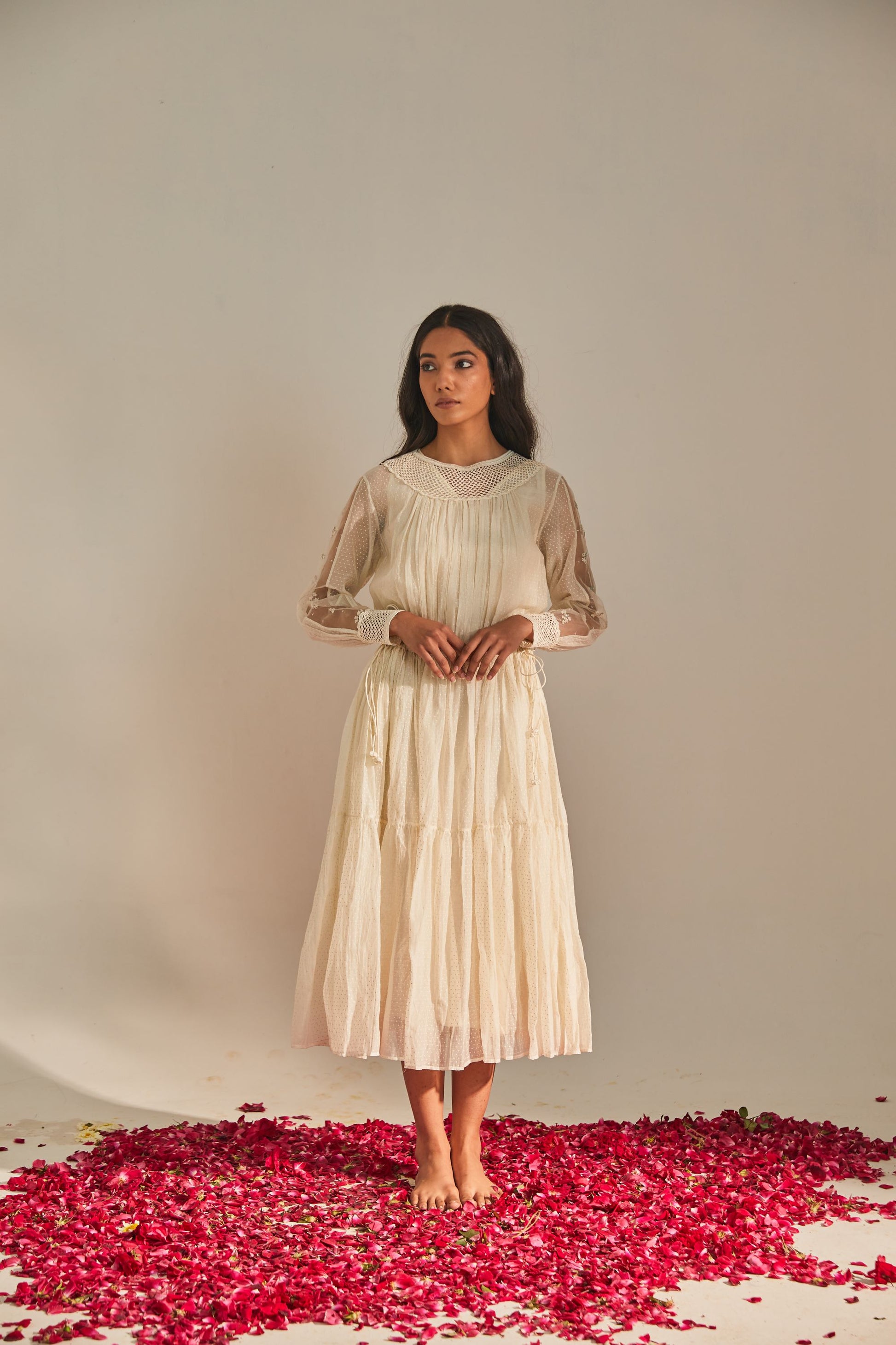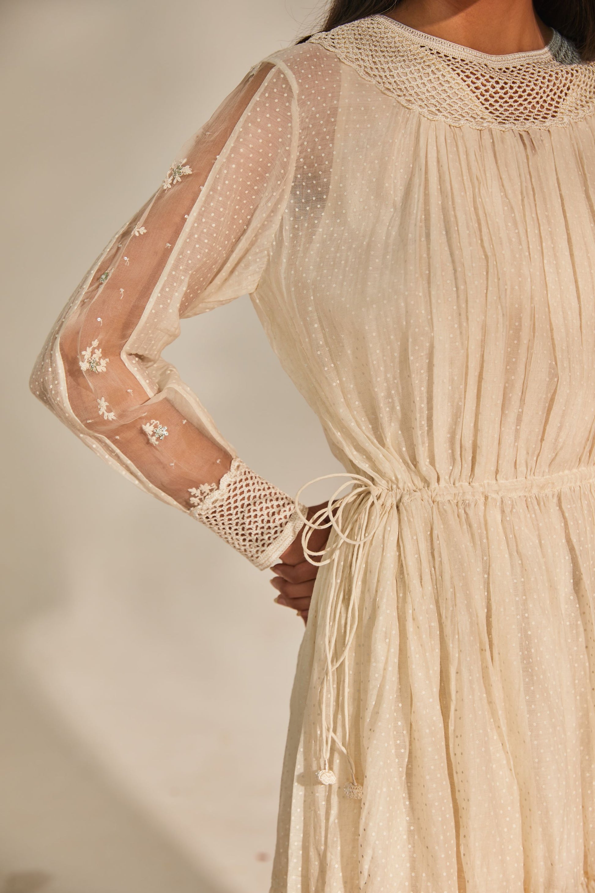 Blooming details on sleeves, hand crochet neckline and cuffs inspired by countryside dress crafted in fine handloom chanderi.