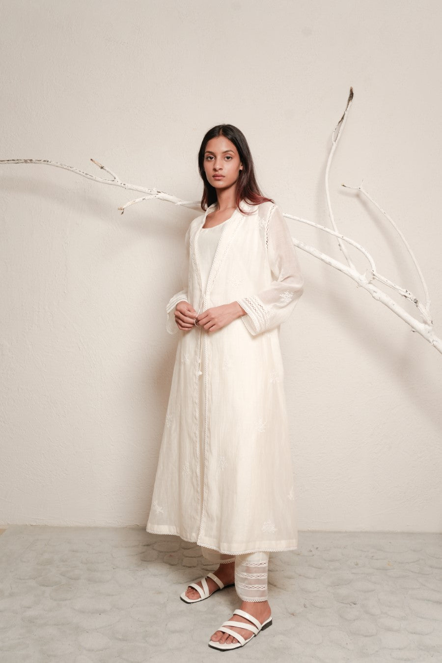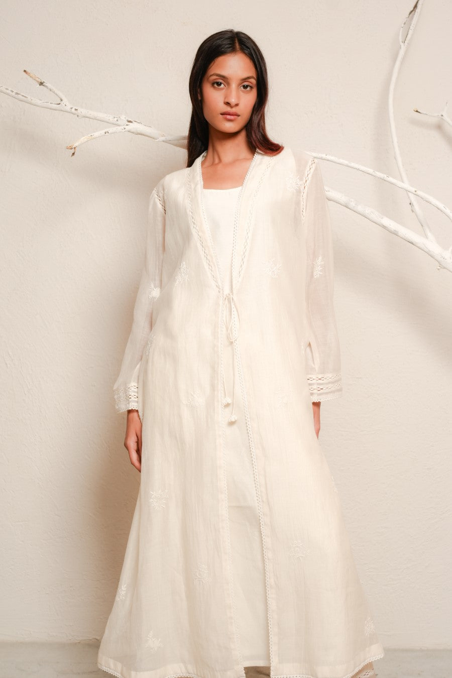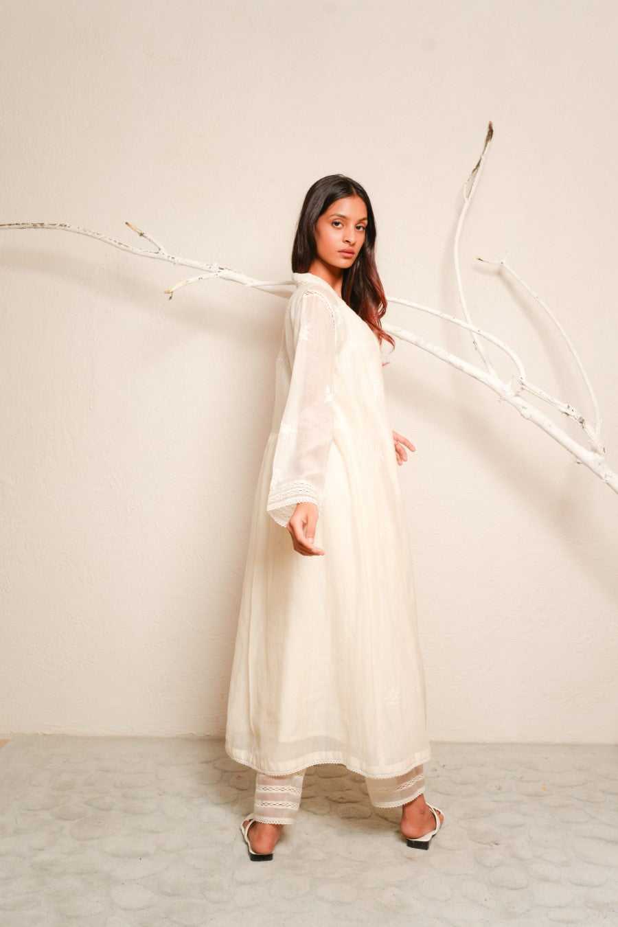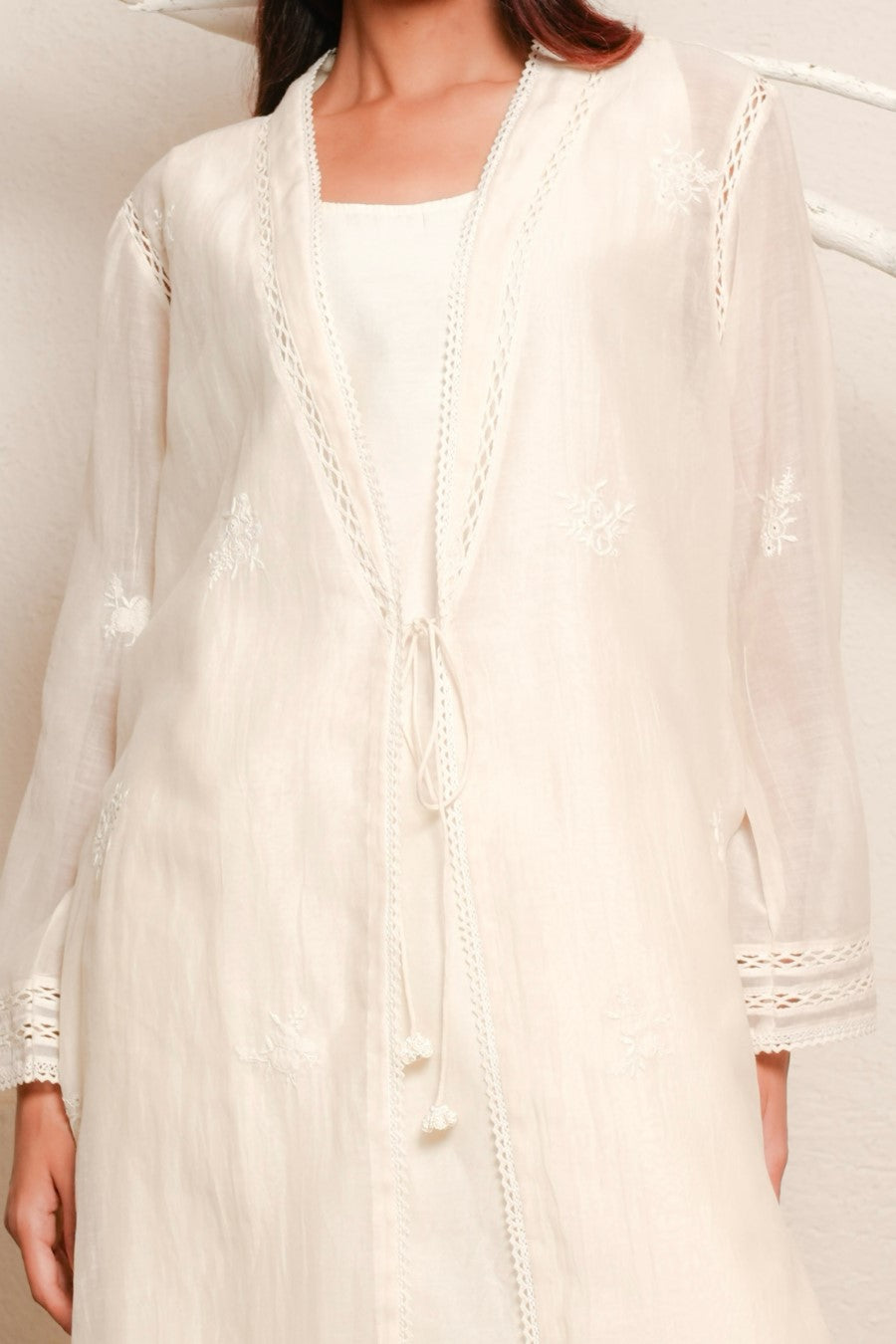 Overlay dress paired with trouser, fabric - fine chanderi, embroidery - chikankari, detailed with lace and hand crochet tassels.