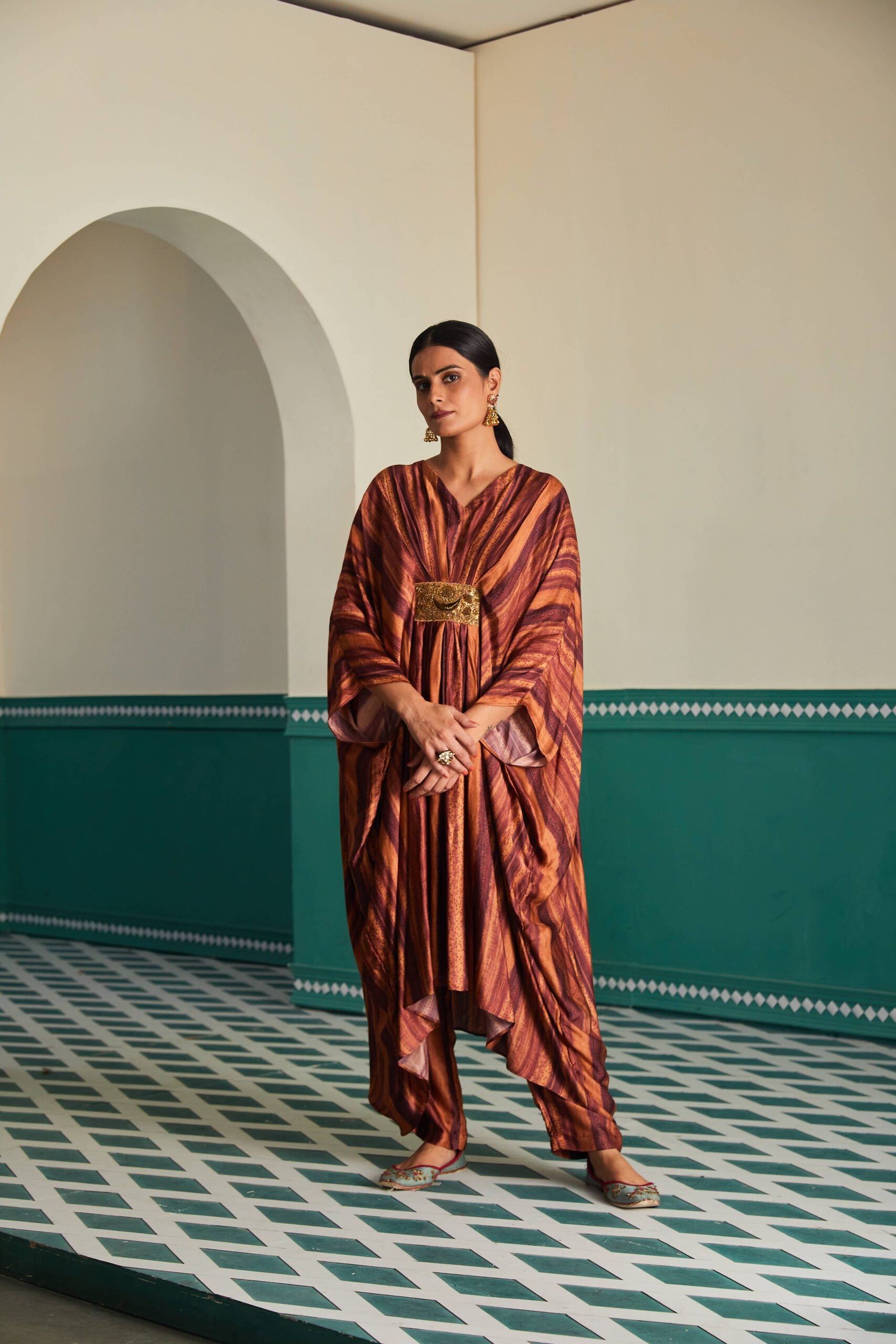 A stylish Printed Shirt Kaftan paired with trousers adorned with Zardosi embroidery at the waist.