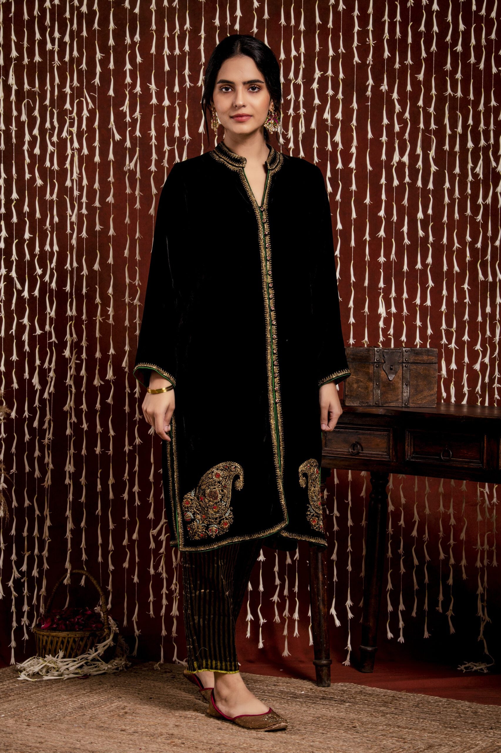 Embark on a journey into the depths of refined sophistication with our black silk velvet short jacket. It embodies the essence of the night, its velvety texture reminiscent of midnight skies. Intricate dori and dapka work, akin to shimmering constellations, adorn the jacket, while exquisite paisley motifs cascade along the kurta hem and back, evoking a sense of celestial opulence. Paired seamlessly with stripe tissue trousers, this ensemble epitomizes the artistry of timeless allure.
