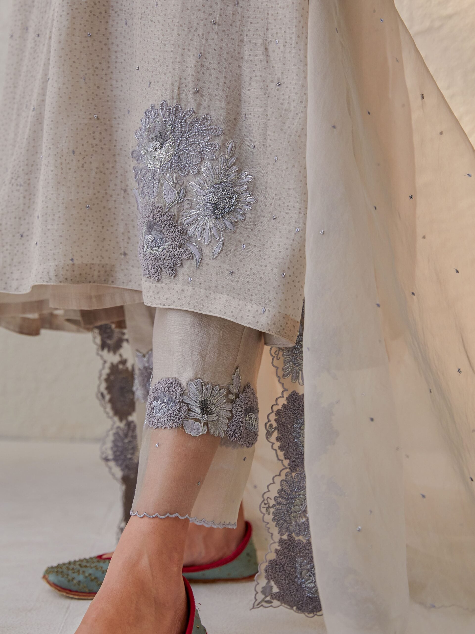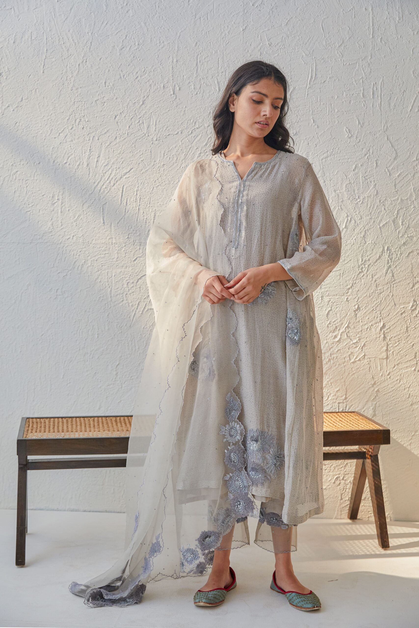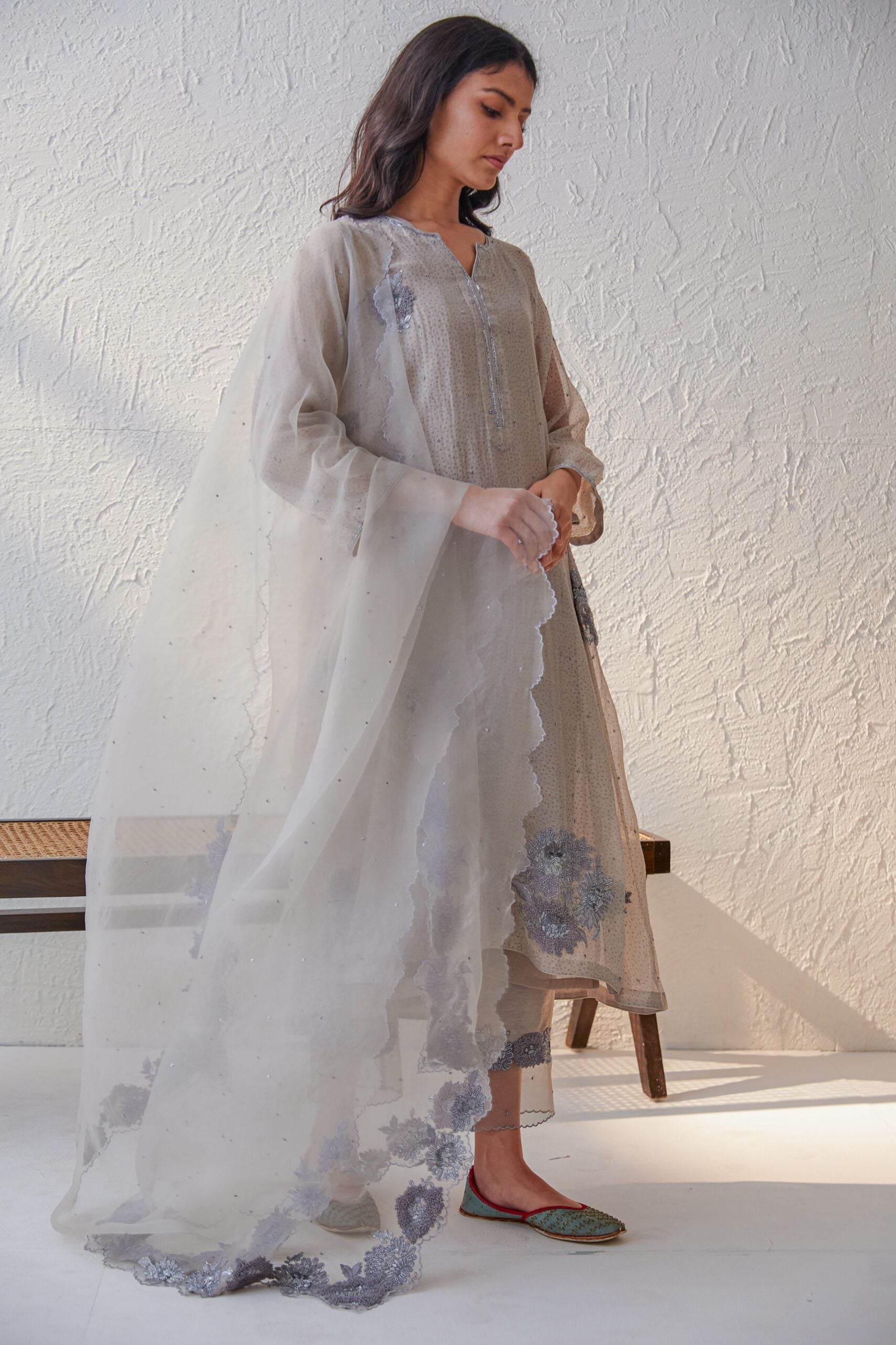 Like a gentle mist, the grey A-line princess cut kurta in fine chanderi weaves an enchanting spell. Paired with trousers and adorned with delicate details of dori, threaded whispers, and gleaming sequins, it tells a story of timeless elegance. The silk organza dupatta adds a touch of ethereal beauty.