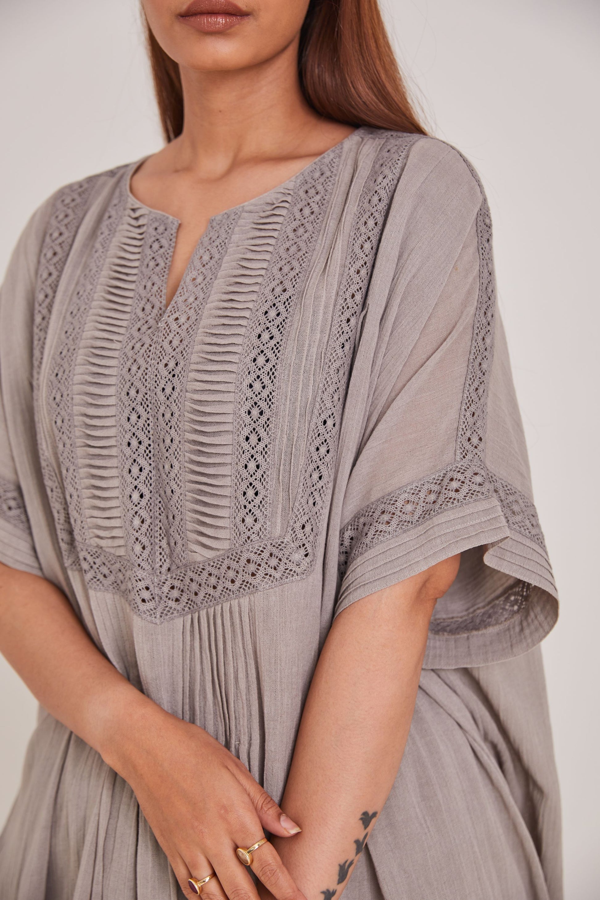 For a day of slow living, bringing a cord kaftan with plates and lace detailed.