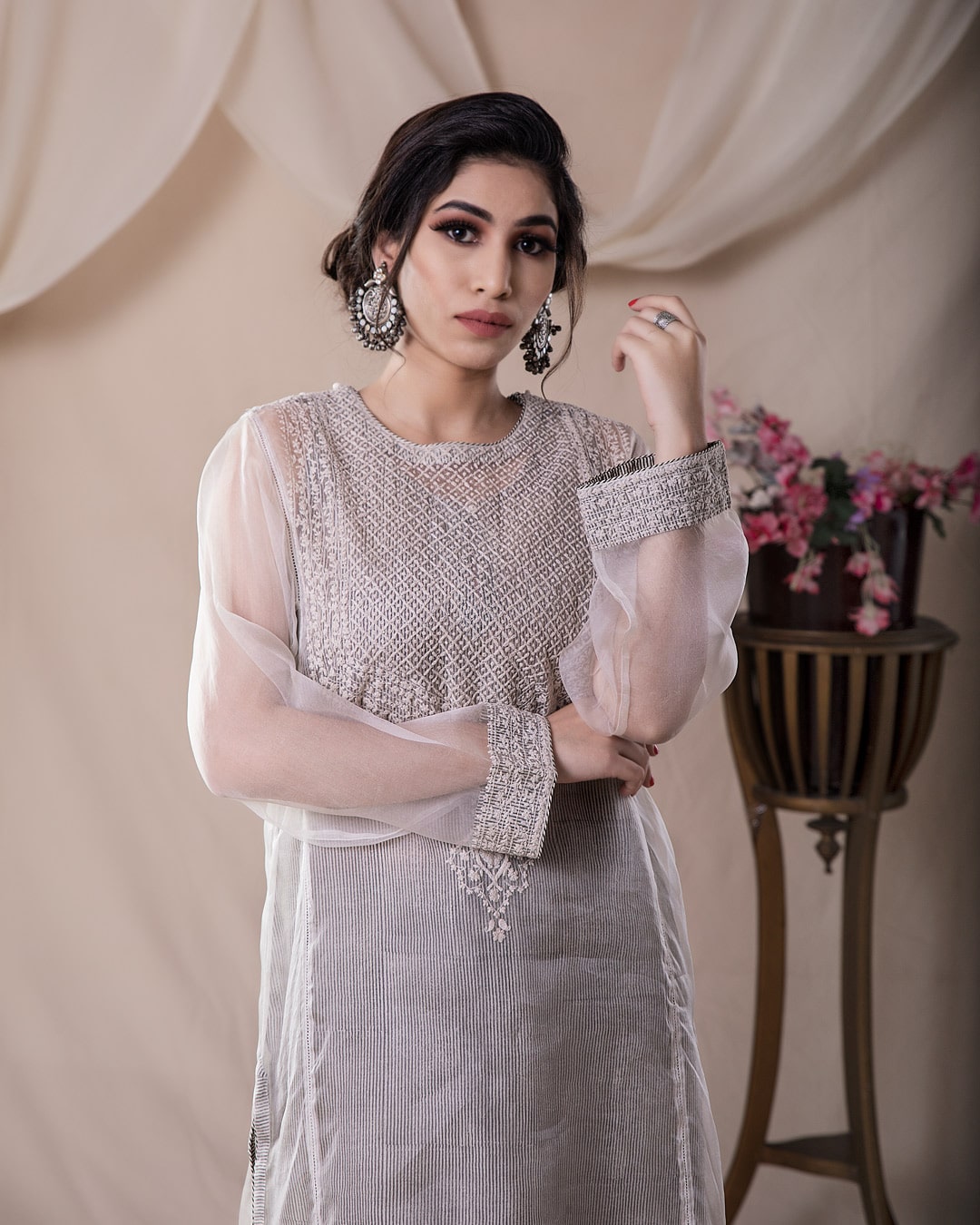 Picture yourself in this silk organza kalidar kurta. It is a soft autumn afternoon. You decide to visit a vintage cafe. As you step in, Rafi’s voice serenades you, whispering, “Chaudhvi ka Chaand Ho Ya Aftaab Ho? (“Are you the full moon or the sun?”)
