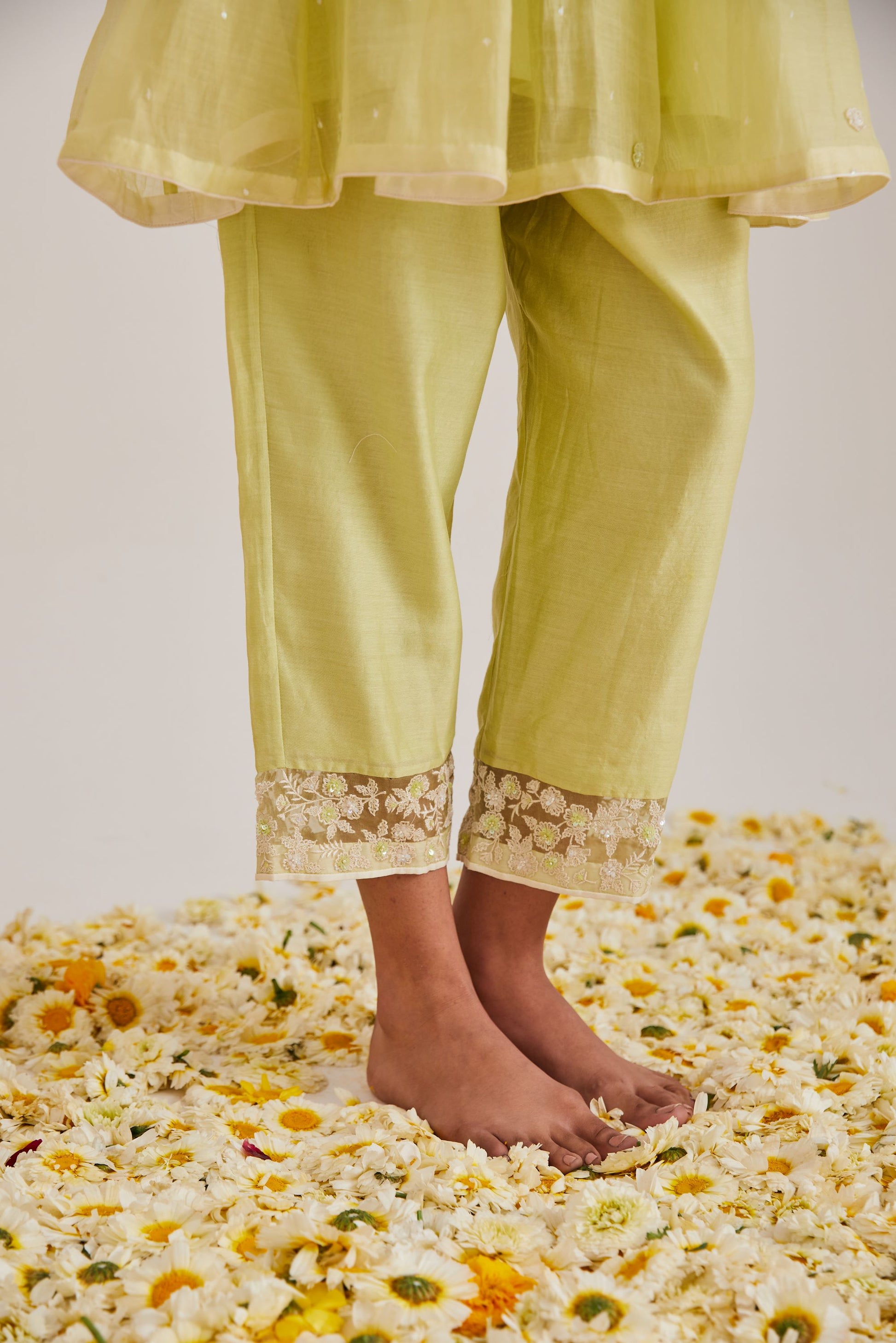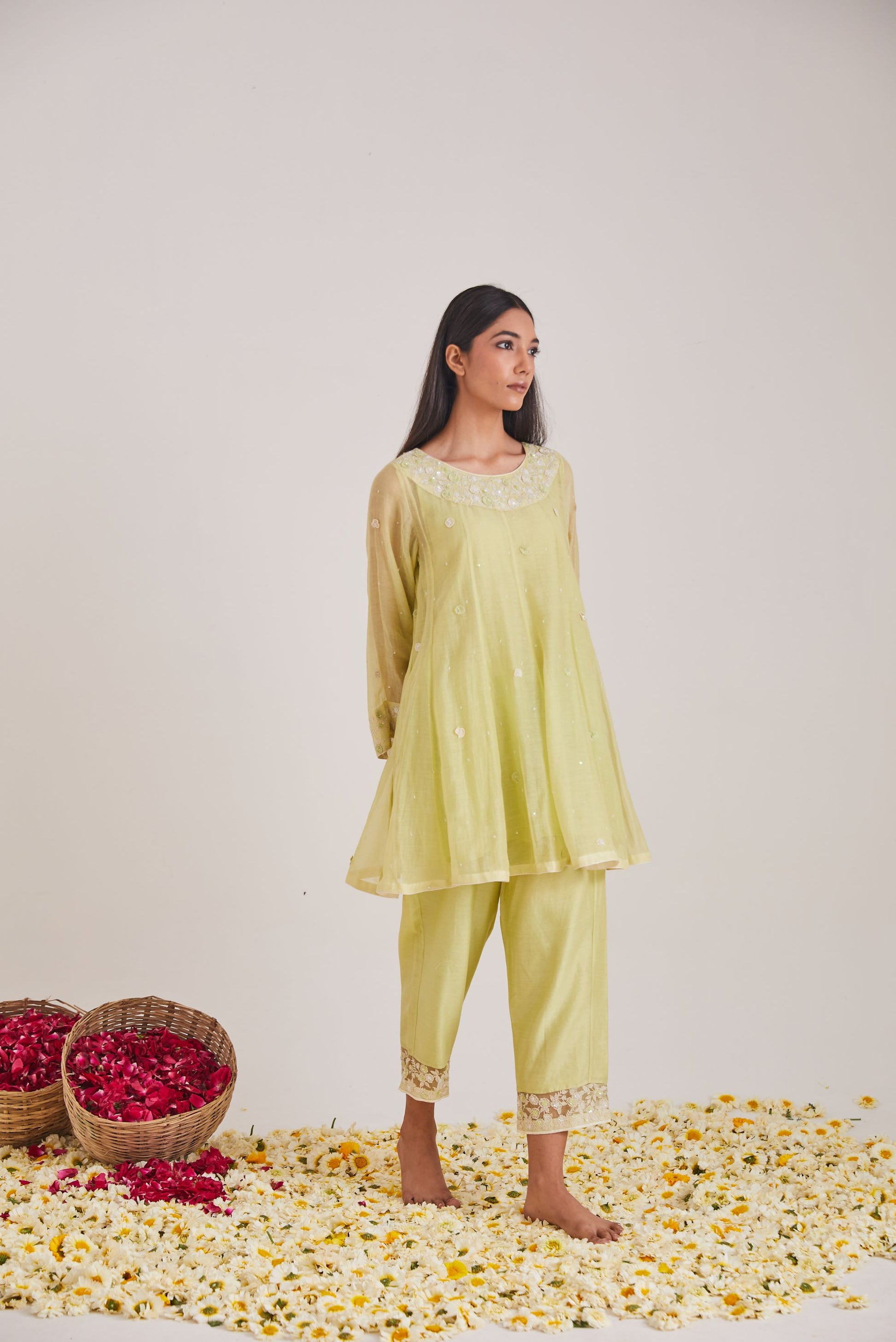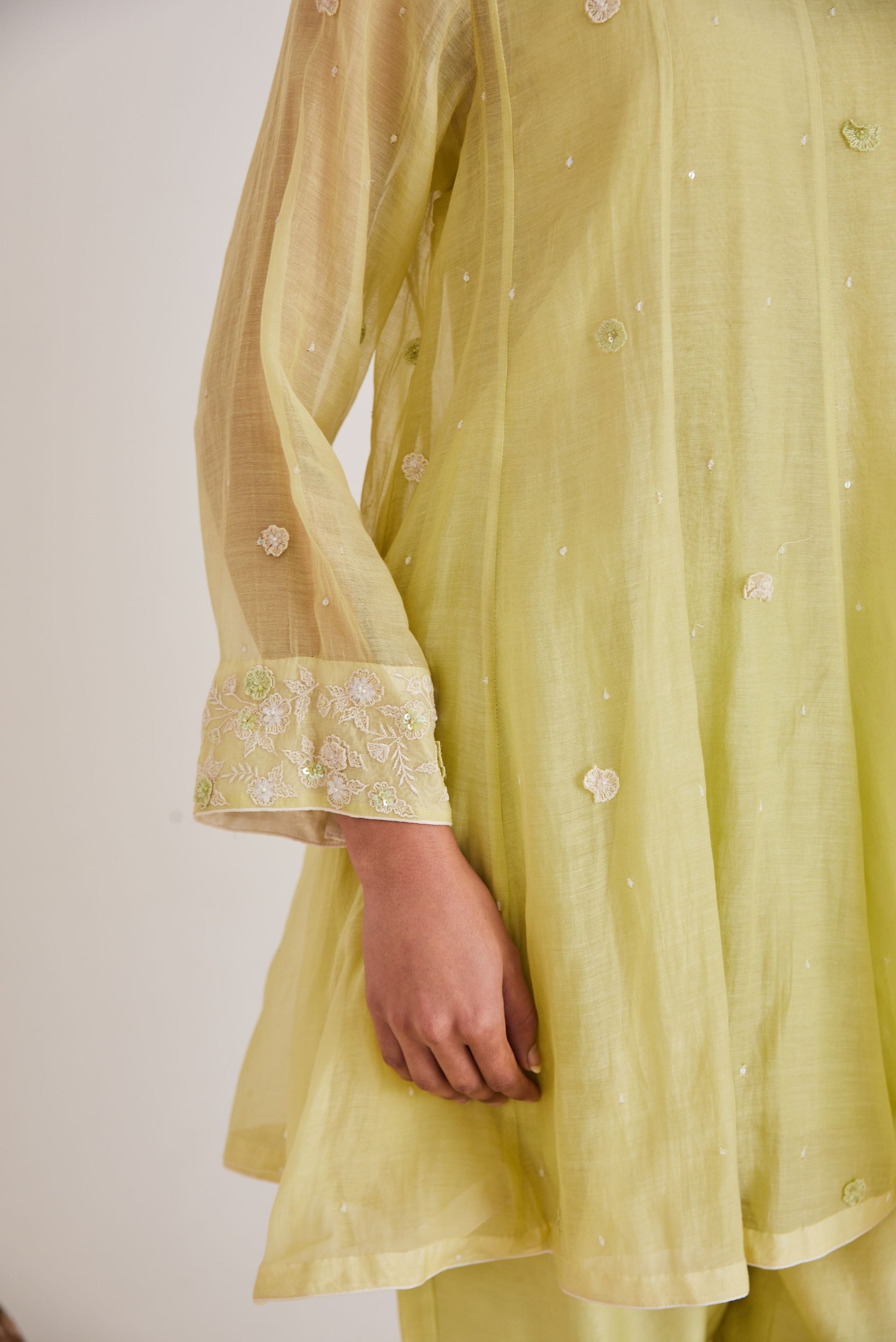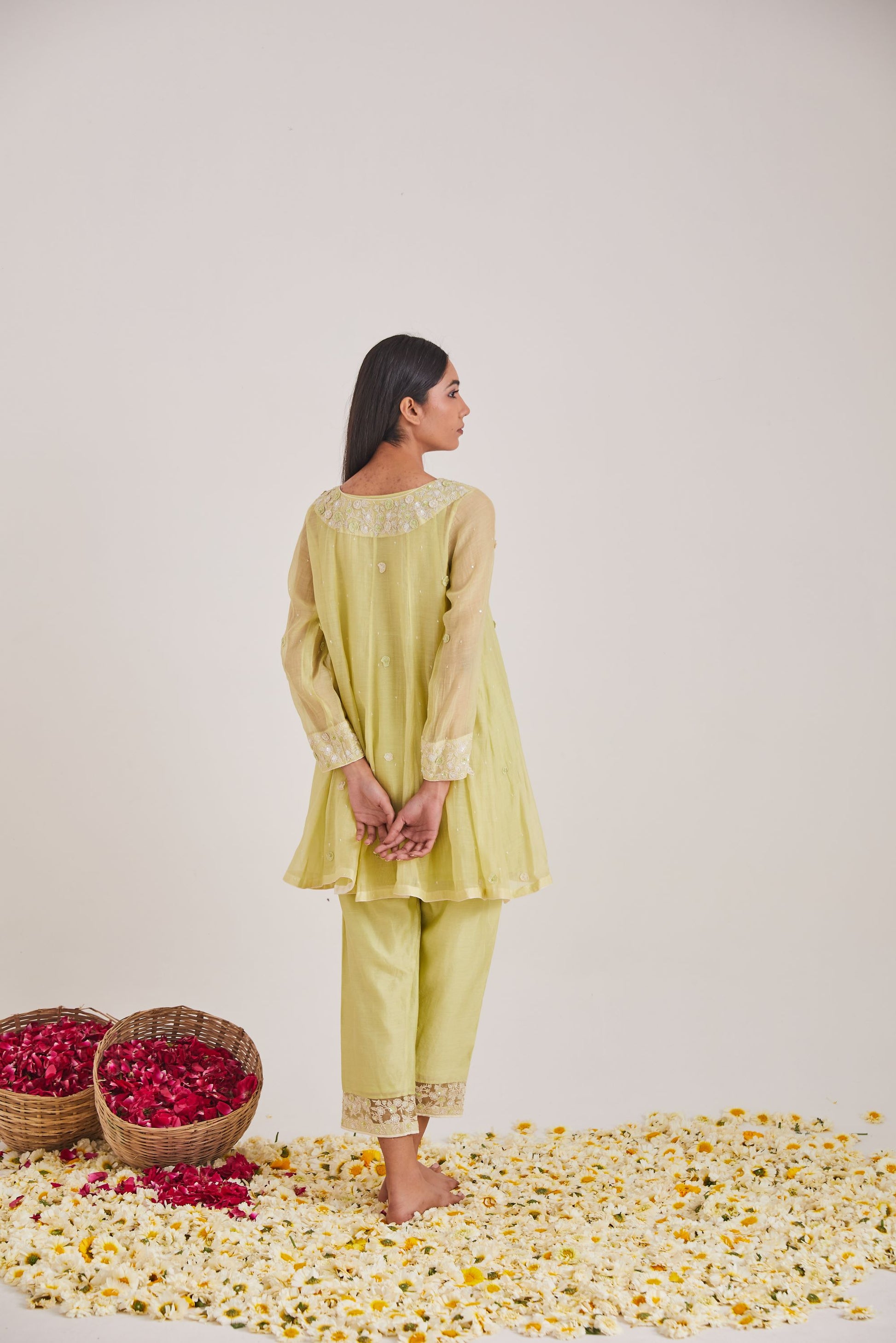 Sun kissed blooming garden that inspires this outfit in fine handloom chanderi with embroidered flower details.