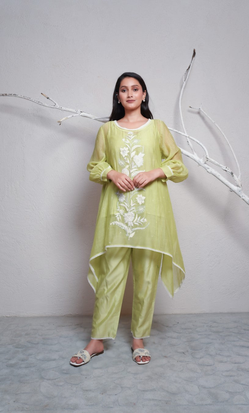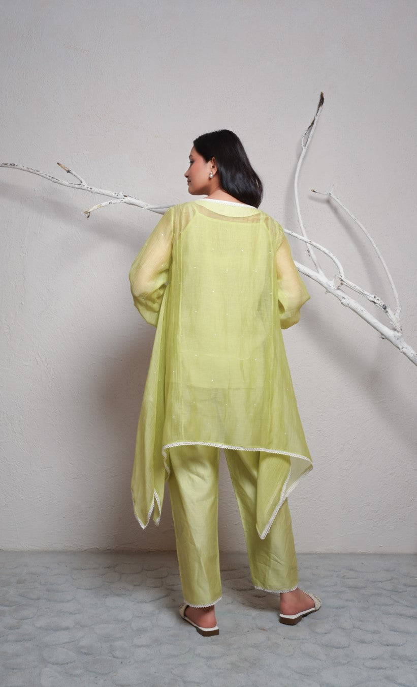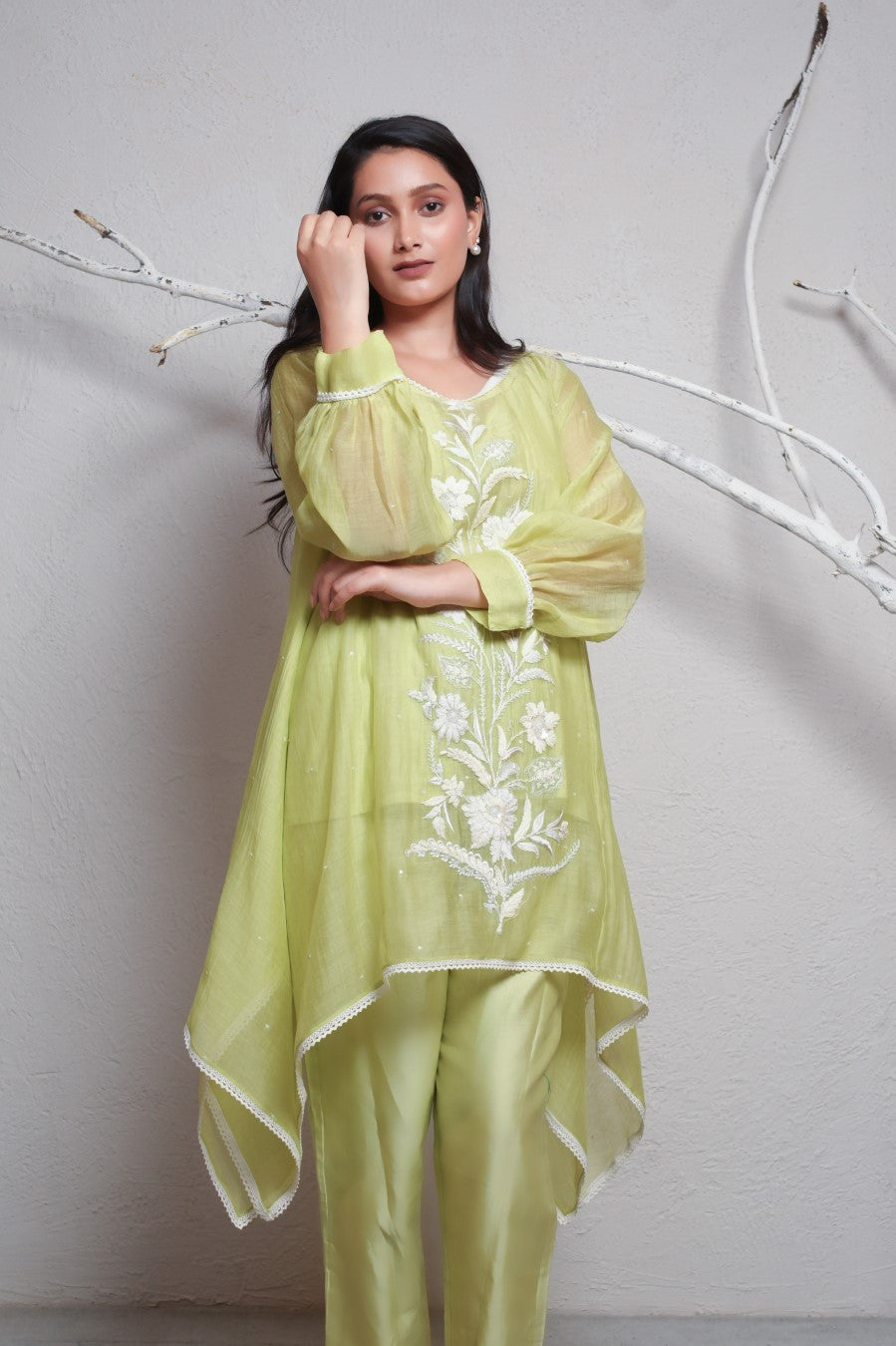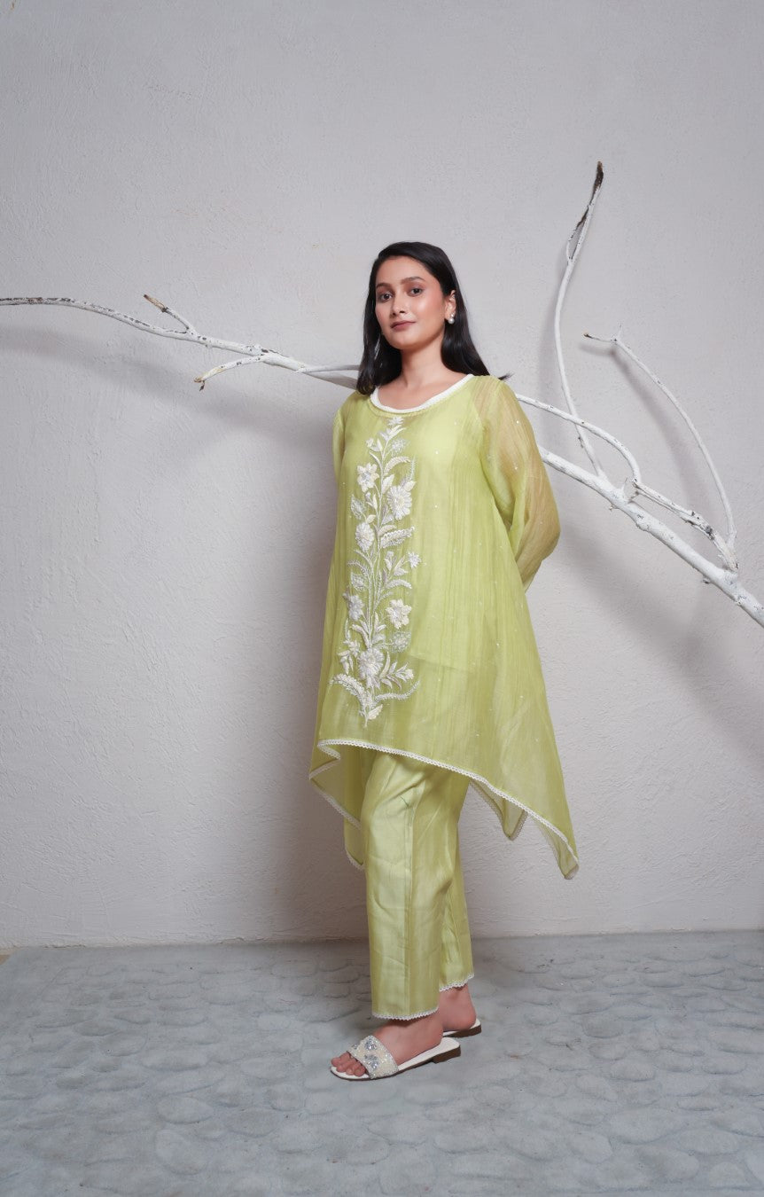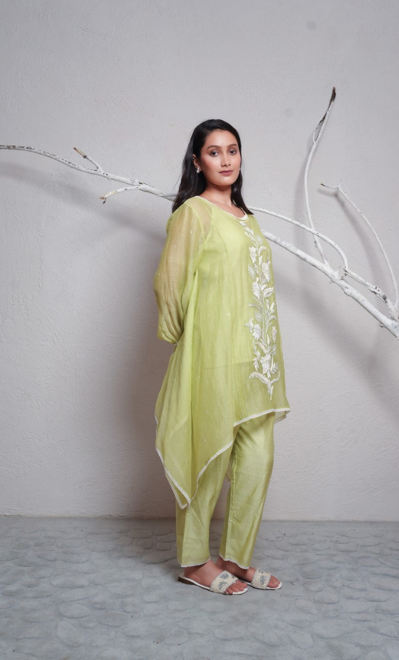 Light green fusion wear cape in fine chanderi paired with silk Chanderi trousers featuring multicoloured embroidery with threads and sequins, with crotchet flower.
