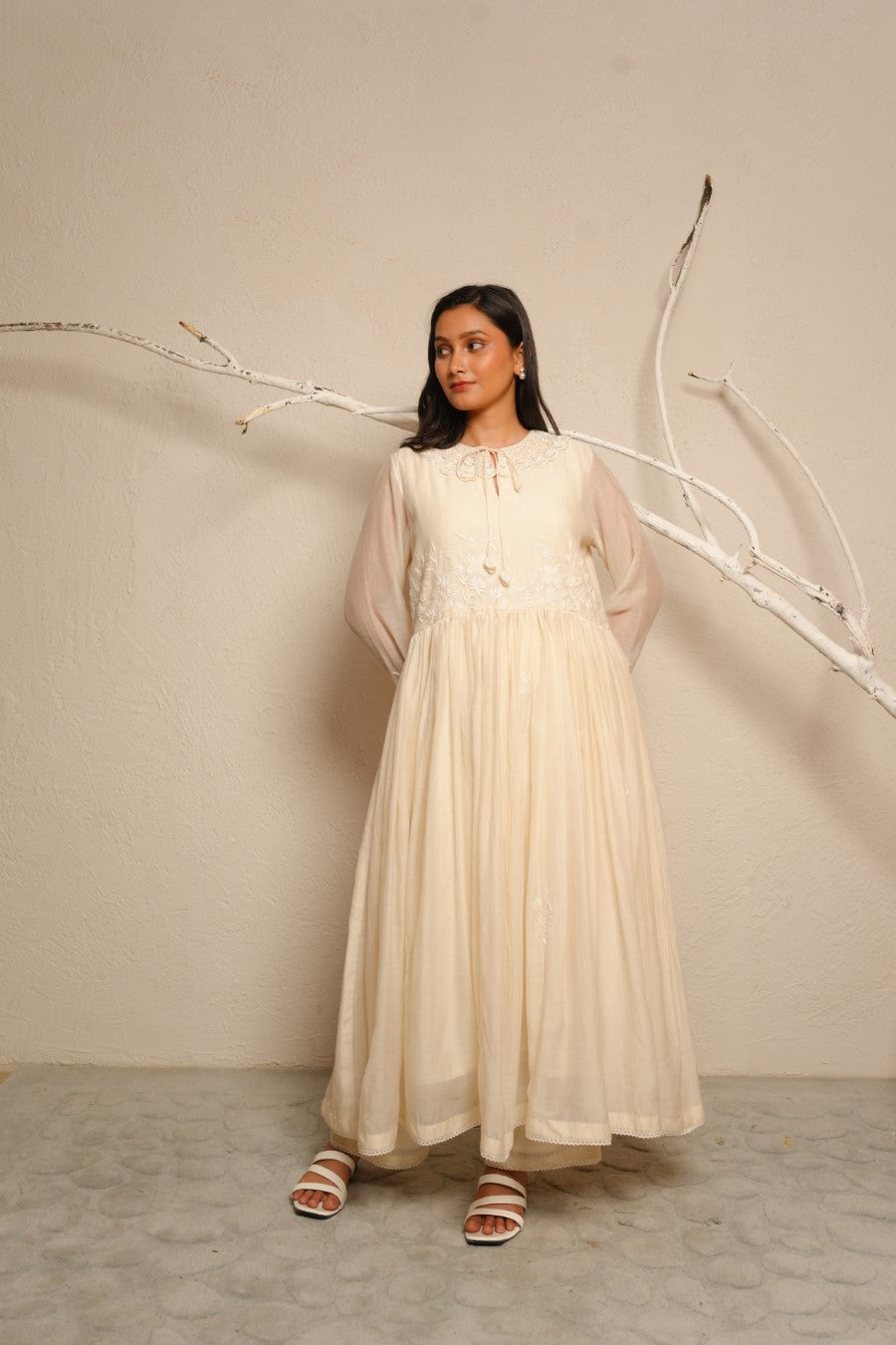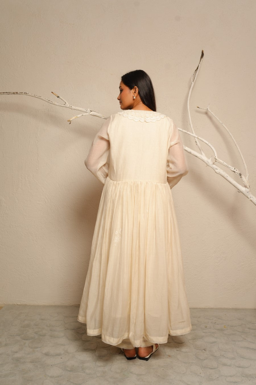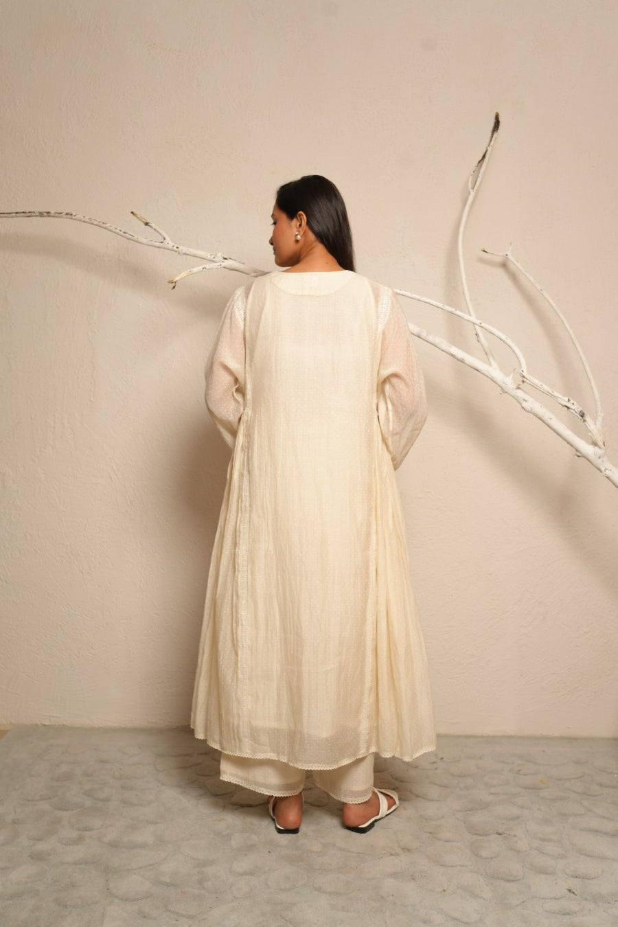 Fine chanderi dress style kurta paired with chanderi trousers, featuring chikankari work detailed with hand crochet collar and tassels.
