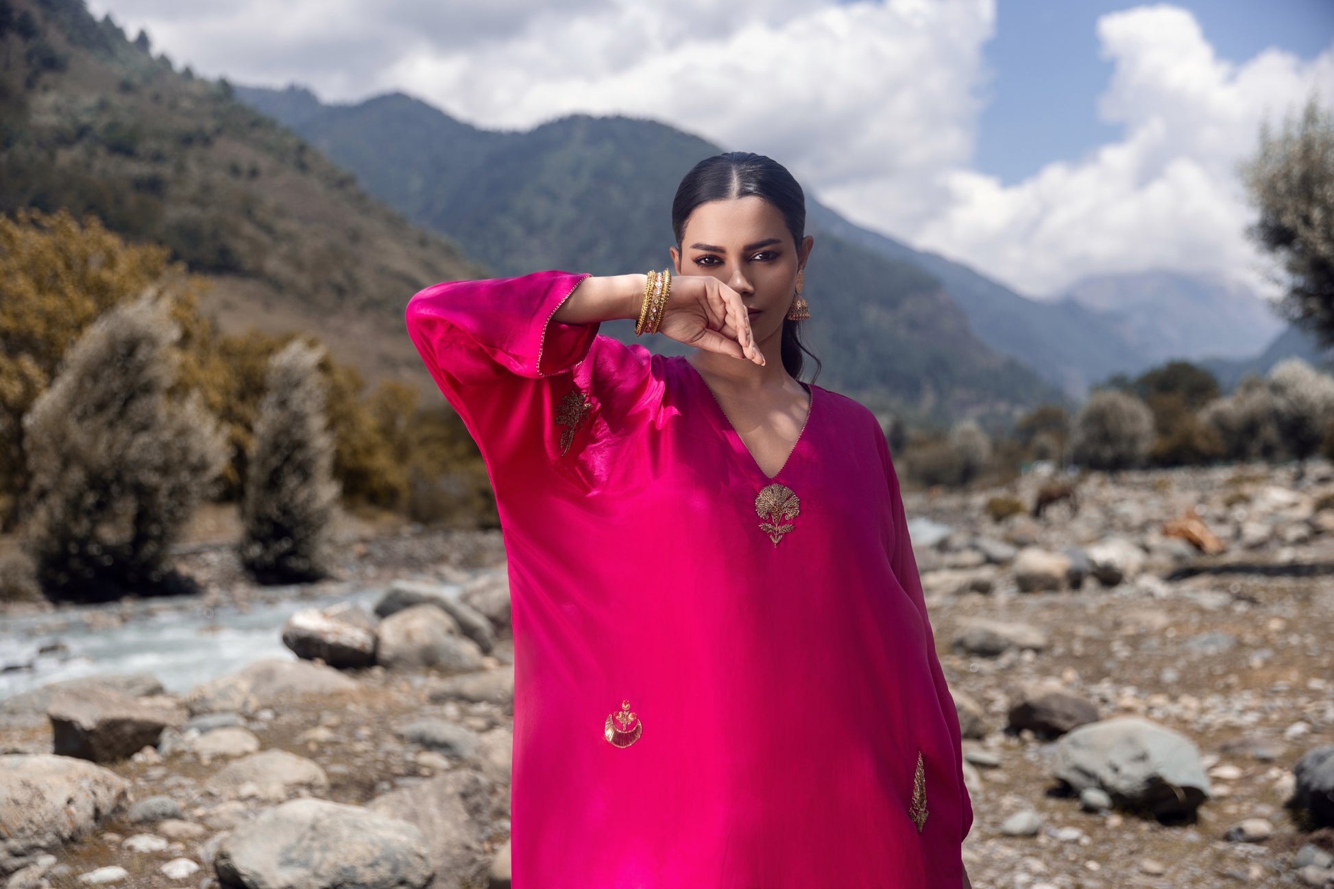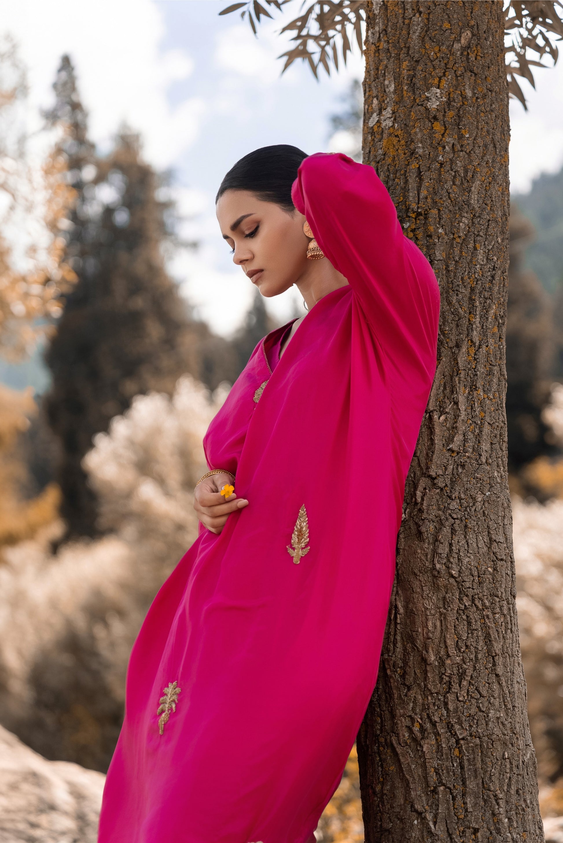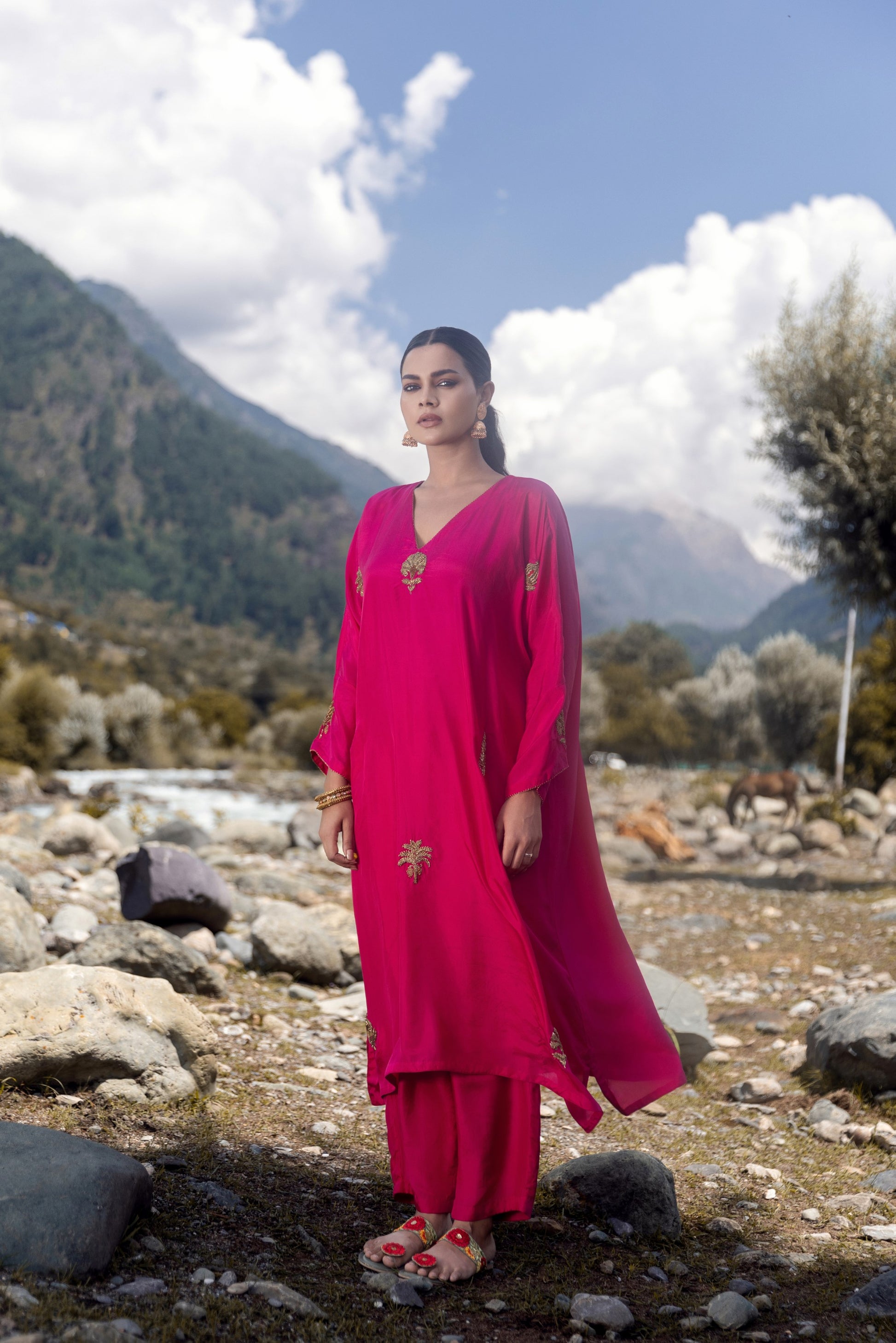 A silk kaftan kurta paired with pants showcasing motifs of Cypress trees, palm trees, and moons intricately crafted with zardozi embroidery.
