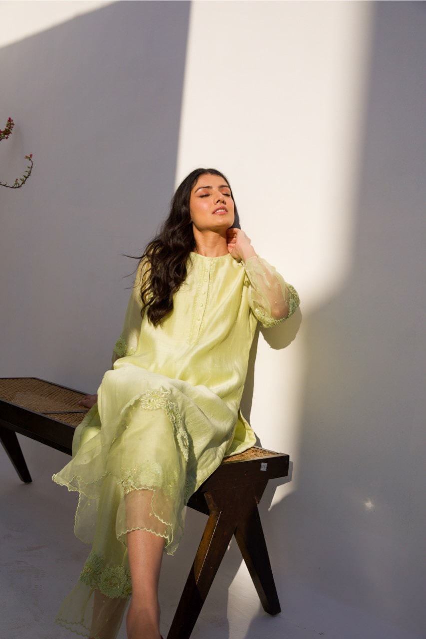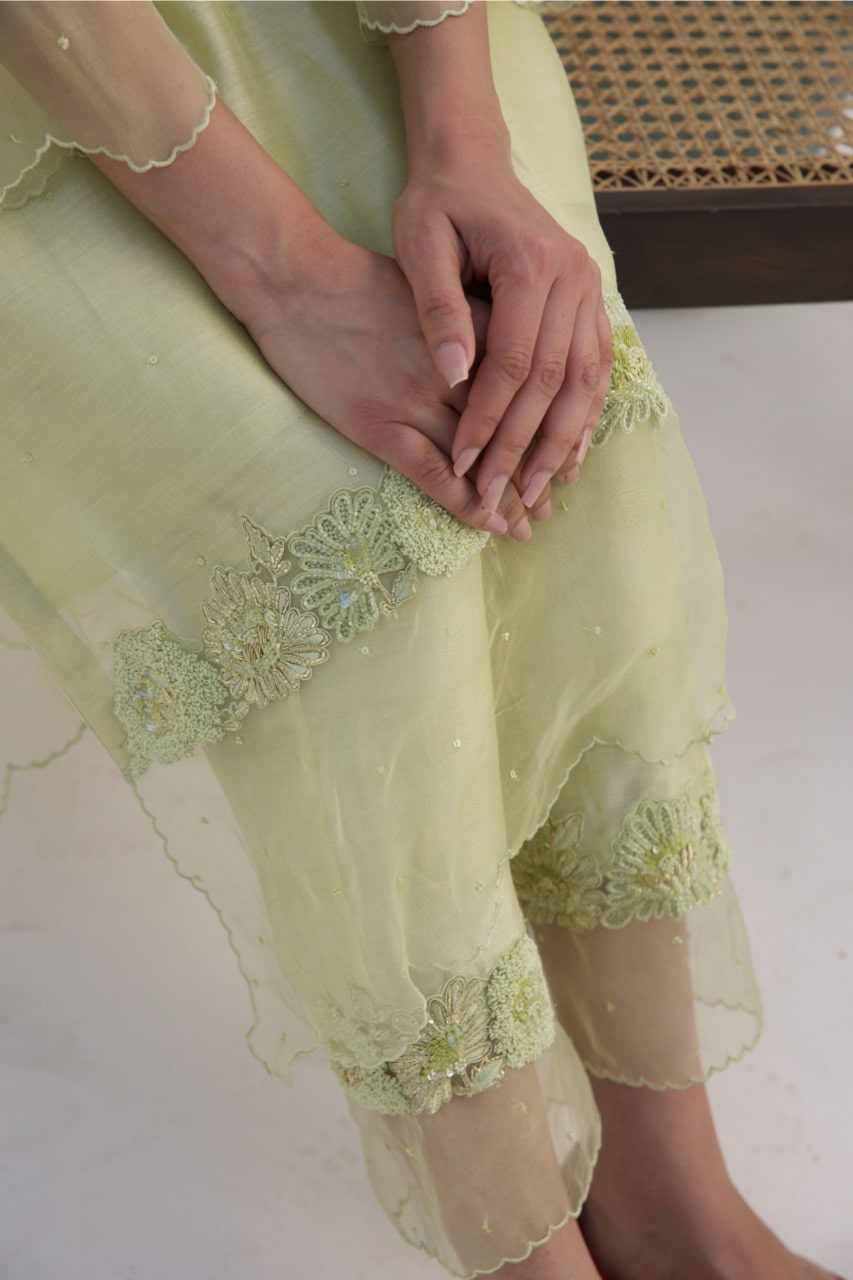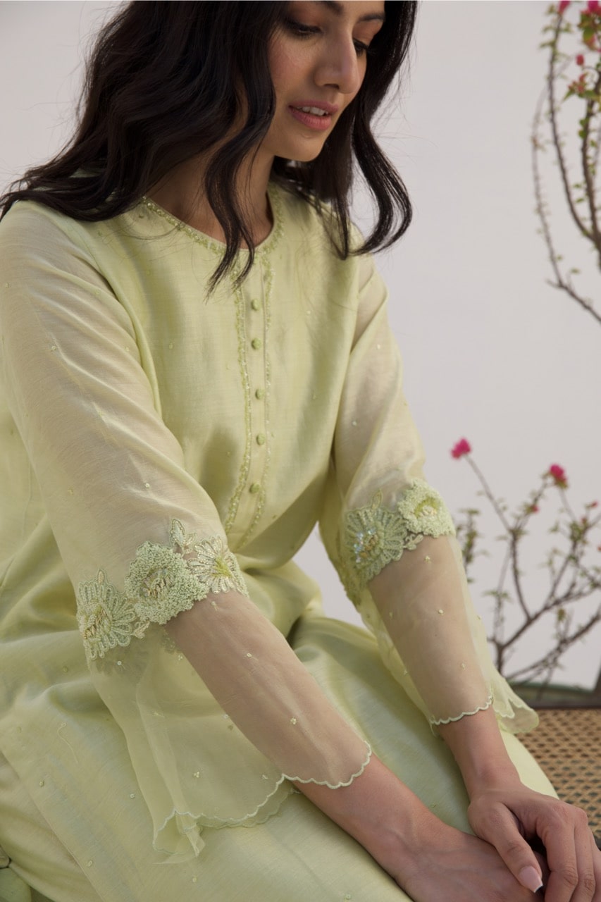 Chanderi lime green kurta set paired with silk organza dupatta enhanced with dori , thread work and sequins.