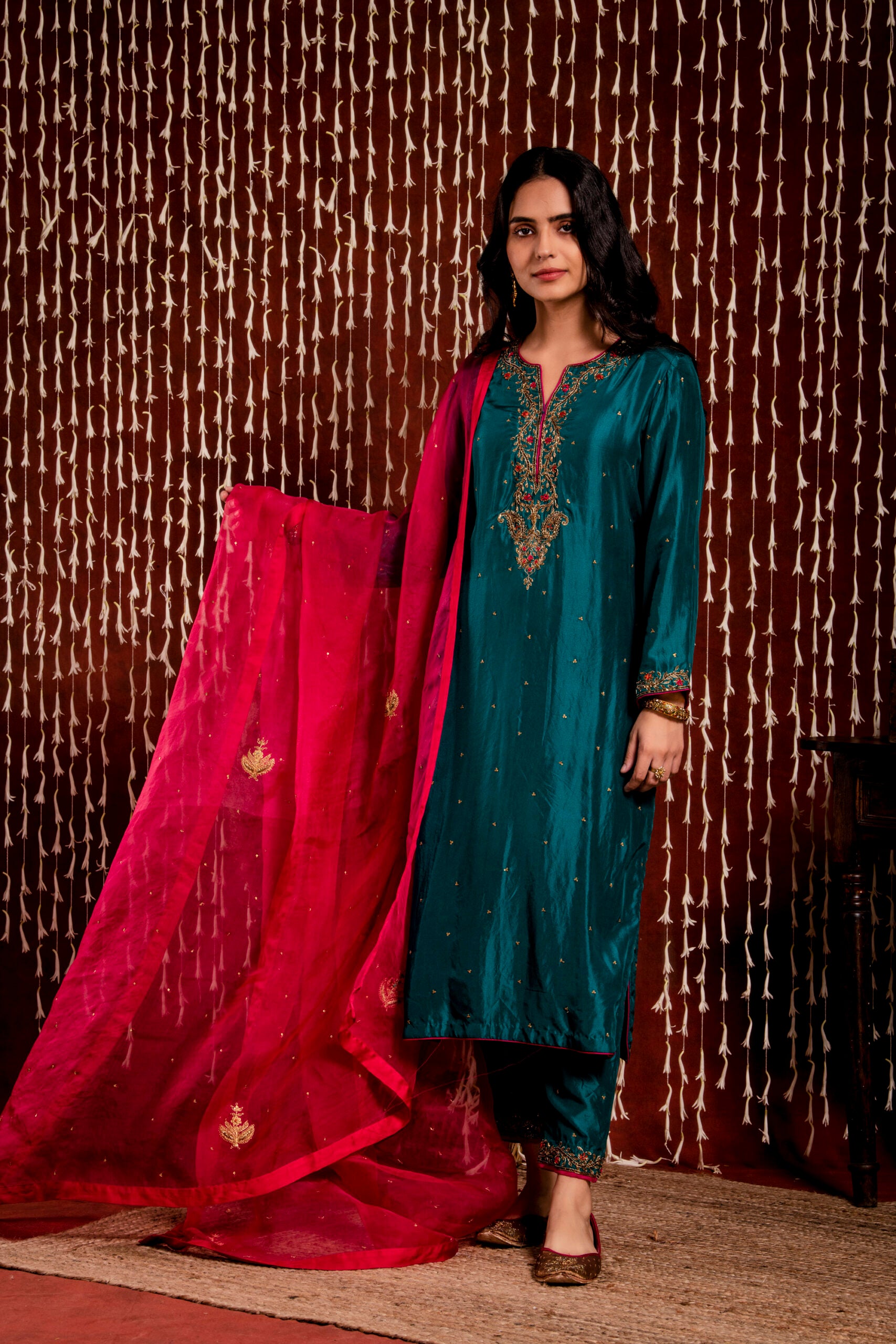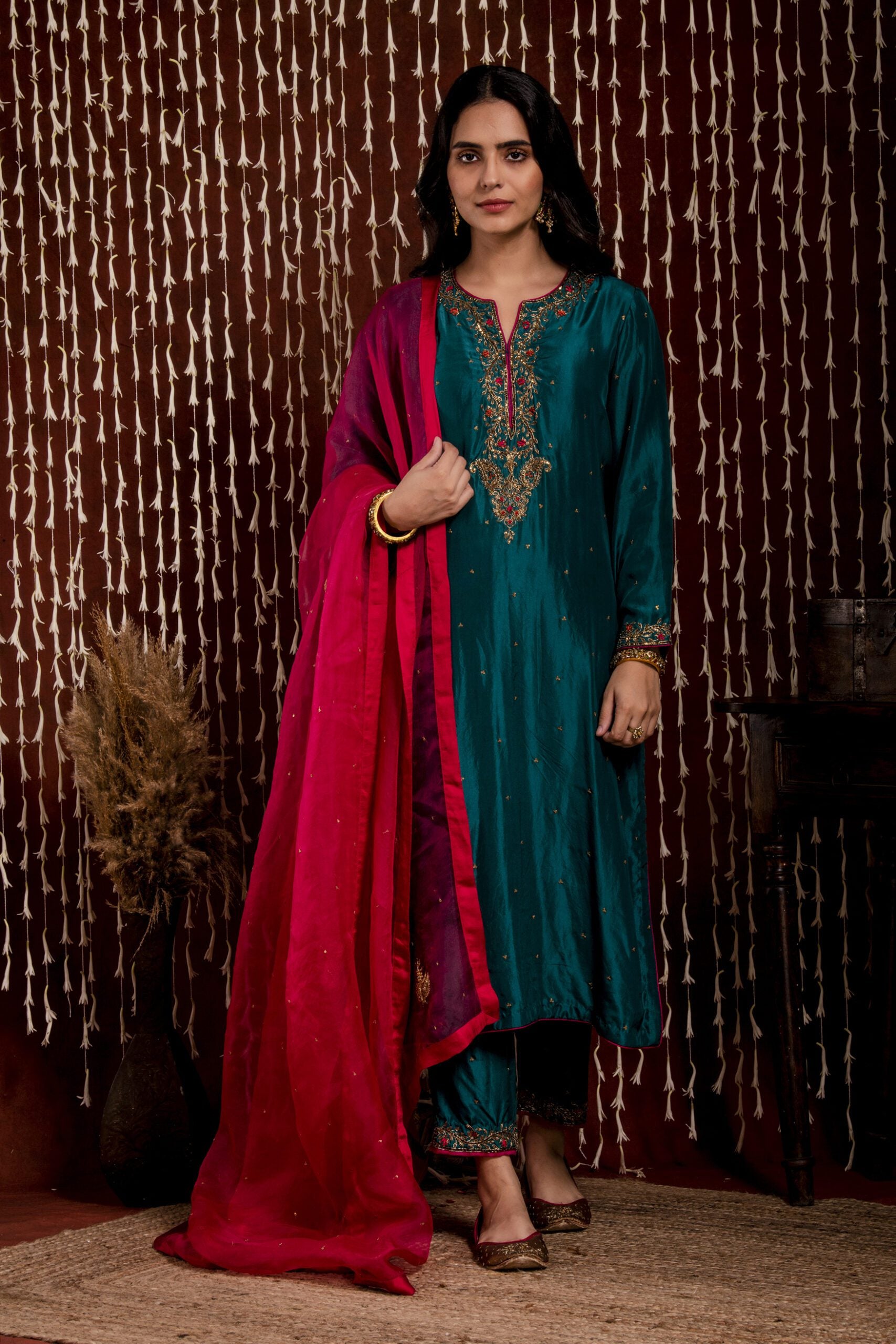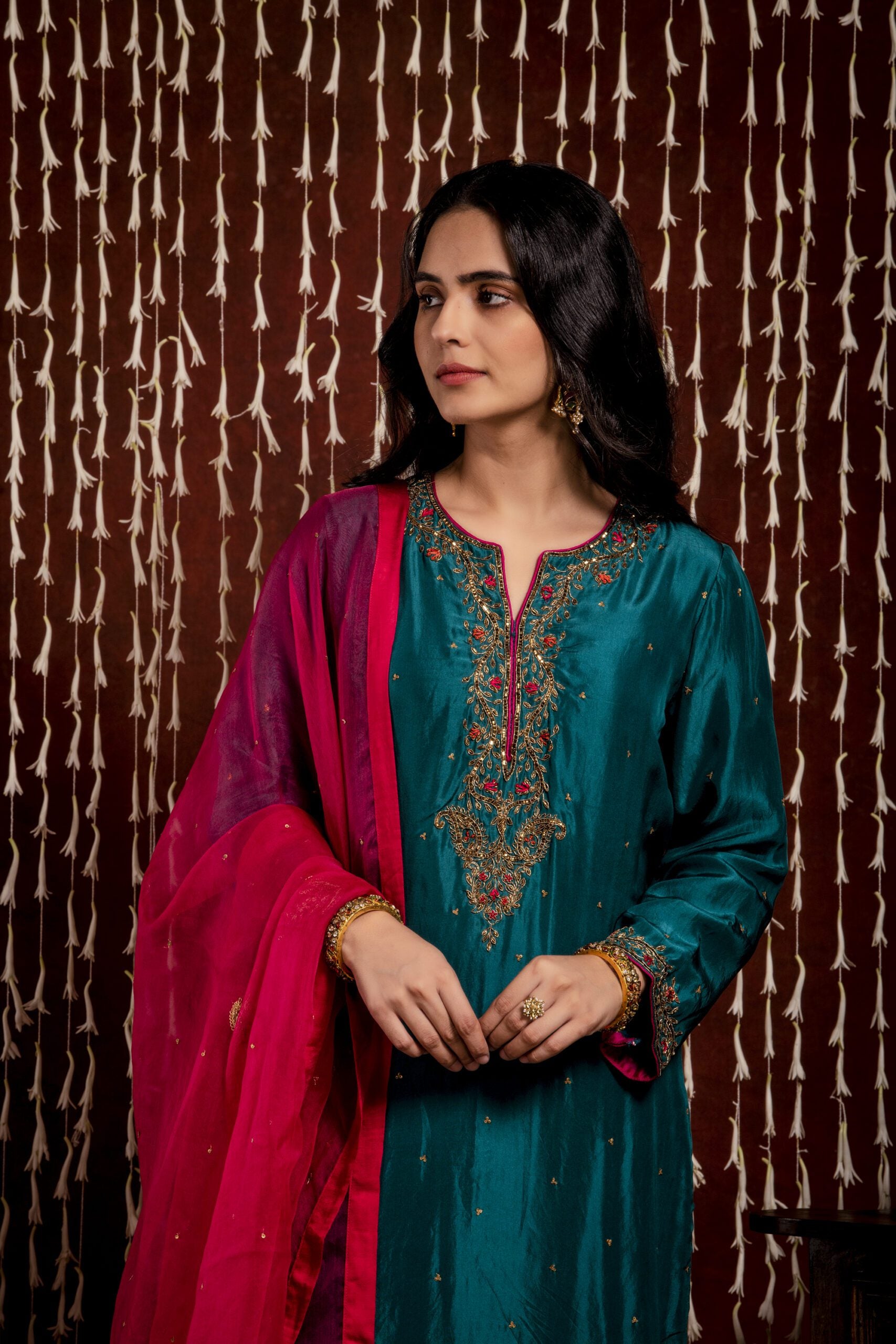Teal color silk kurta and trousers features zardosi work on neck and cuffs paired with silk organza dupatta.