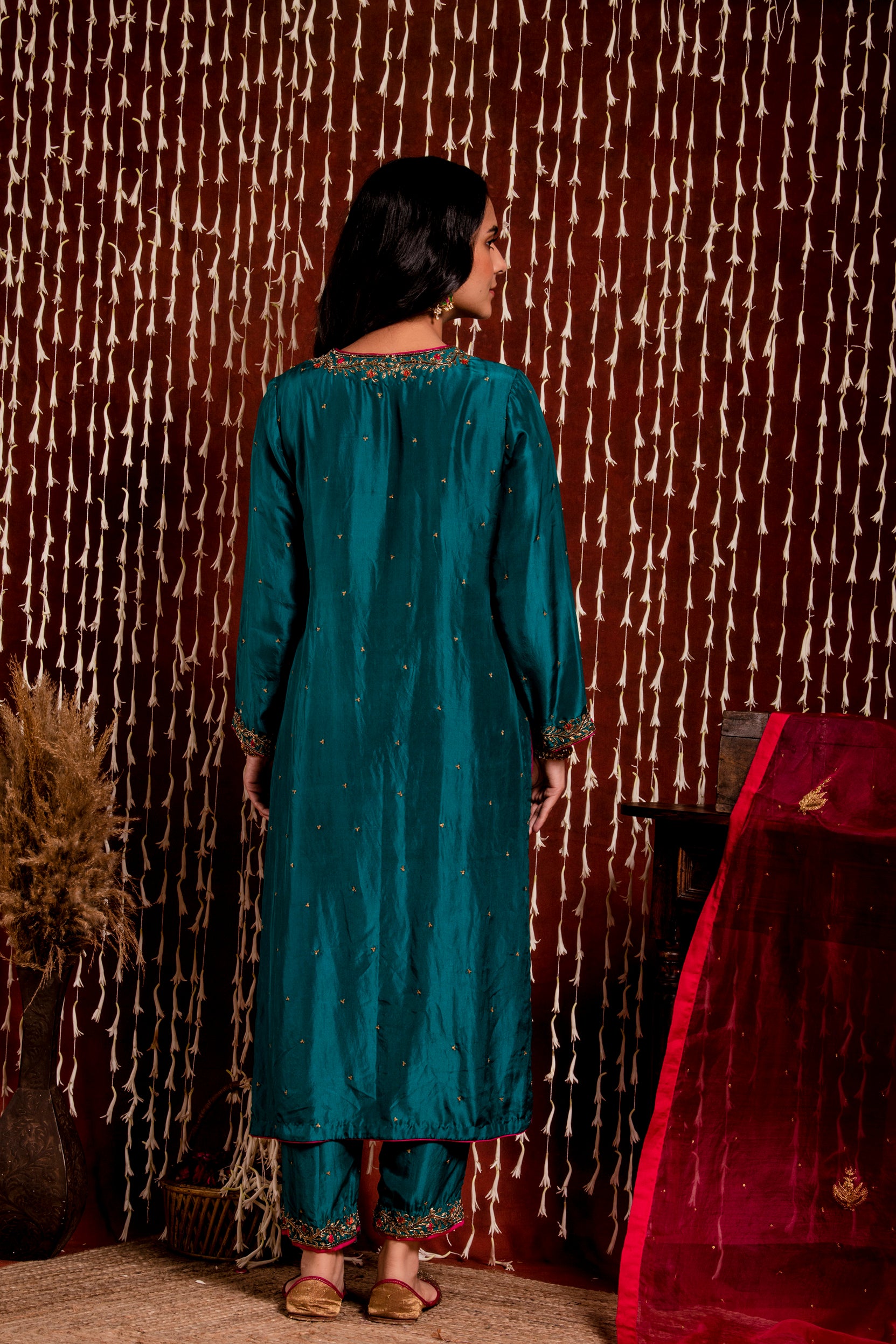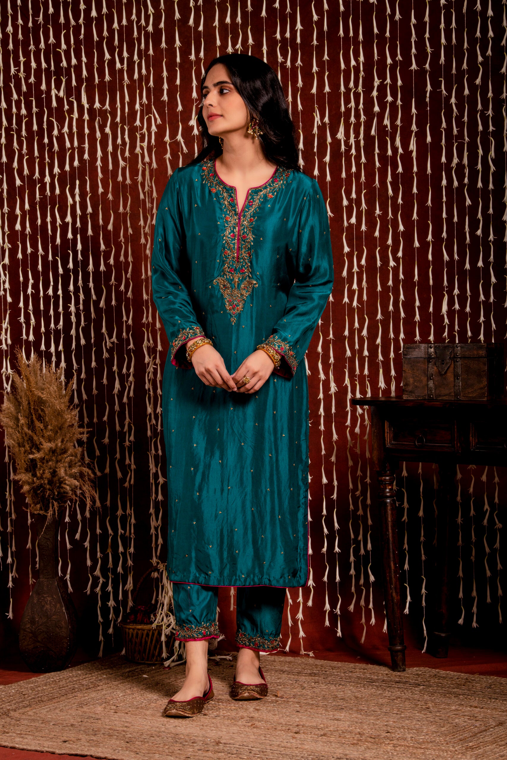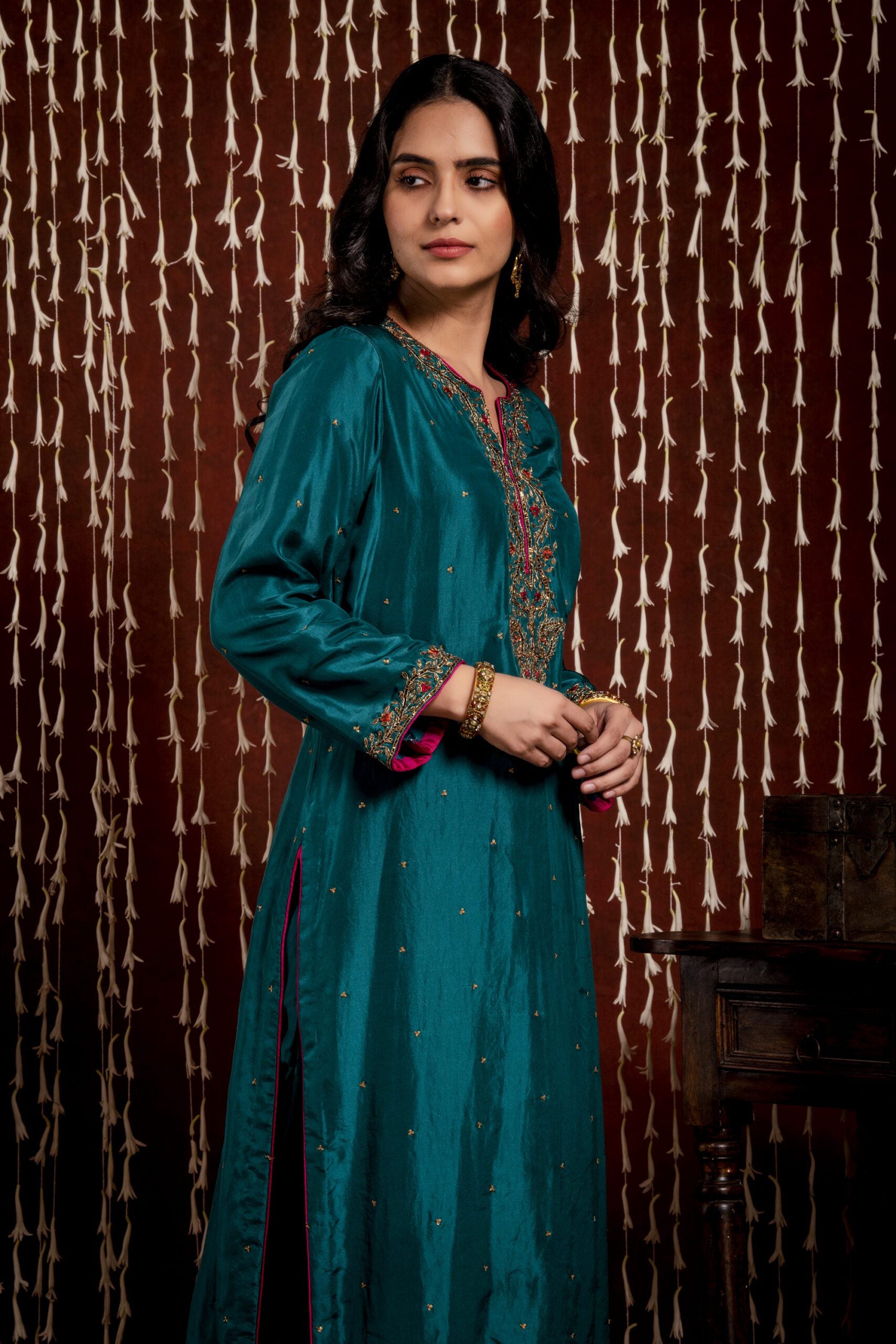 Teal color silk kurta and trousers features zardosi work on neck and cuffs paired with silk organza dupatta.