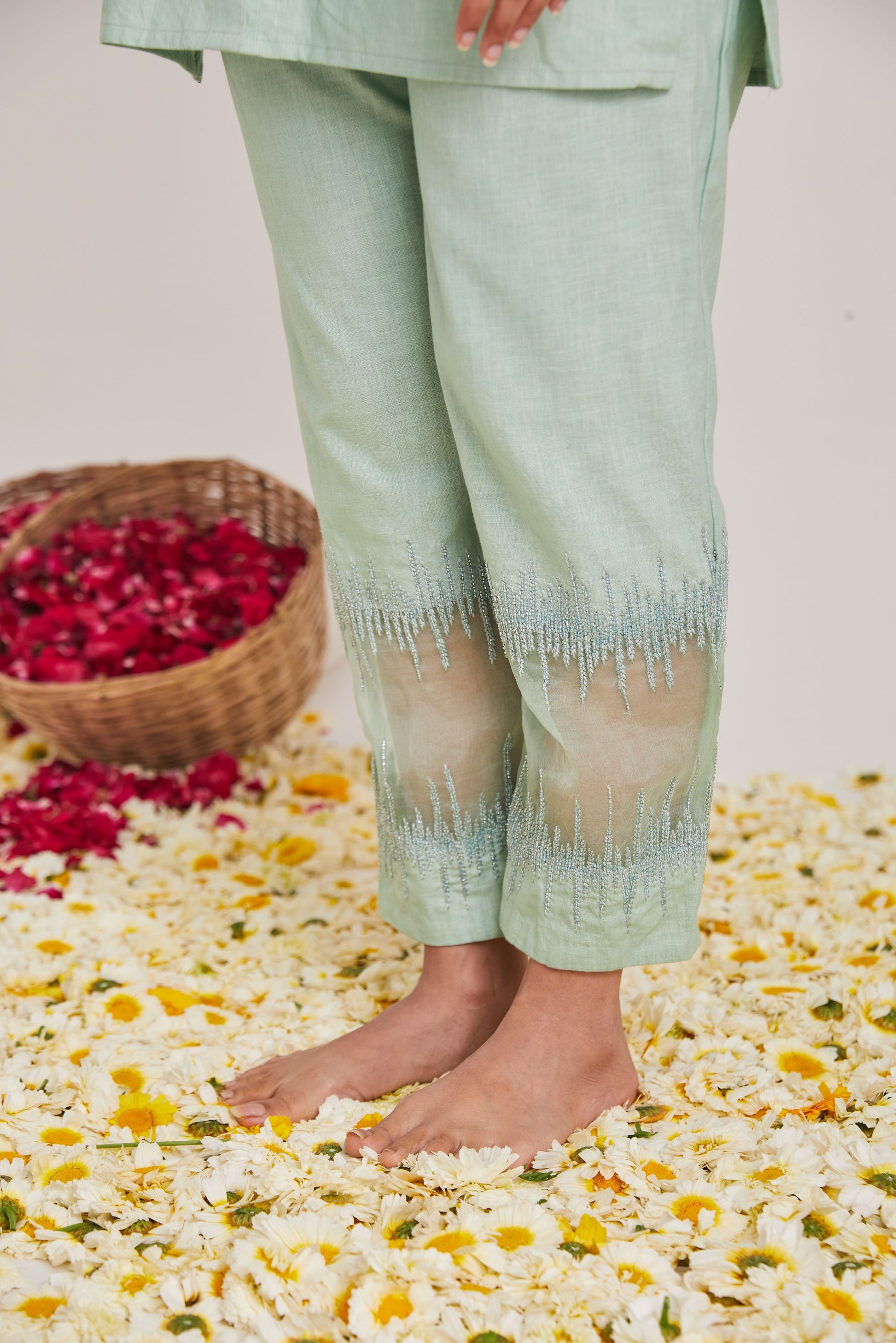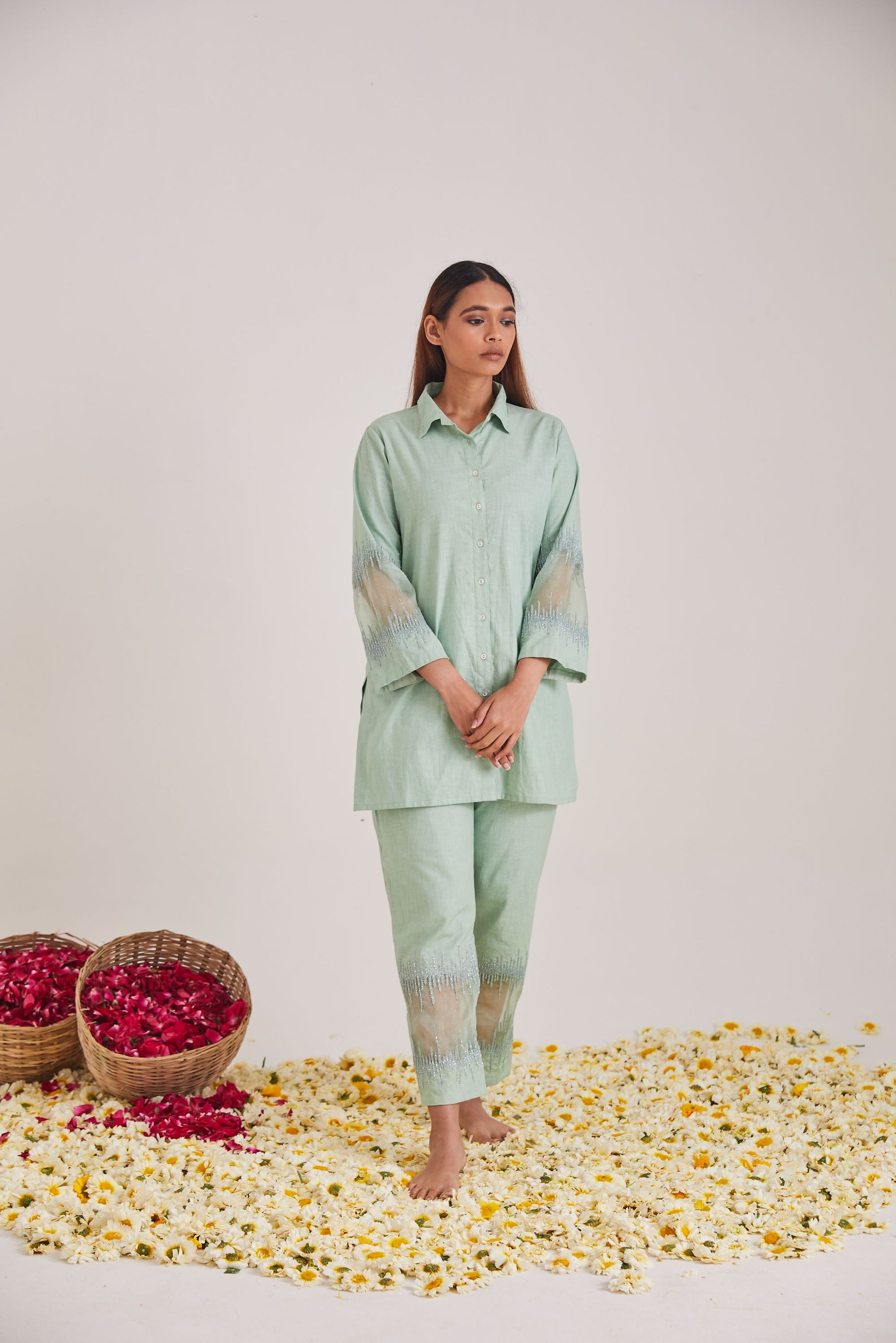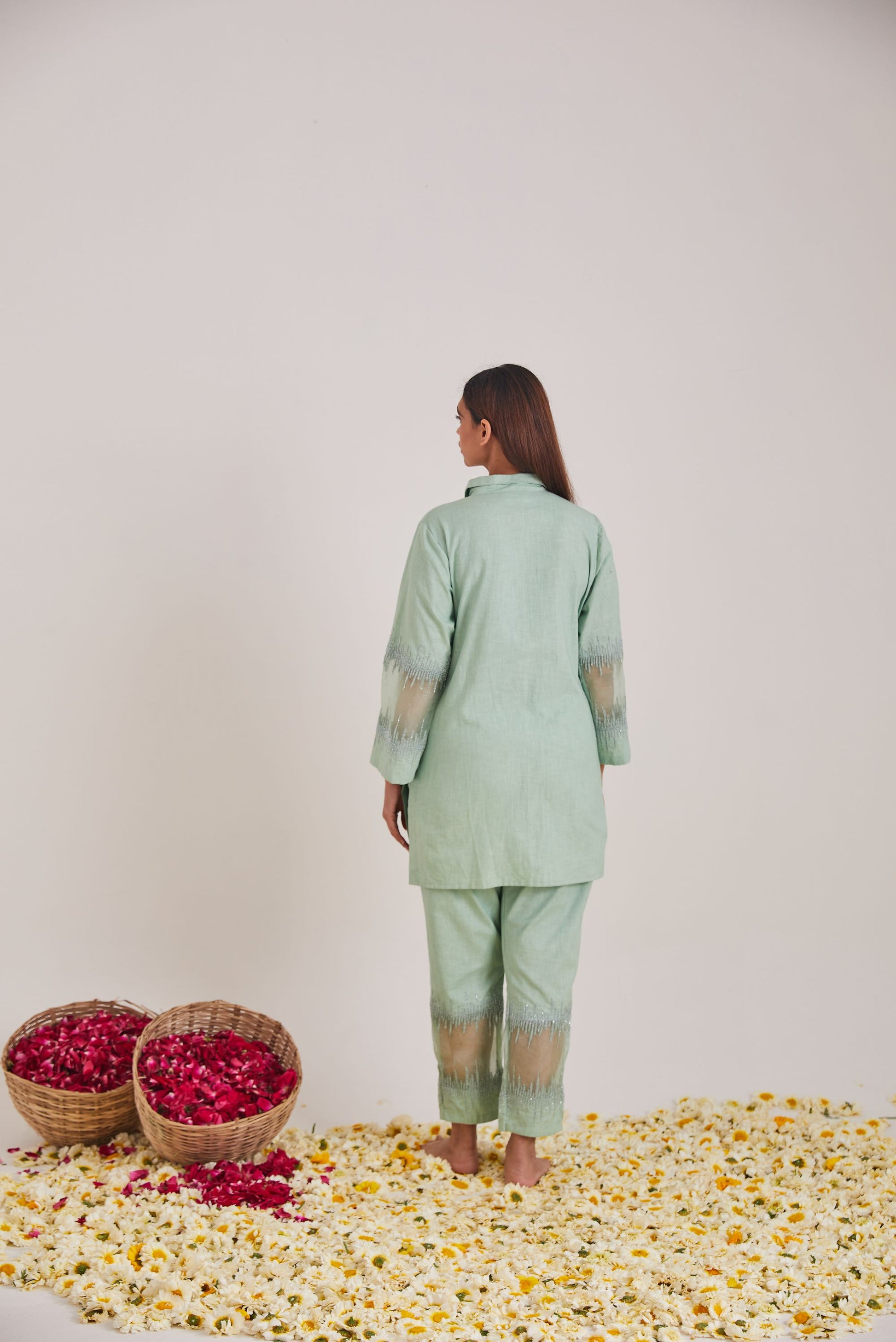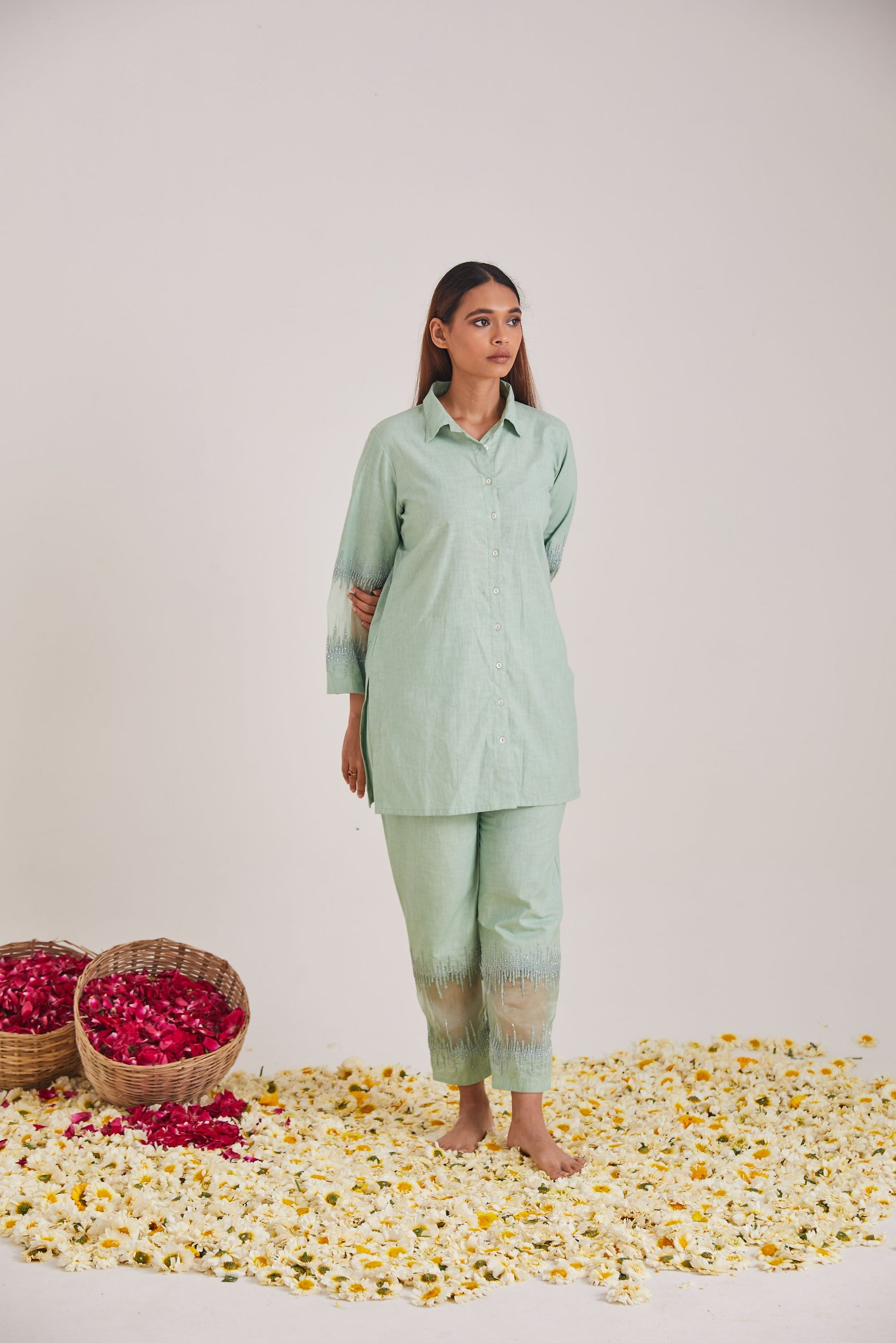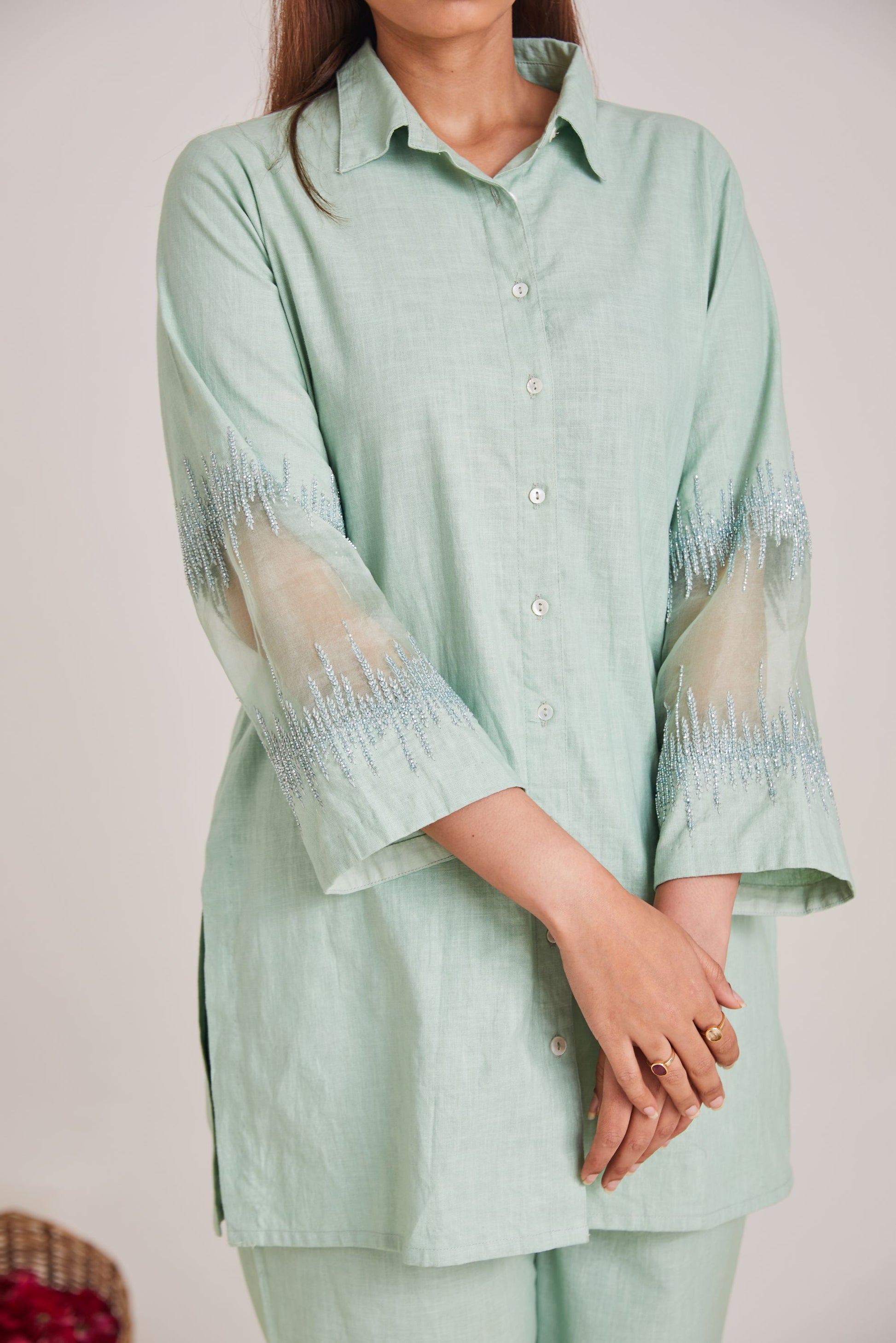 Discover the soft linen fabric cord set taking you through joy of experience detailed with threads a d bead embroidery.