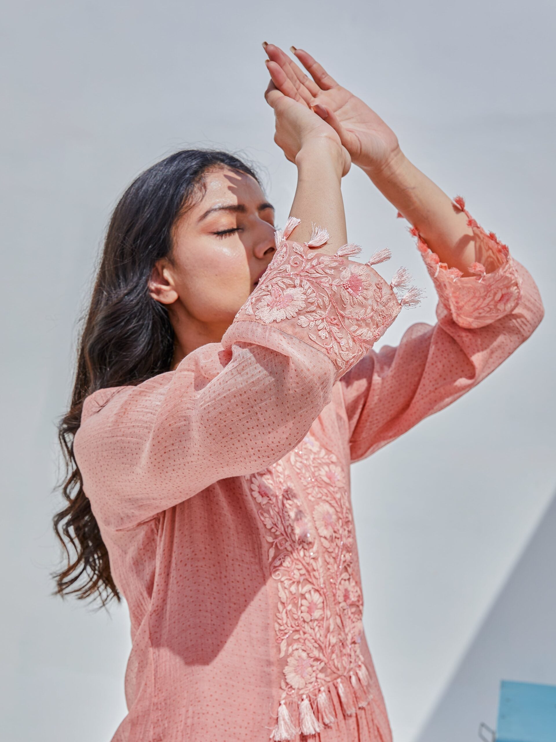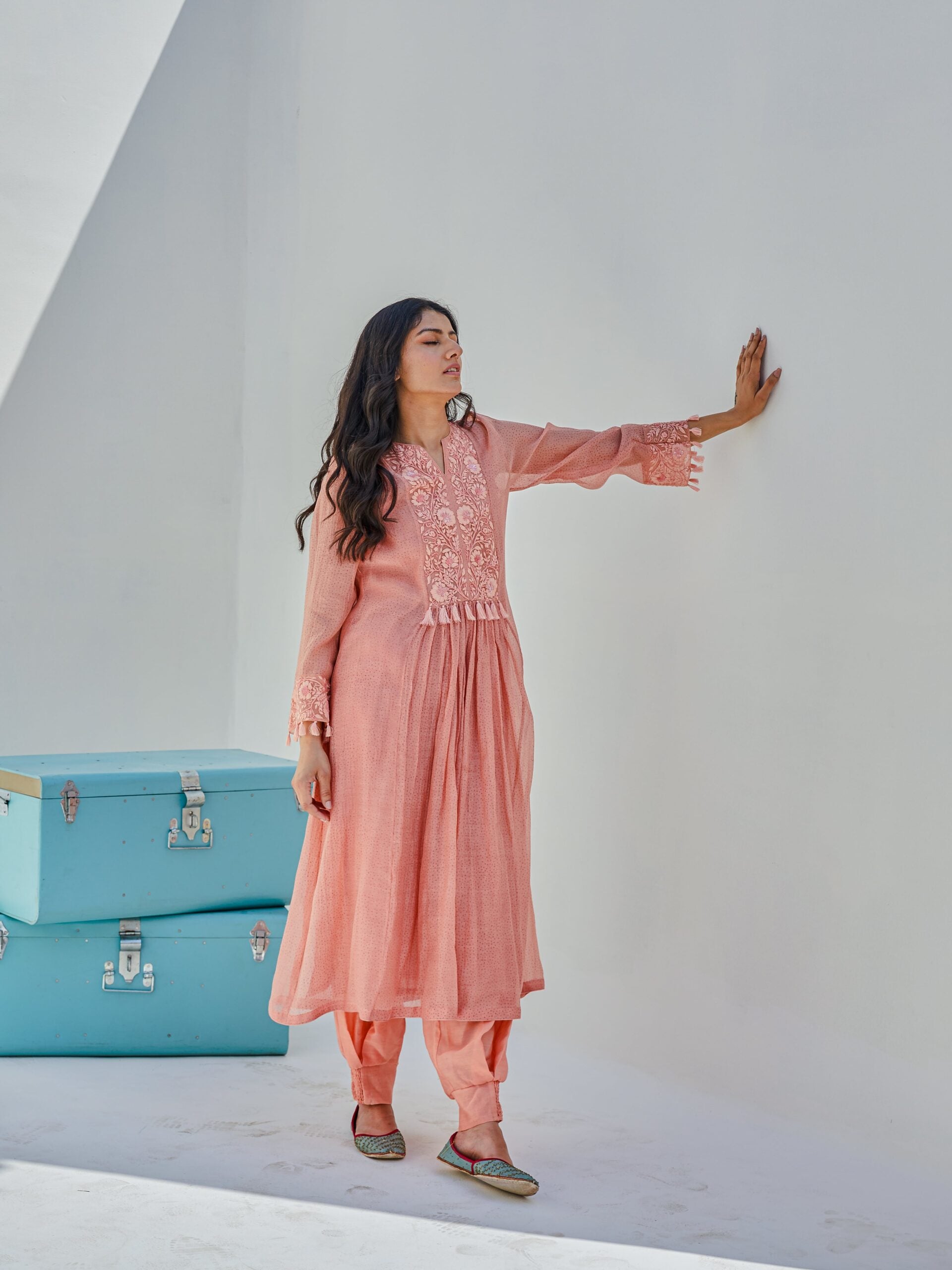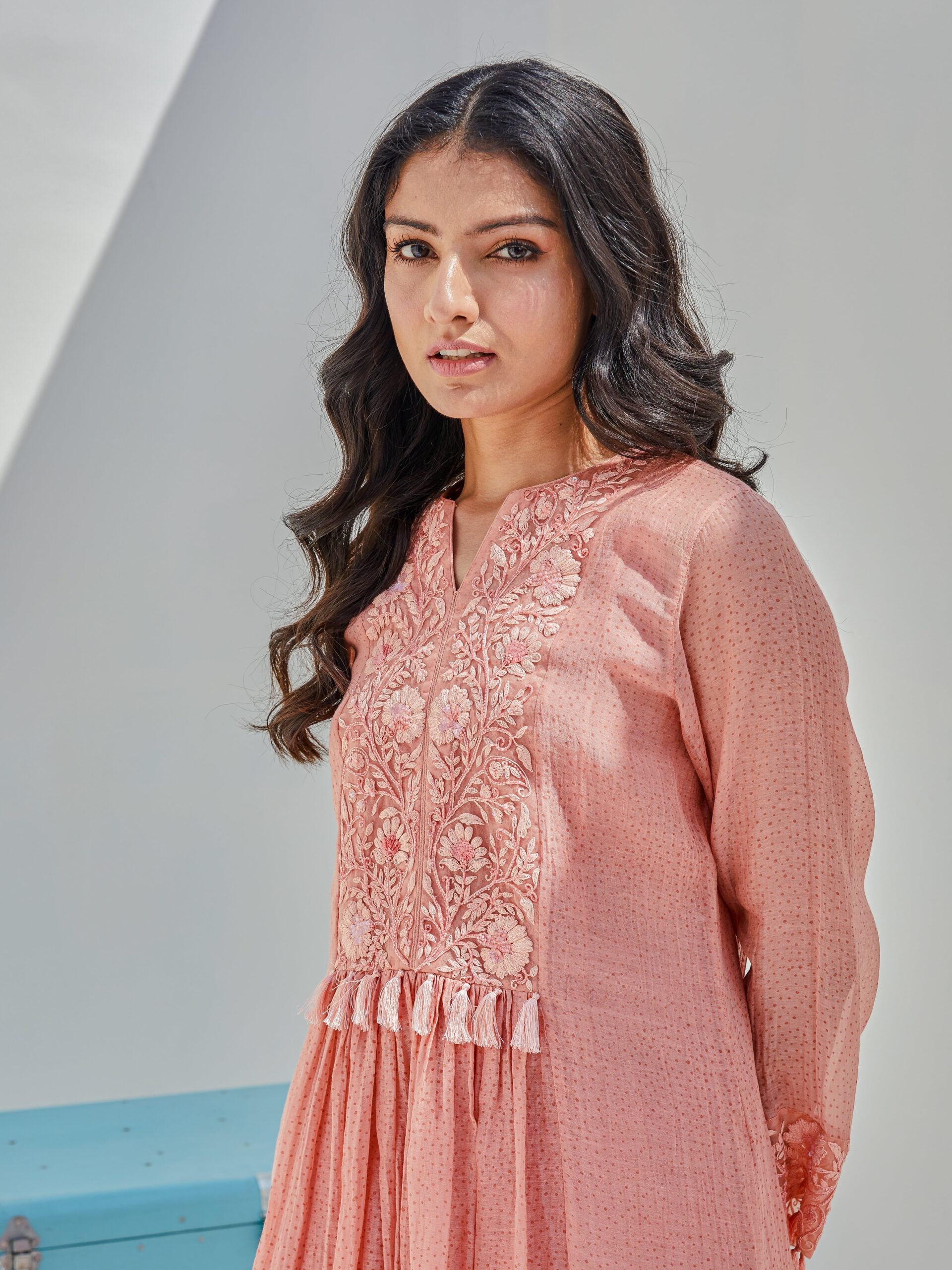 Fine chanderi indo fusion dress in peach colour paired with salwar style trouser featuring dori sequins work on dress yoke and cuffs.