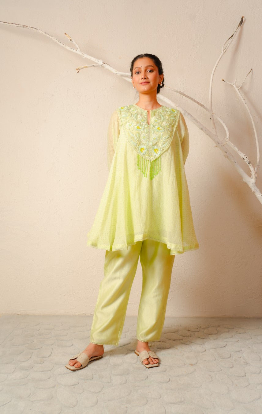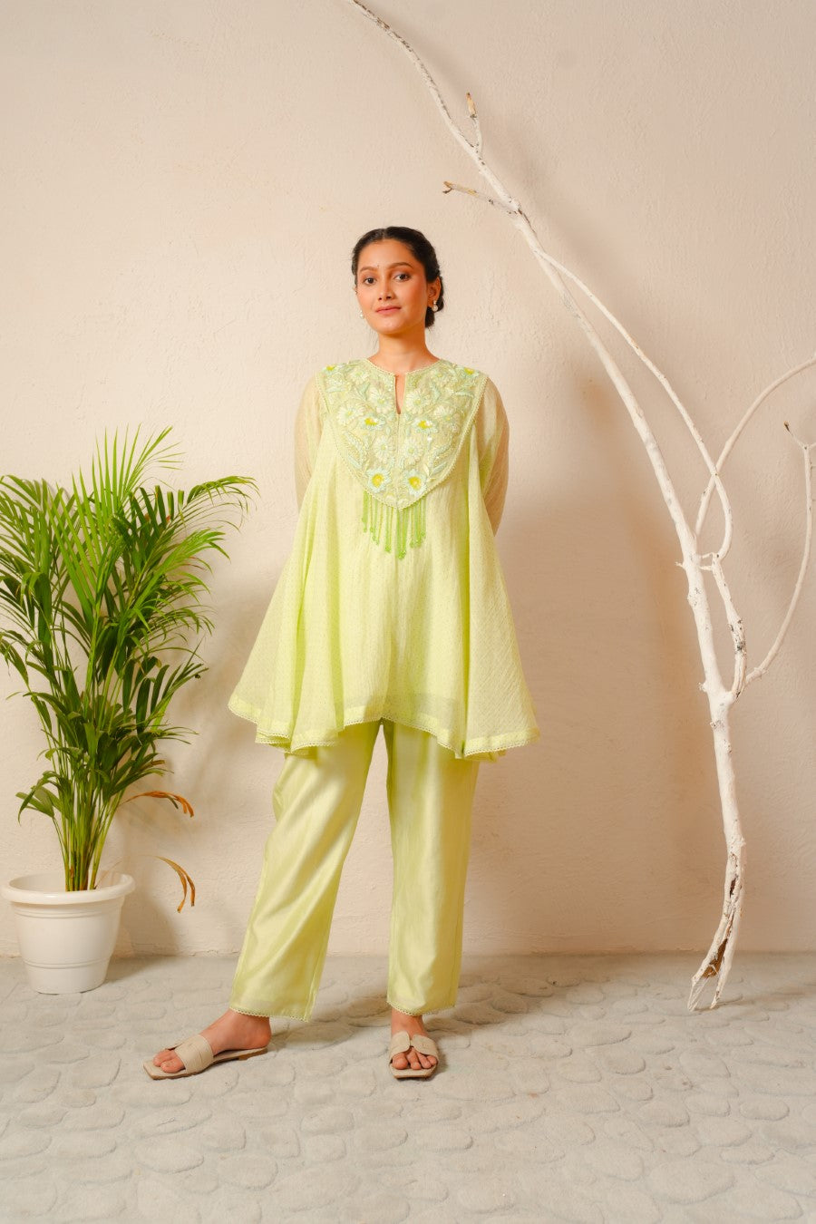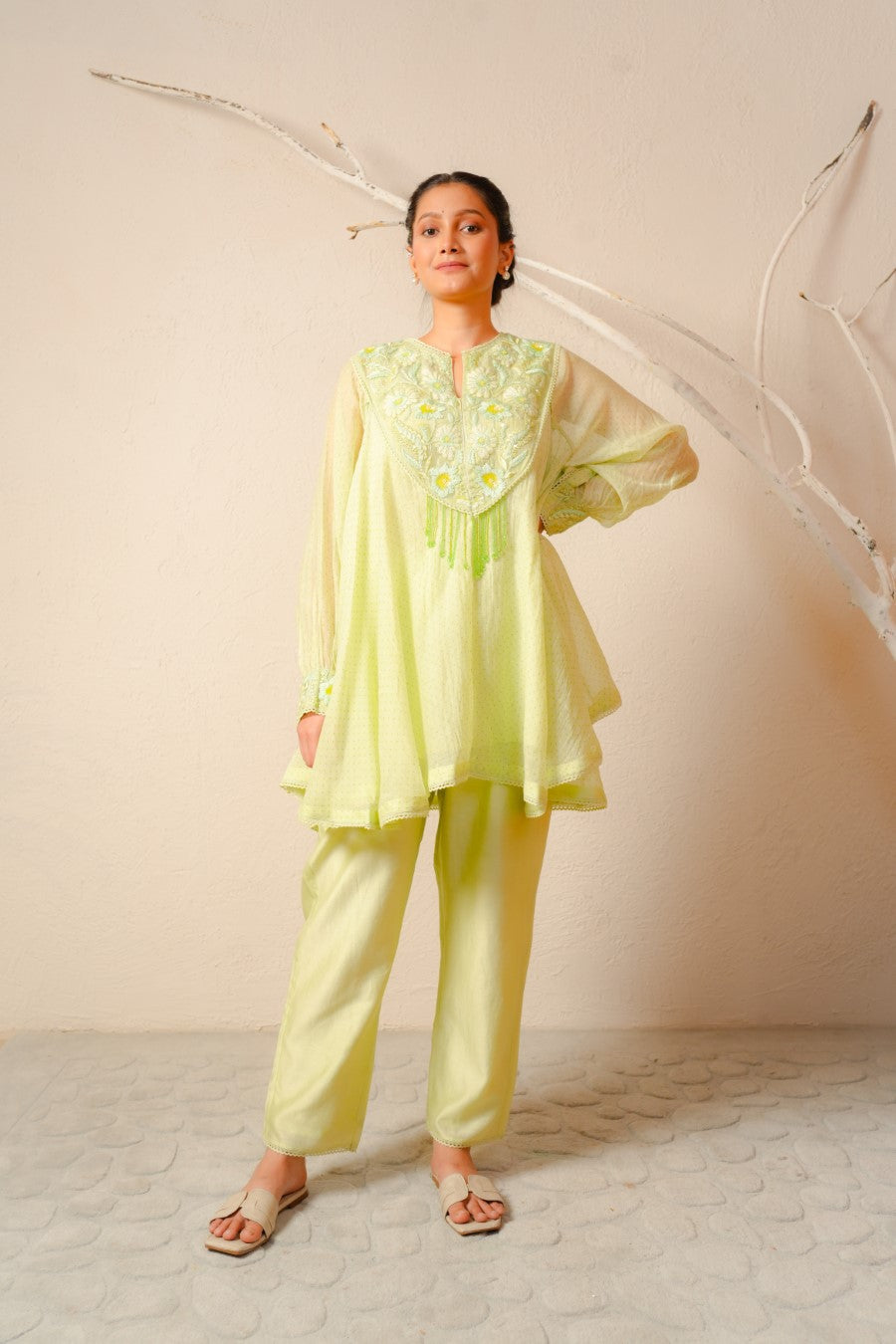 Fusion wear cord set in fine chanderi paired with silk Chanderi trousers, featuring thread and doori embroidery highlighted with sequins and bead.