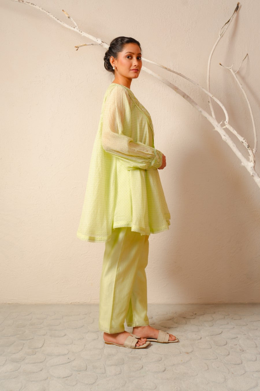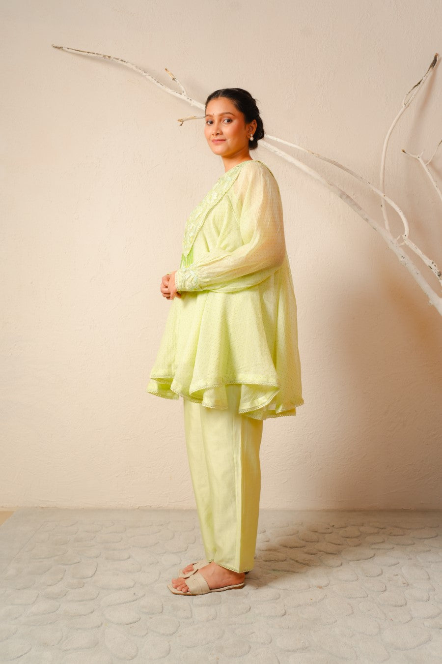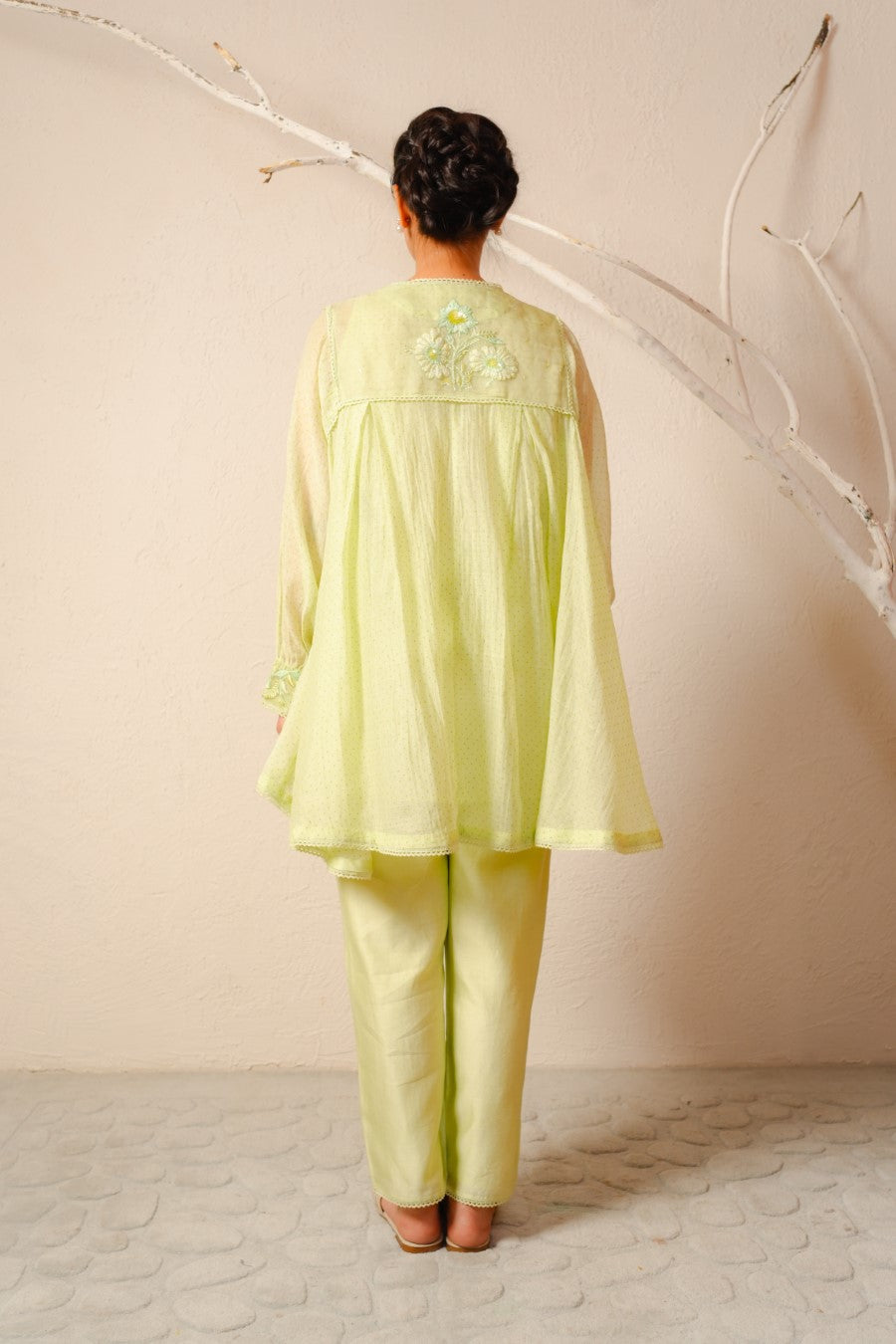 Fusion wear cord set in fine chanderi paired with silk Chanderi trousers, featuring thread and doori embroidery highlighted with sequins and bead.