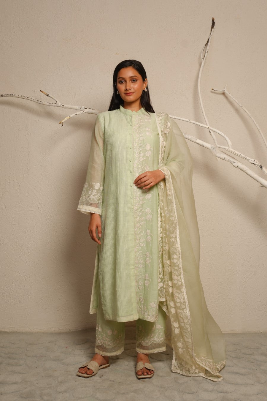 Pistasho green colour fine chanderi front open kurta paired with trouser and silk organza dupatta, details with lace and thread work.