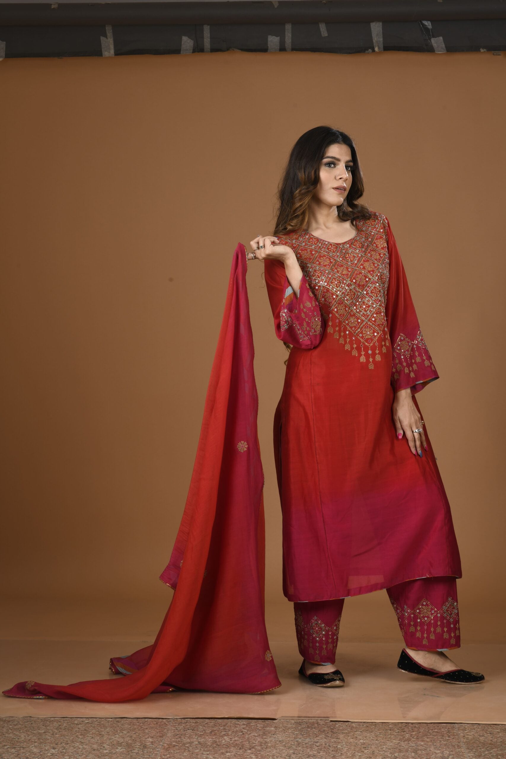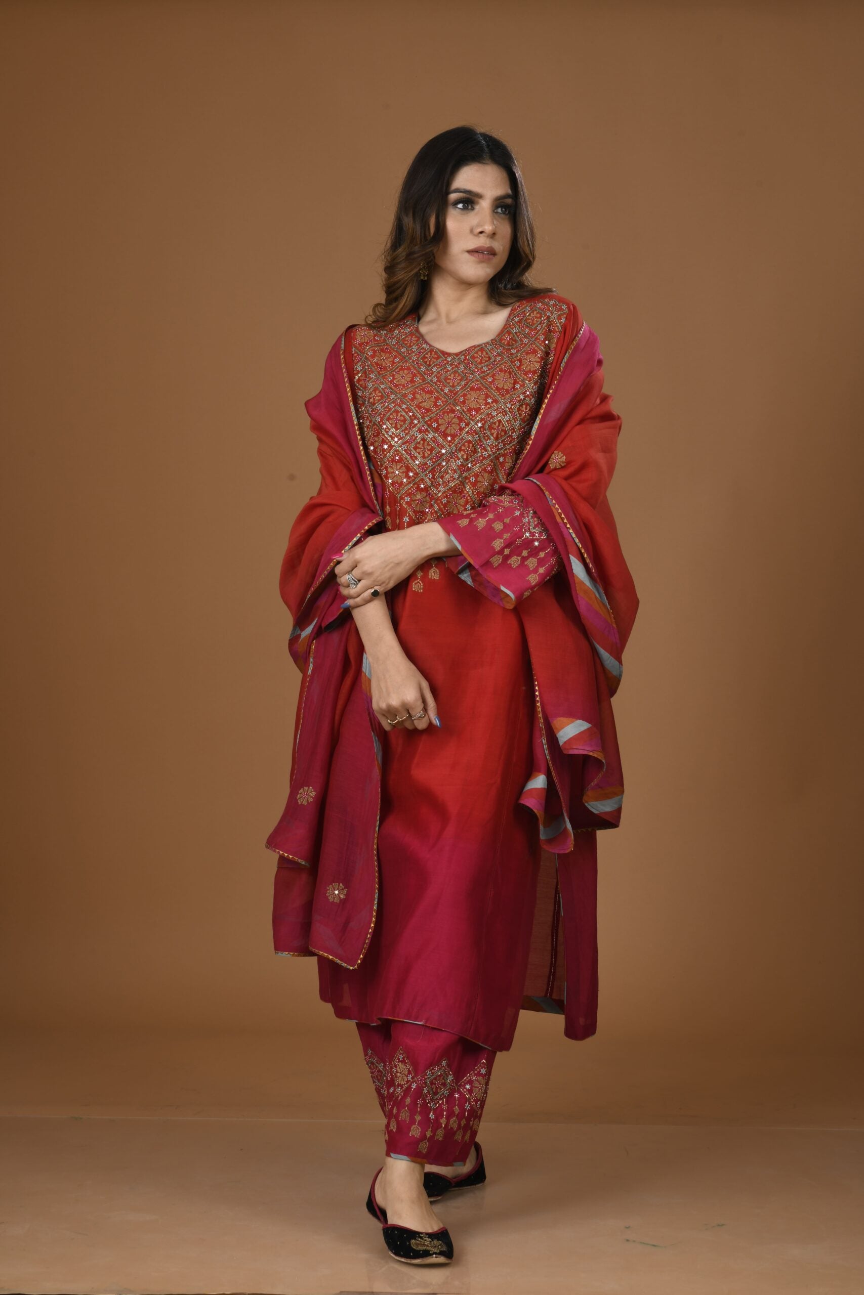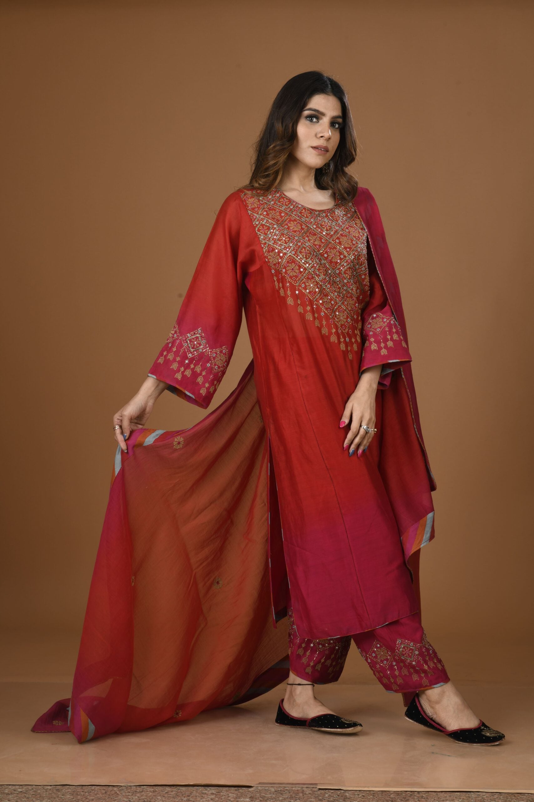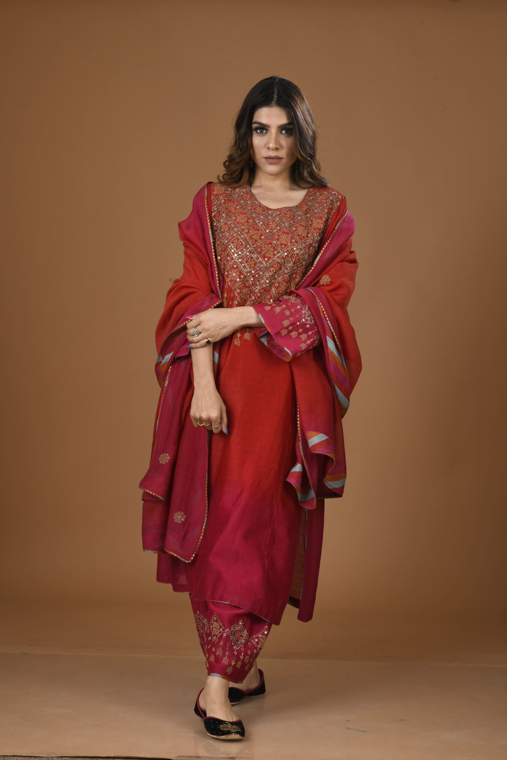 Embrace the allure of a rust and red ombre with our Chanderi Kurta, a masterpiece showcasing the artistry of zari, dapka, mirror, and sequins work on the neckline and cuffs. Paired with a resplendent salwar and adorned with an embroidered Chanderi dupatta, this ensemble tells a story of vibrant elegance. Like a fiery sunset melting into the night, the ombre hues add a captivating dimension to your look, illuminating your presence with a graceful radiance.