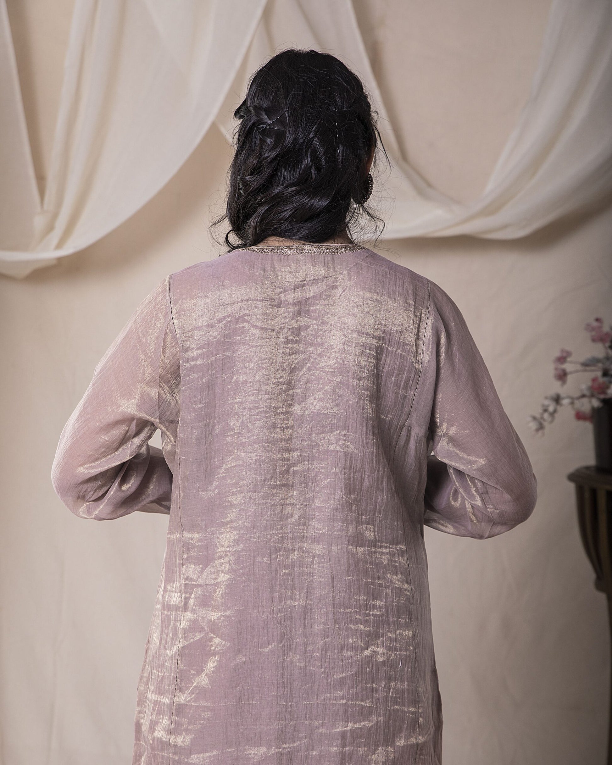 You don our lavendar kurta, embellished with delicate dabka work, evoking an aura of elegance and grace. It’s a starlit evening, and you find yourself at your sister’s wedding festivities. As you move through the room with poise, the organza dupatta gently caresses your crush’s face. A fleeting touch. The beginning of a lifelong romance!
