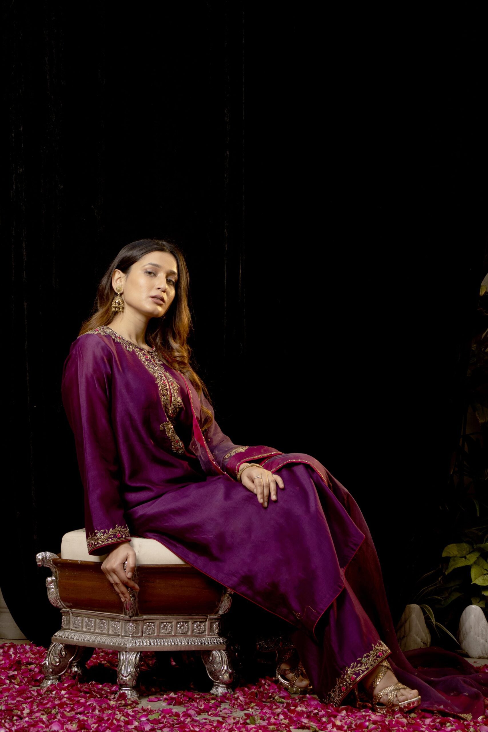 Chanderi kurta paired with pallazo featuring hand embroidery dapka and sequins work and silk organza dupatta.