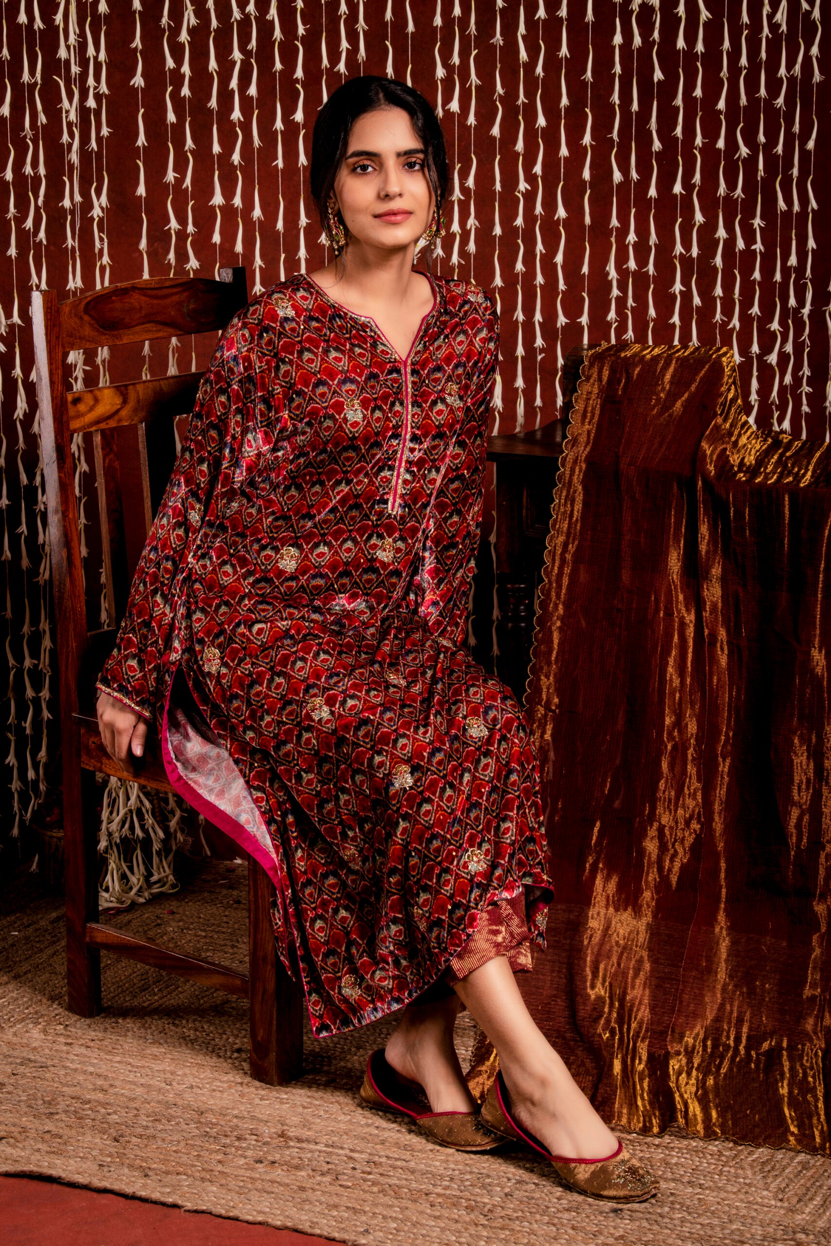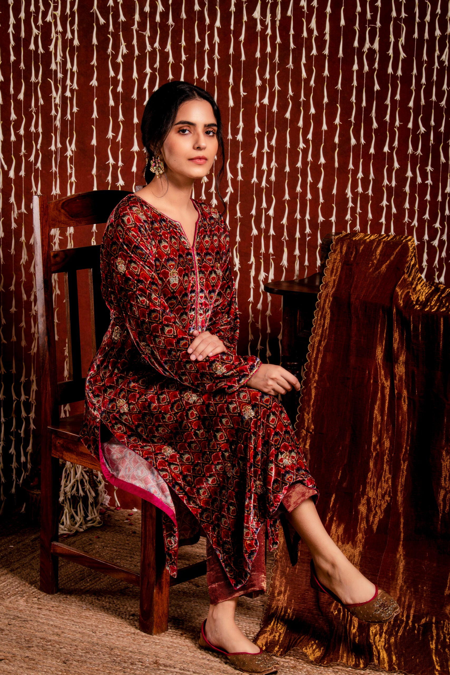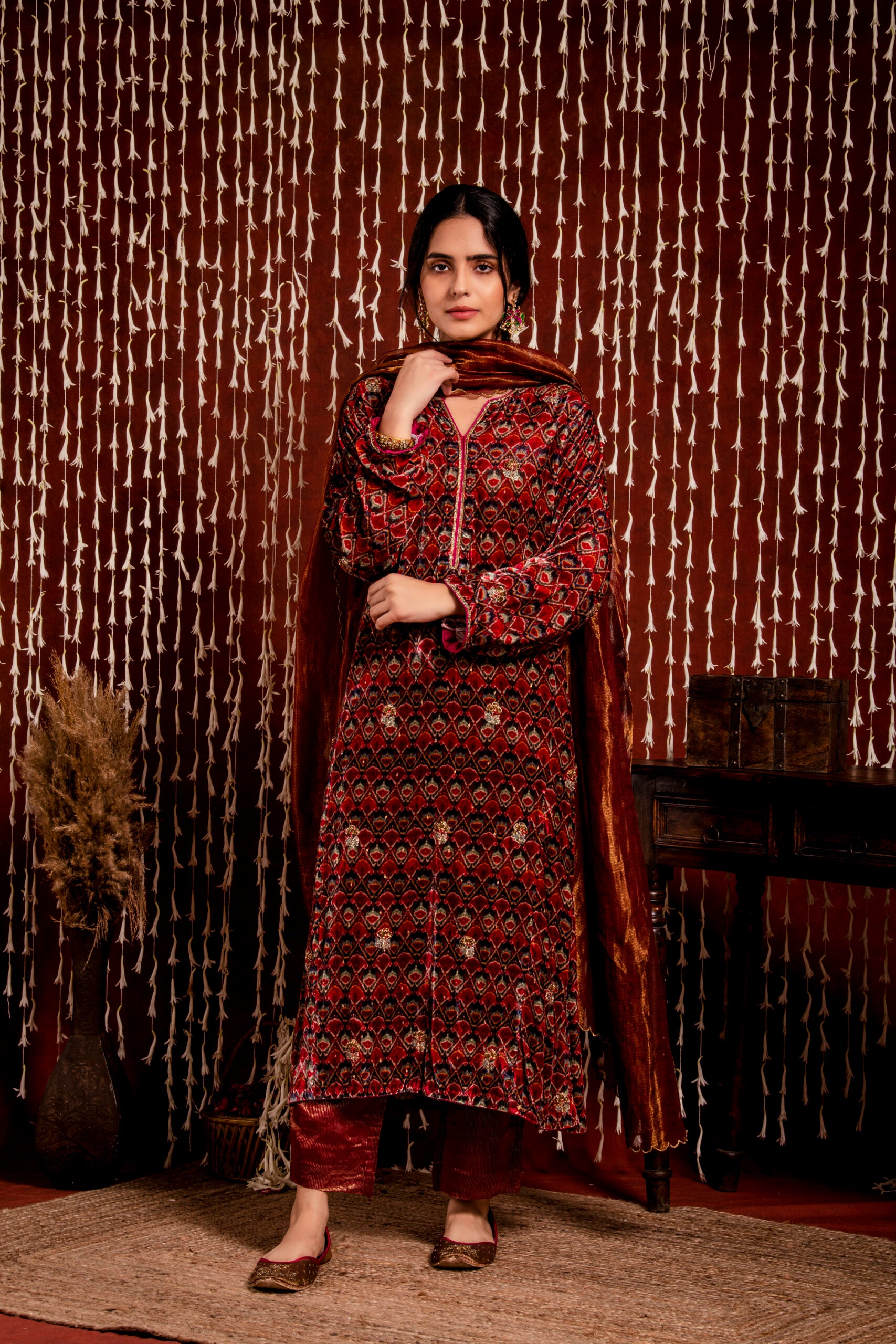 ikat printed silk velvet kurta featuring zardosi flower butta all over the kurta paired with tissue pants and tissue dupatta finished with zari scalloped.