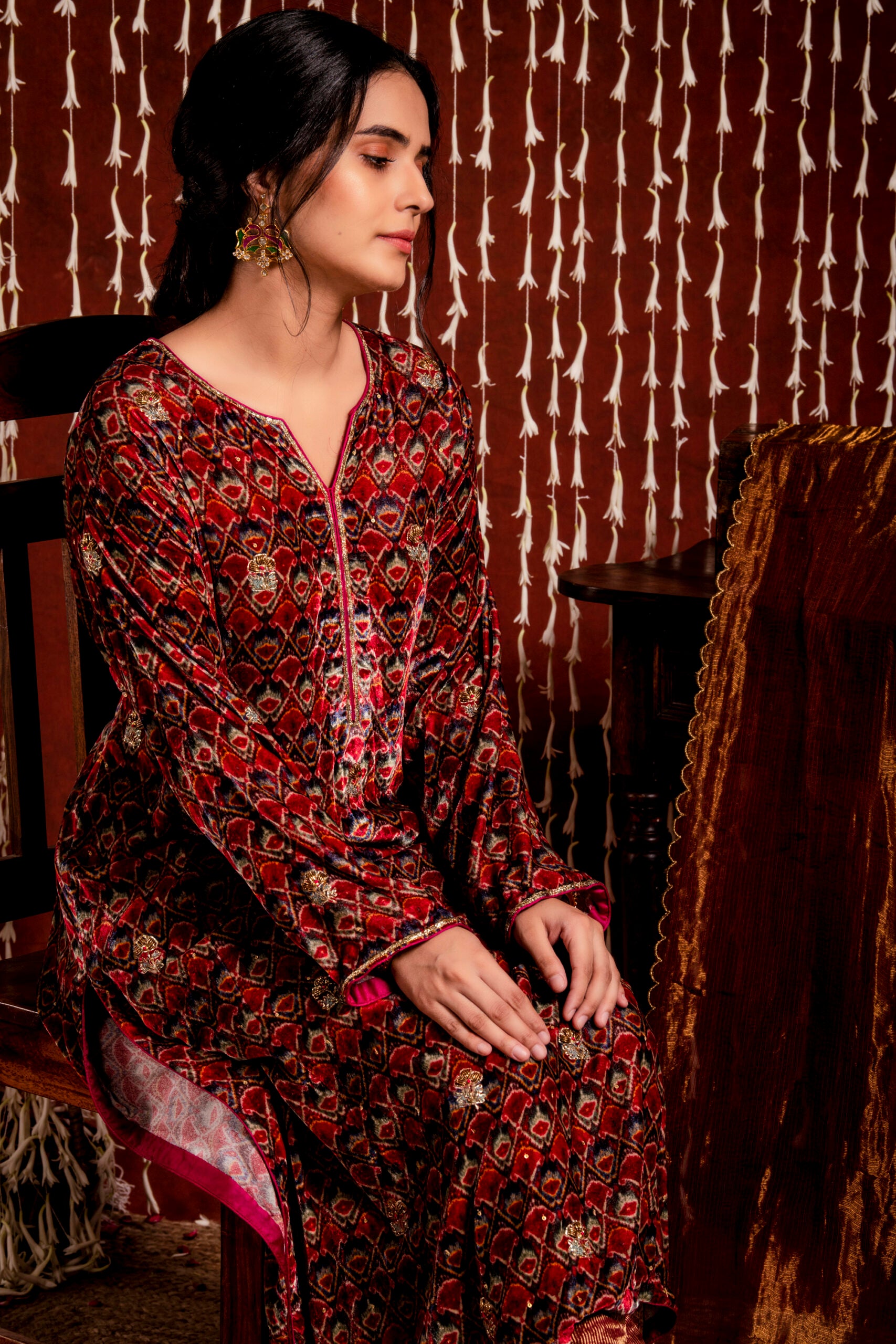Experience the luxurious embrace of the ikat-printed silk velvet kurta, adorned with mesmerizing zardosi flower butta. Paired with graceful tissue pants and a shimmering tissue dupatta, delicately finished with zari scalloped edges. Revel in the tactile splendour and let the rich textures of this ensemble transport you to a realm of festive joy and sartorial elegance.