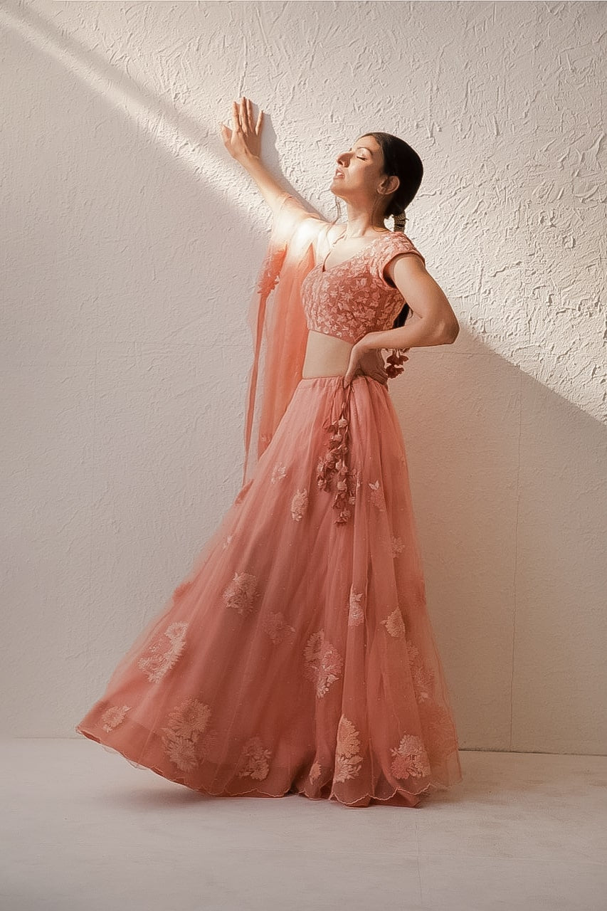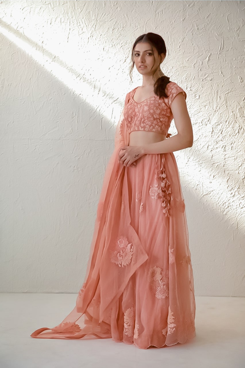 Step into a world of timeless elegance with the Peach Formal Lehenga Blouse Set in exquisite silk organza. Delicate dori, threadwork, and sequins intertwine like vines on a trellis, creating a mesmerizing tapestry of artistry. This ensemble captures the essence of feminine allure and is perfect for those seeking a touch of regal beauty.