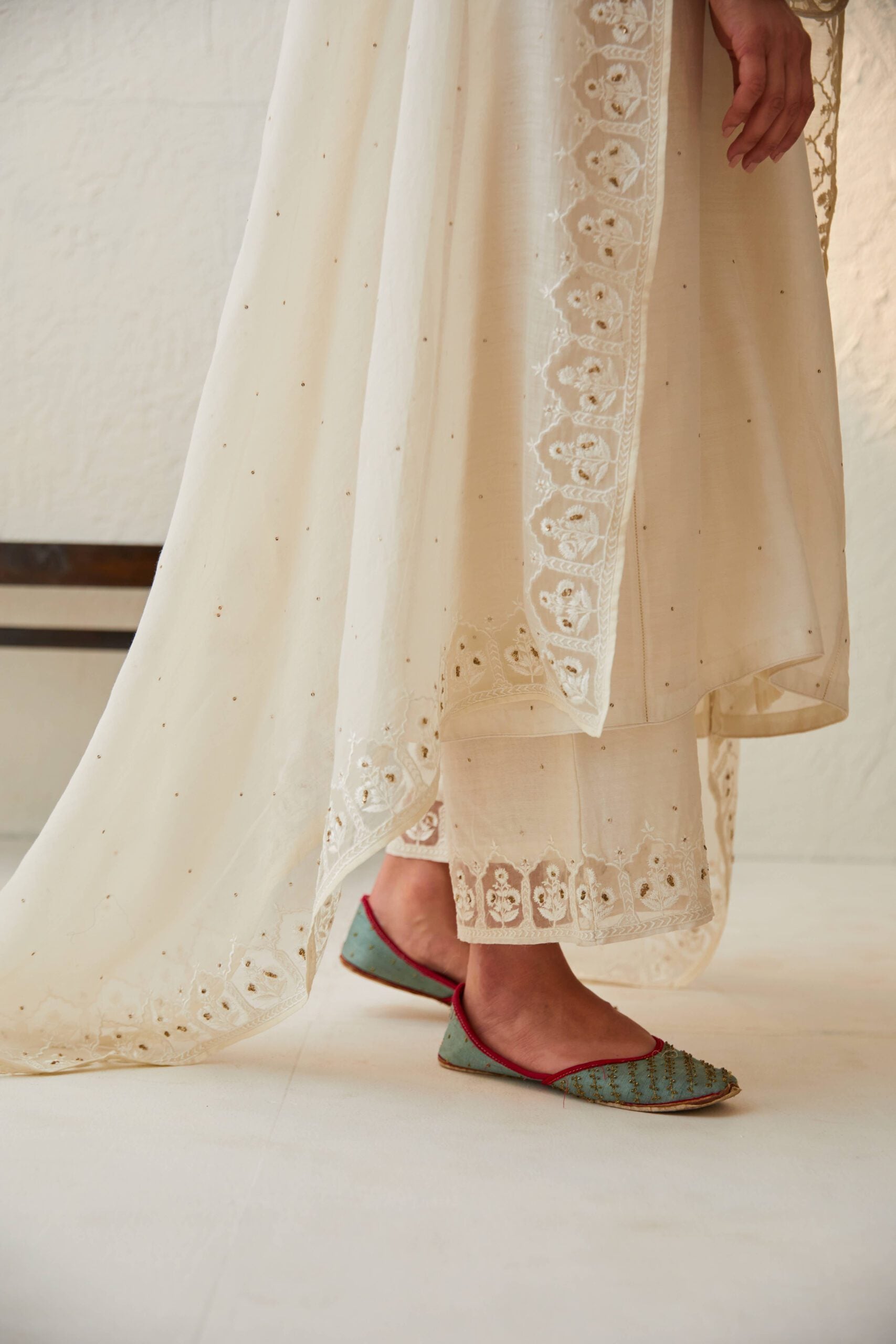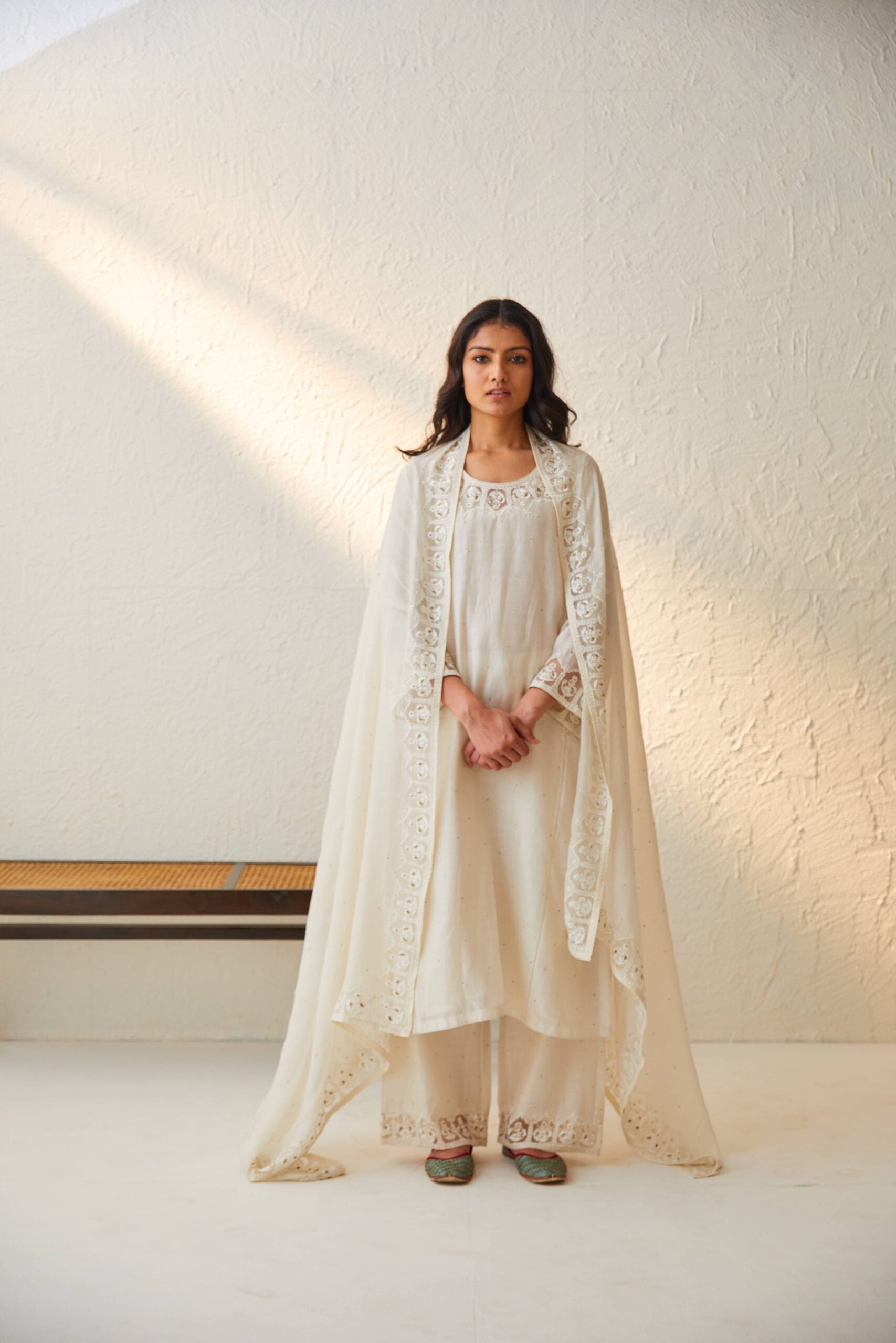Ivory colour chanderi Kali style kurta paired with pallazo and chanderi dupatta features tonal thread and sequins embroidery all over dupatta border, pallazo edges and kurta neckline and cuffs.