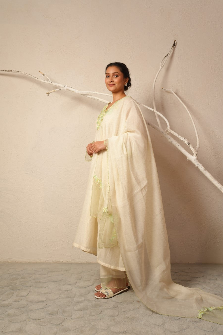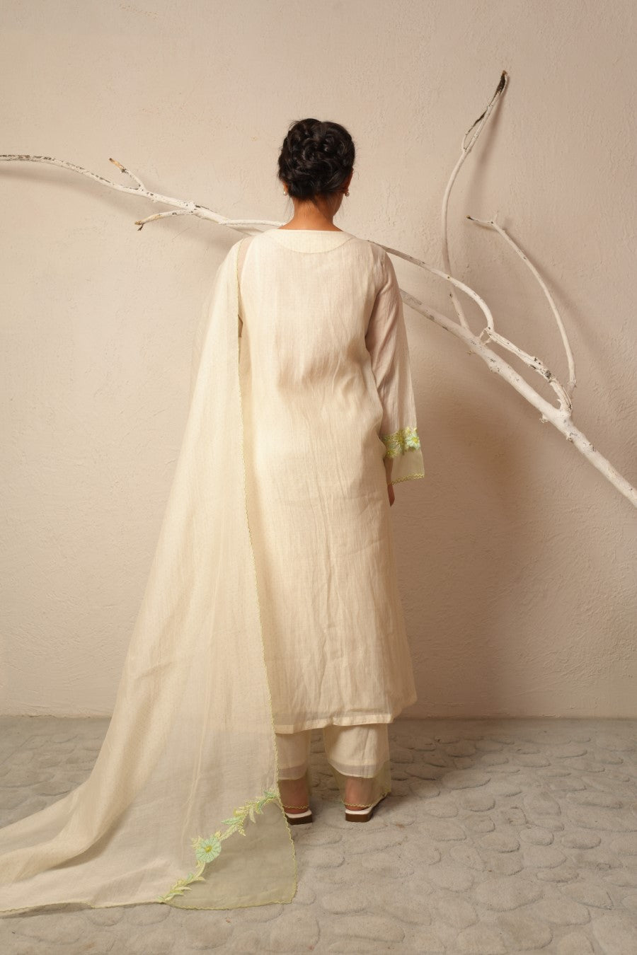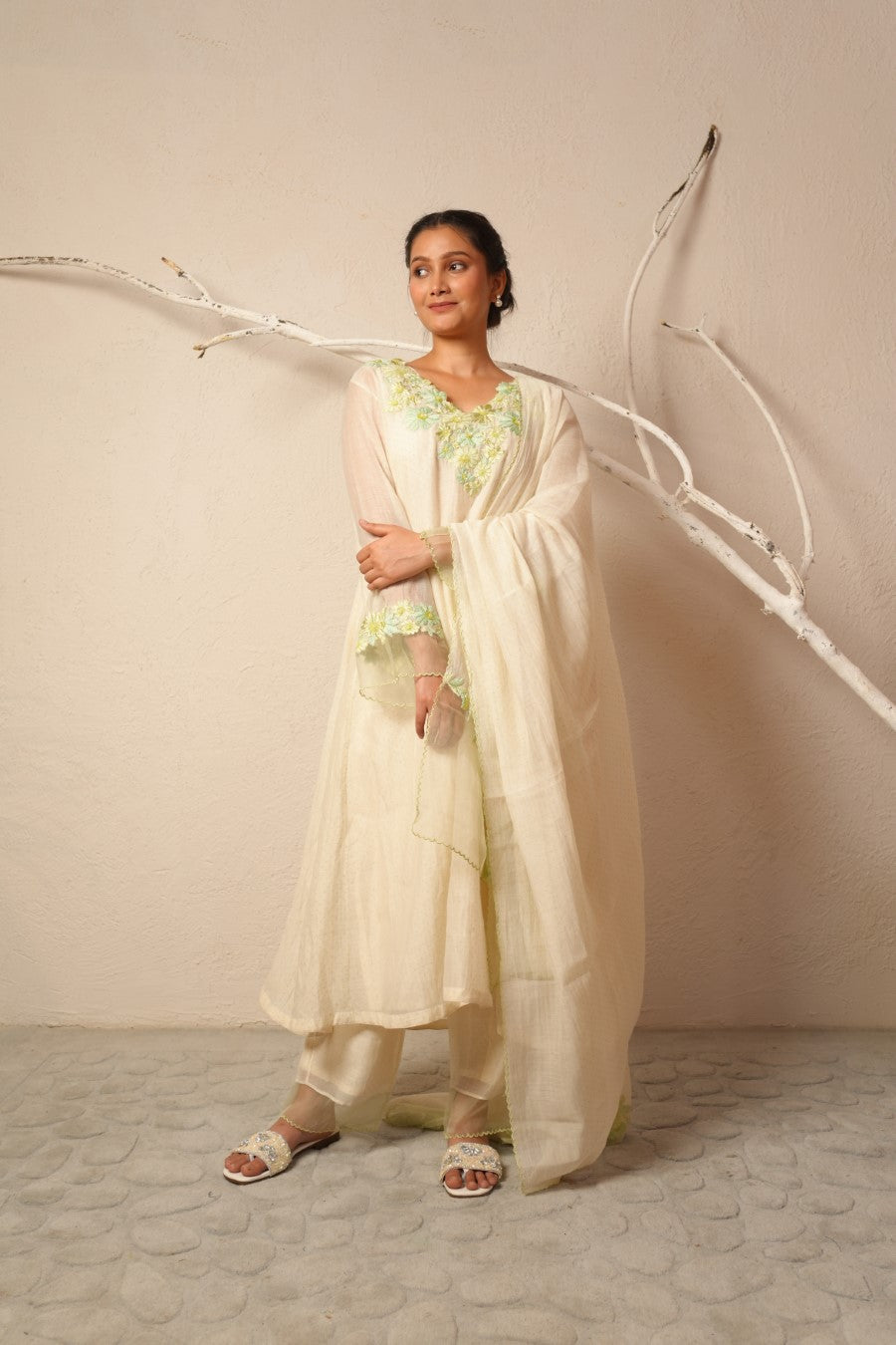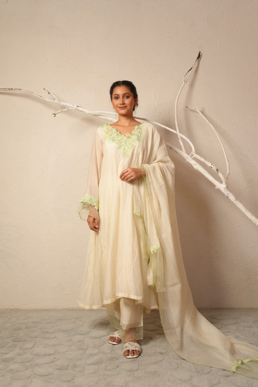 Fabric: kurta -fine chanderi, pant - fine chanderi, dupatta - fine chanderi