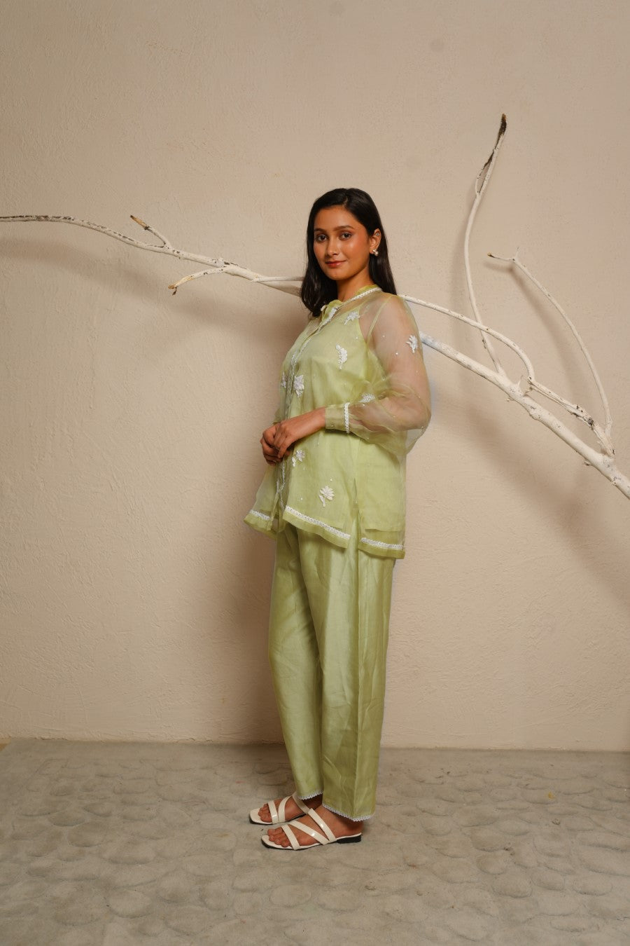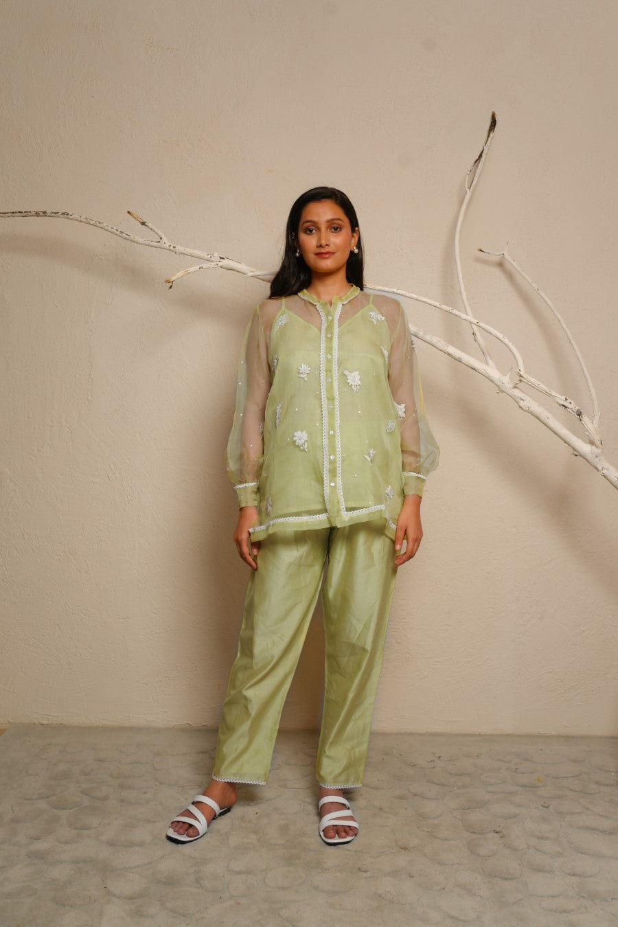 Light green organza shirt featuring flower motifs detailed with lace on shirt paired with chanderi trousers