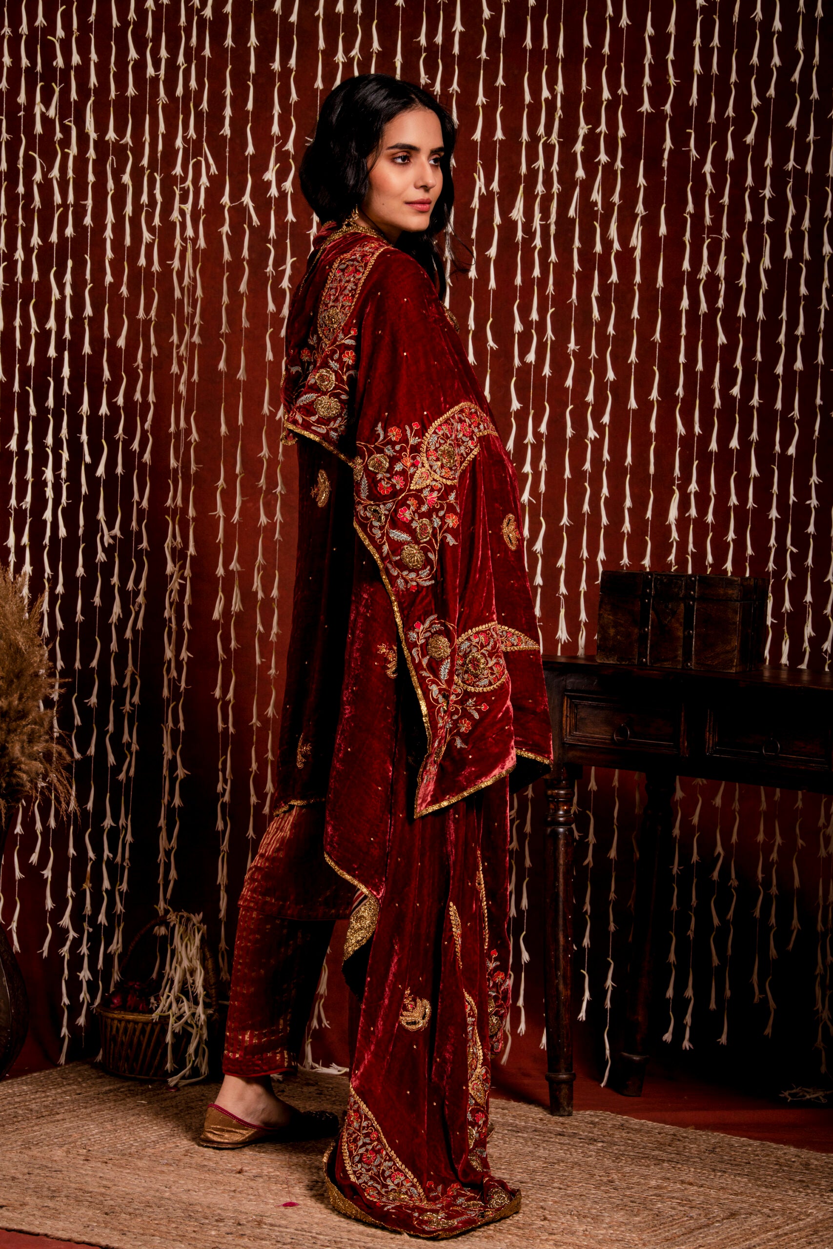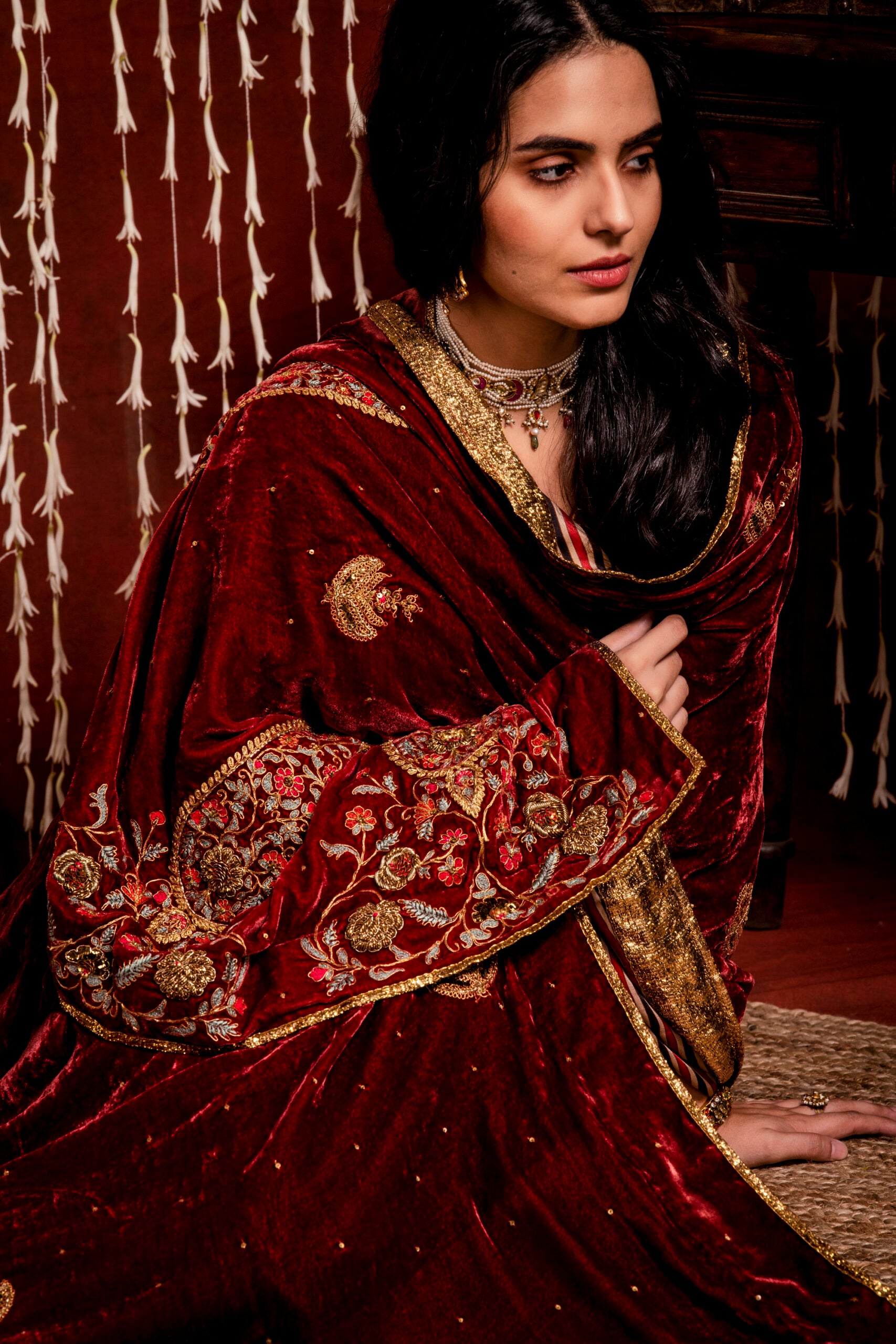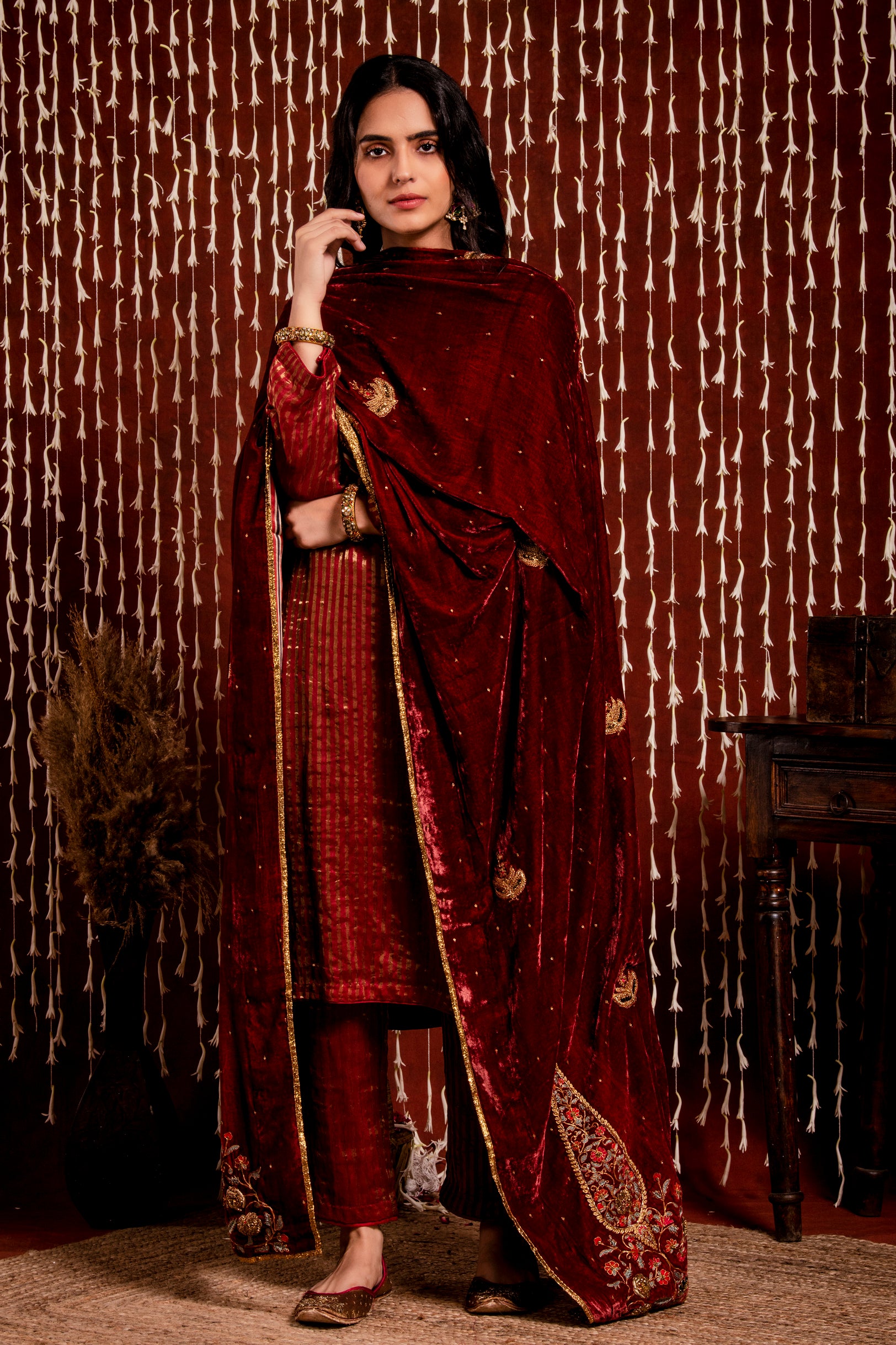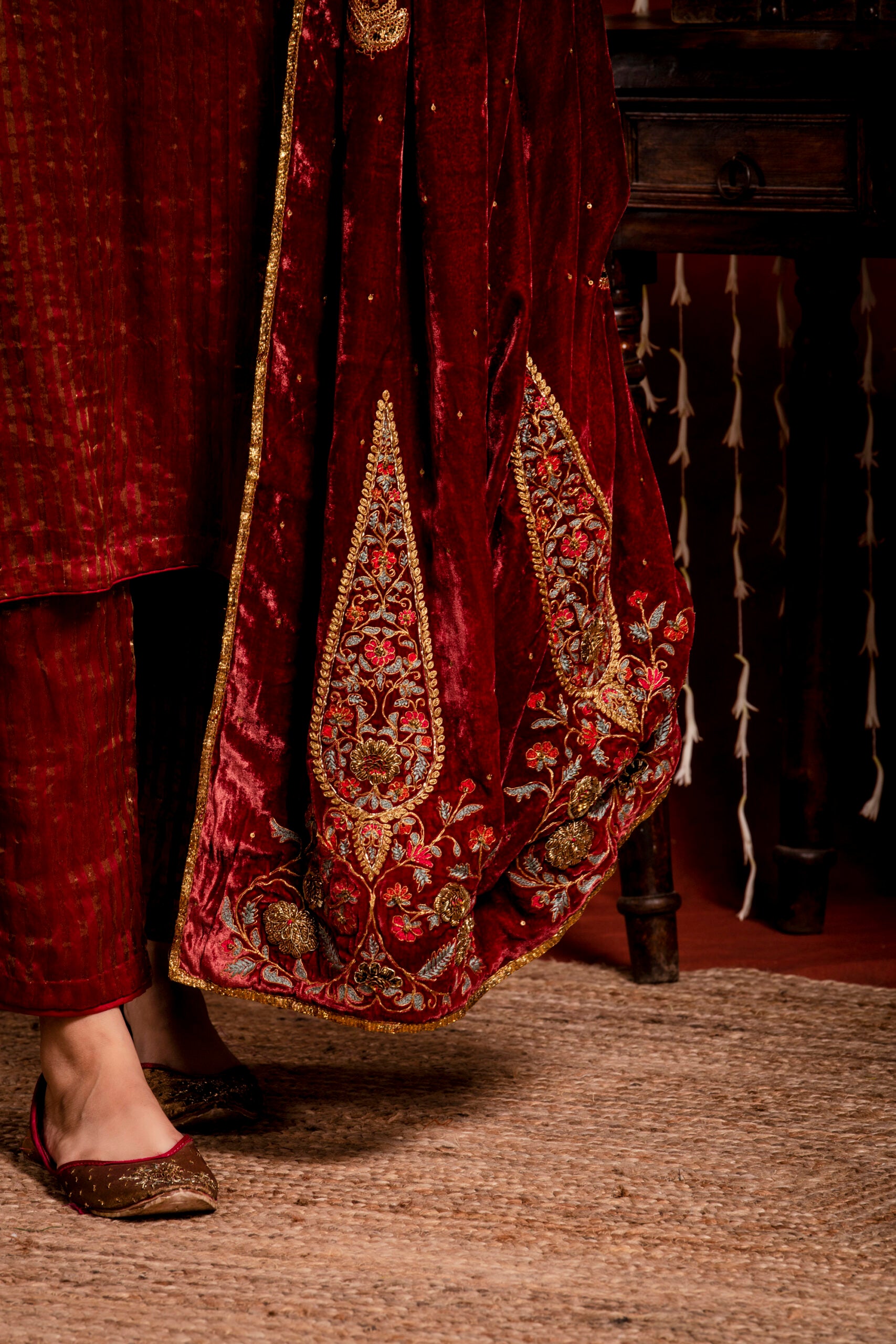 Behold the exquisite allure of our hand-woven chanderi stripe tissue cord set, adorned with delicate stripes that dance harmoniously. Paired with a sumptuous silk velvet doshala, caressed by the finest zardosi work, this ensemble emanates a symphony of luxury and refinement. Prepare to embrace the spotlight as you grace the grandest of occasions, a vision of sheer magnificence in this enchanting ensemble.