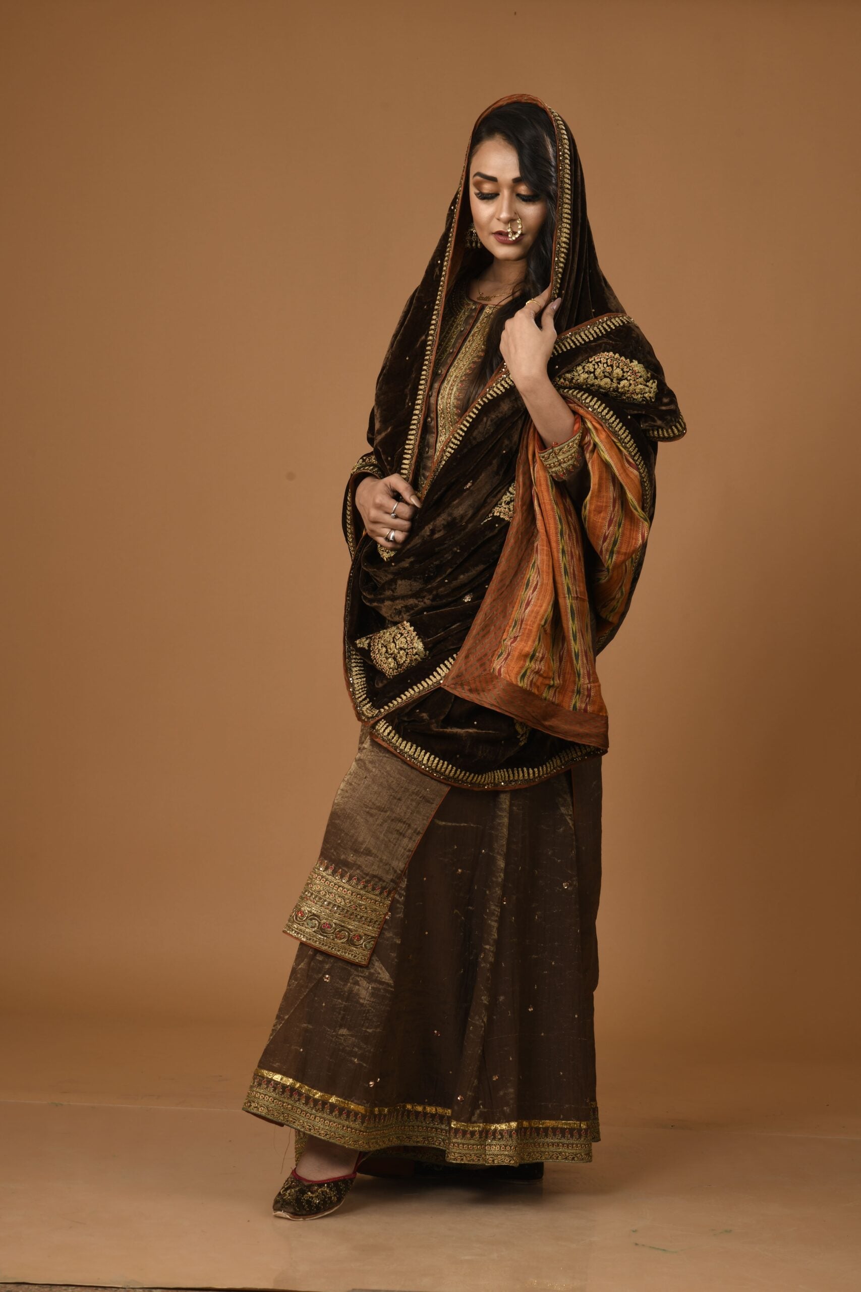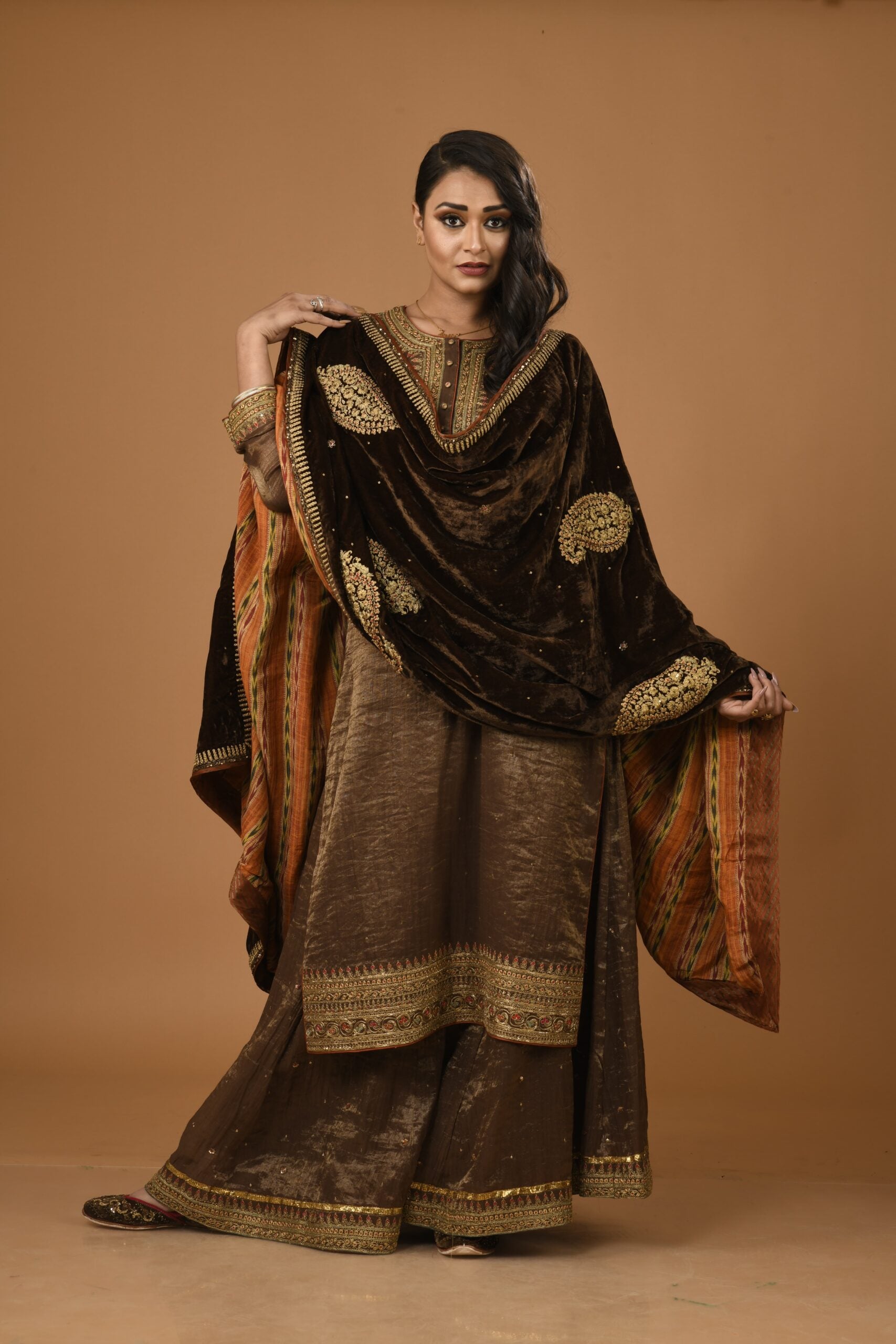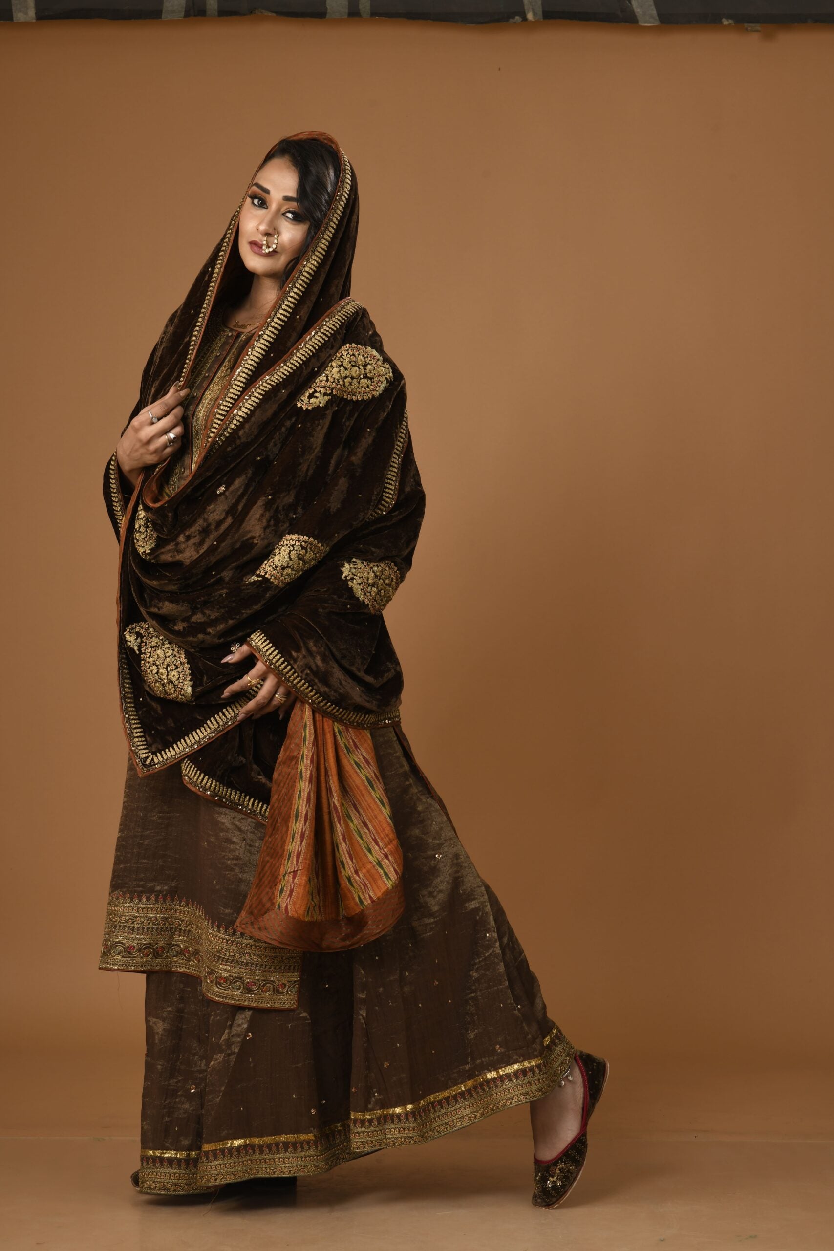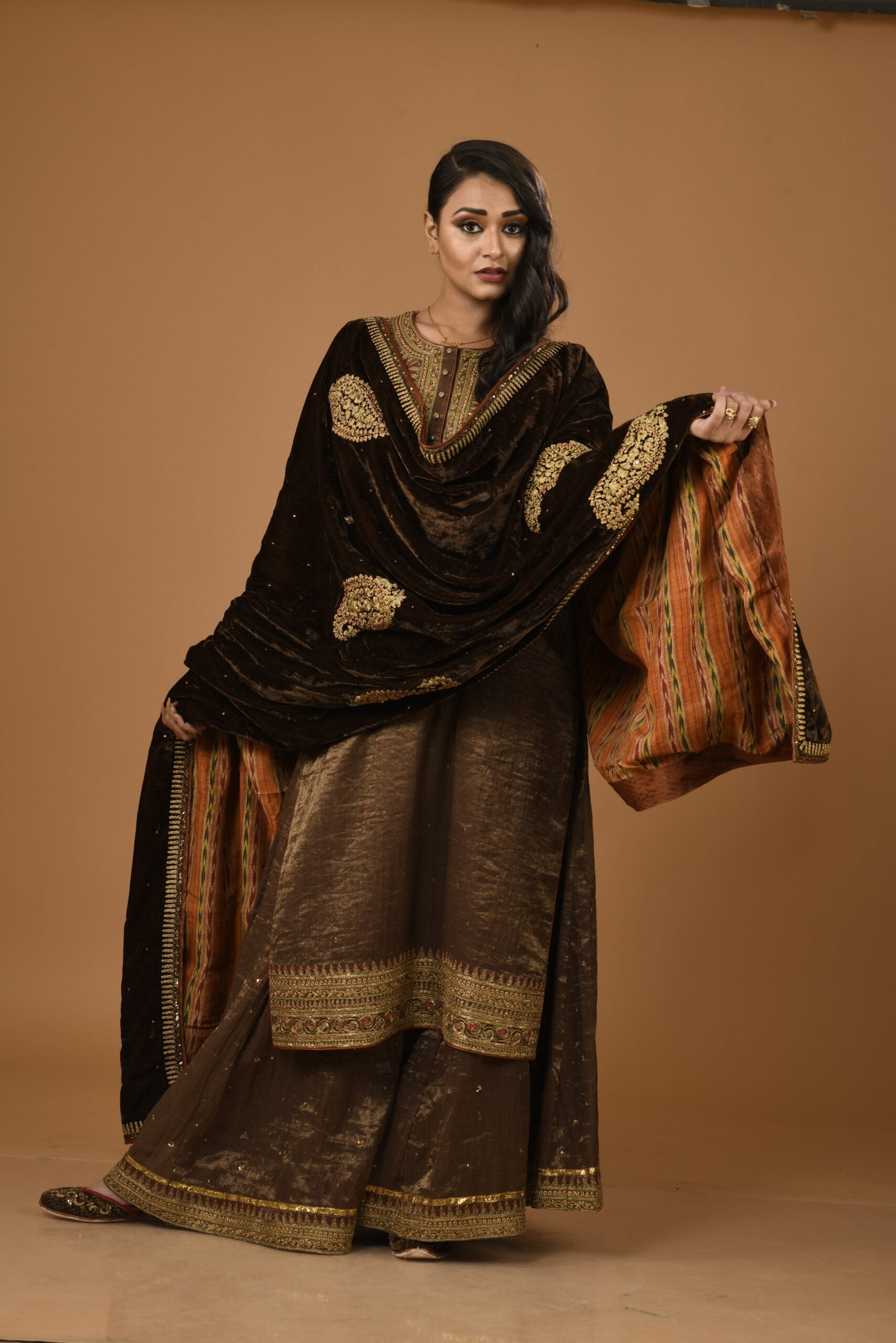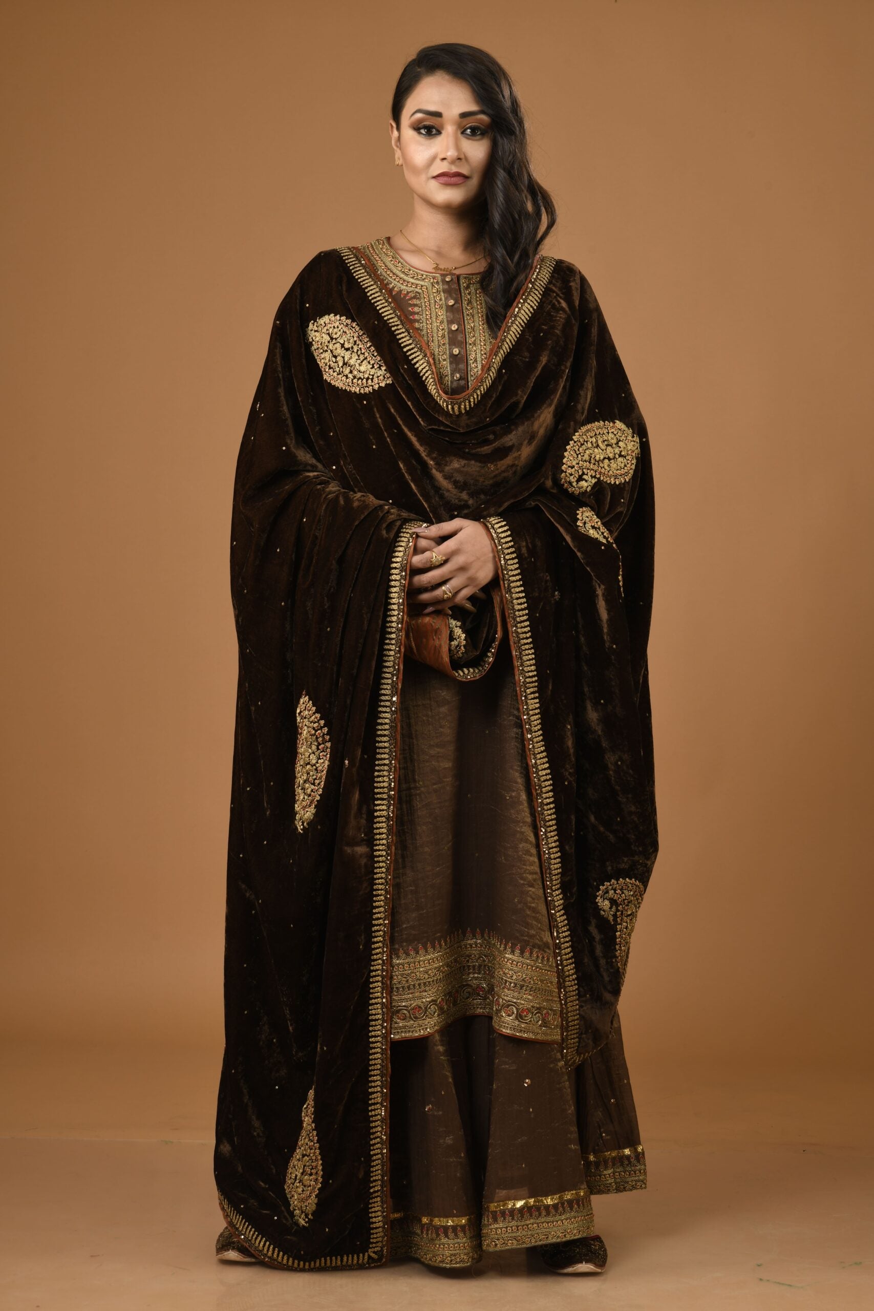 Prepare to captivate hearts with our Brown Tissue Kurta, a masterpiece adorned with mesmerizing zardosi work. Paired with a matching tissue sharara and accompanied by a silk velvet dupatta, this ensemble exudes a richness reminiscent of fine chocolate. The deep, earthy brown hue evokes a sense of warmth and sophistication, enveloping you in an aura of timeless beauty.