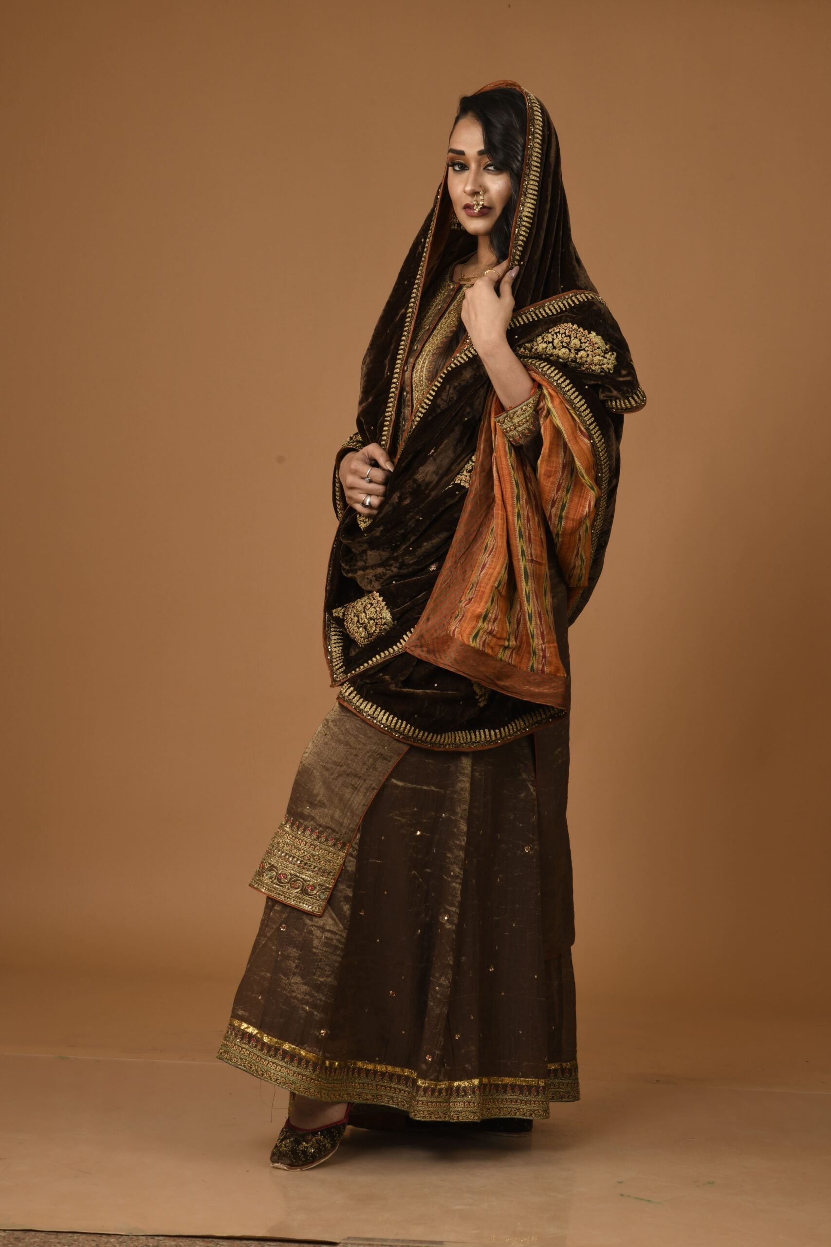 Tissue kurta featuring zardosi work paired with tissue sharara and silk velvet dupatta.