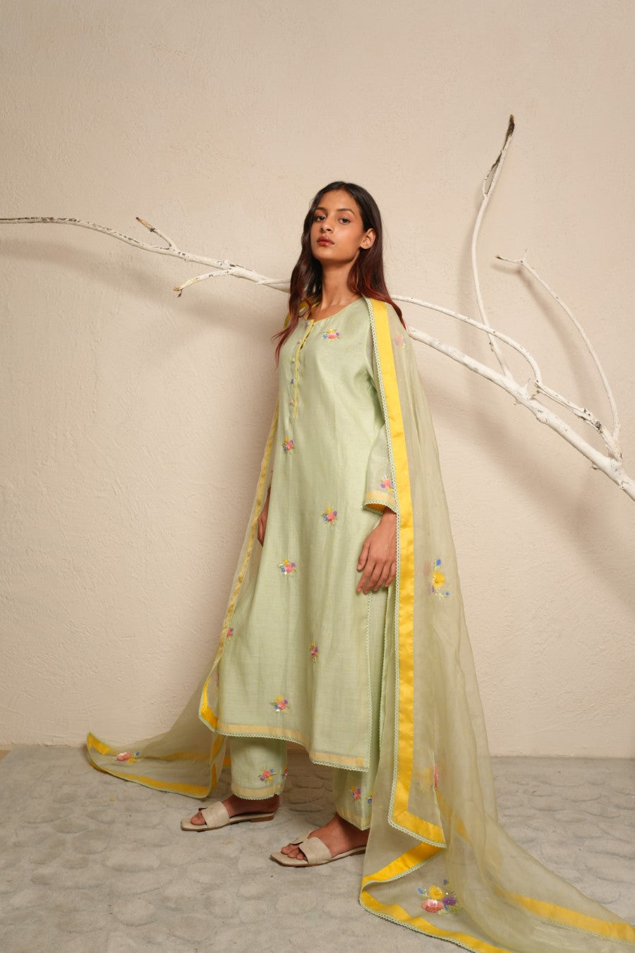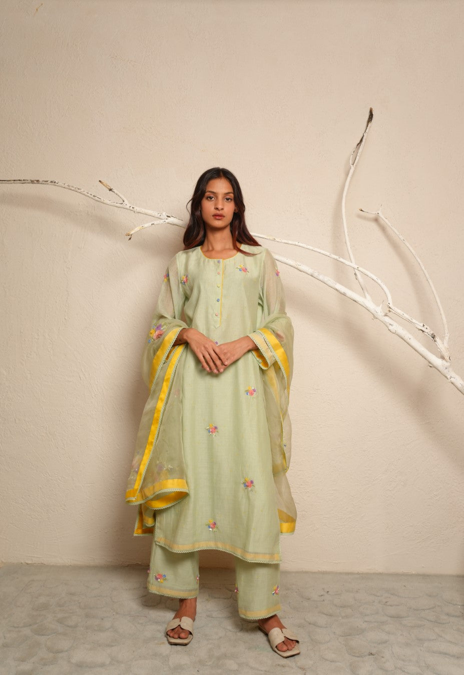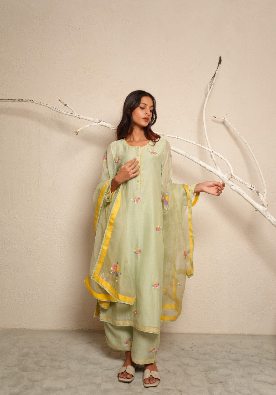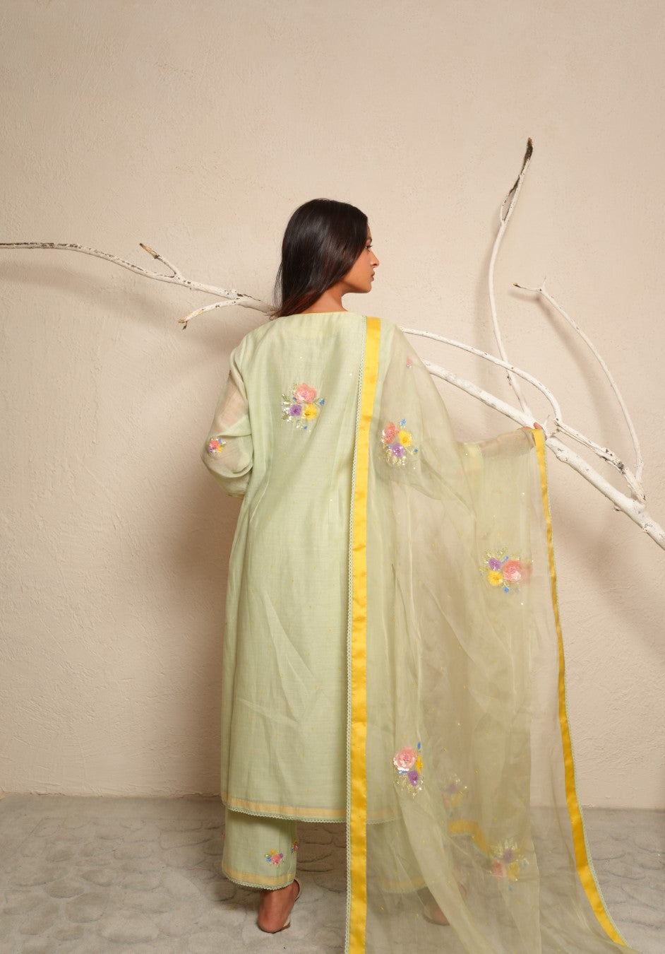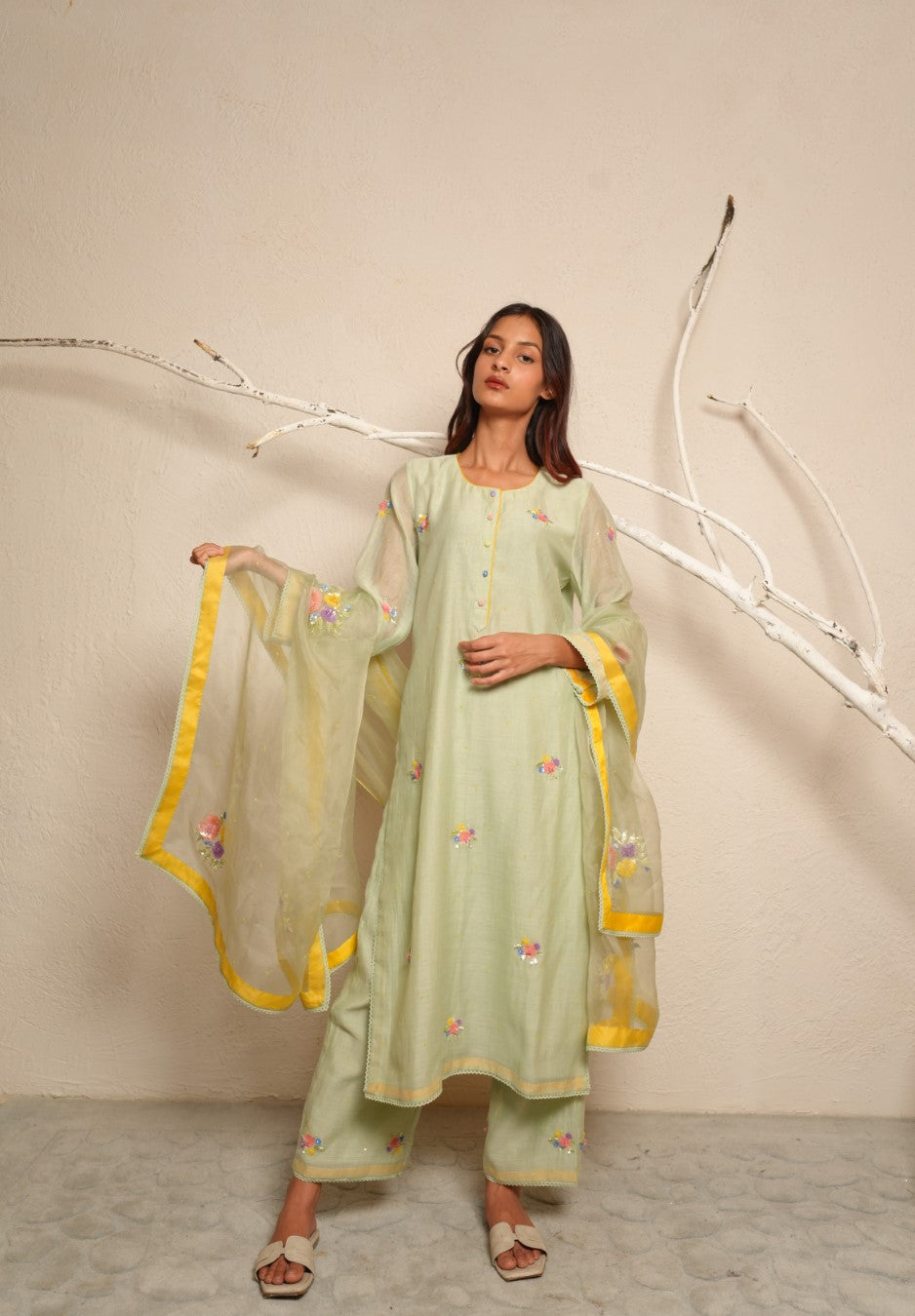 Fresh green colour fine chanderi kurta paired with trouser and silk organza dupatta featuring sequins and bead hand embroidery flower motifs kurta set.
