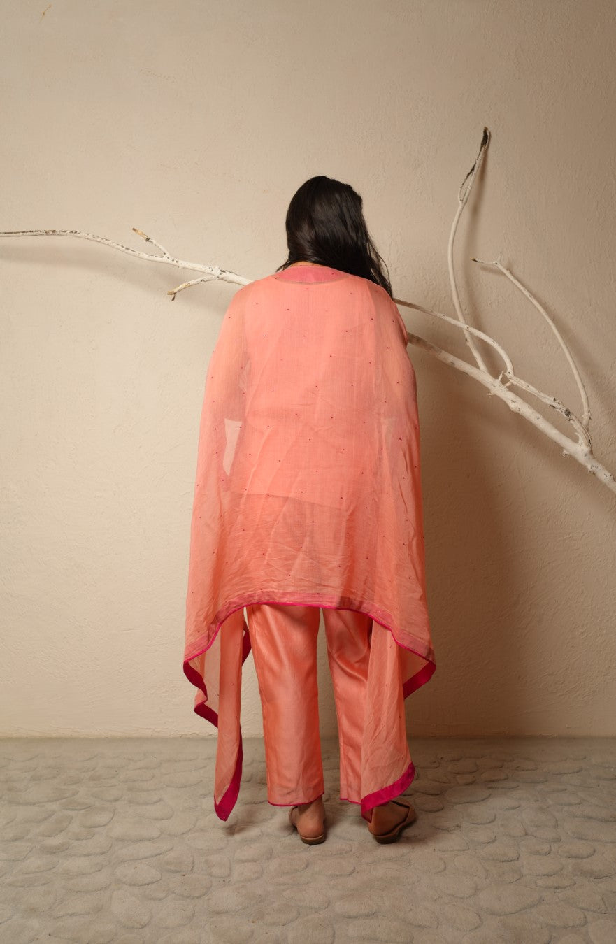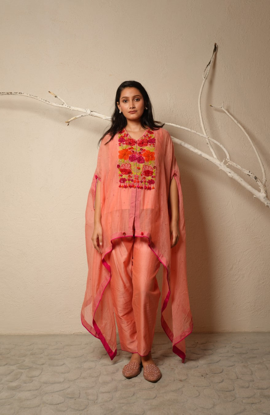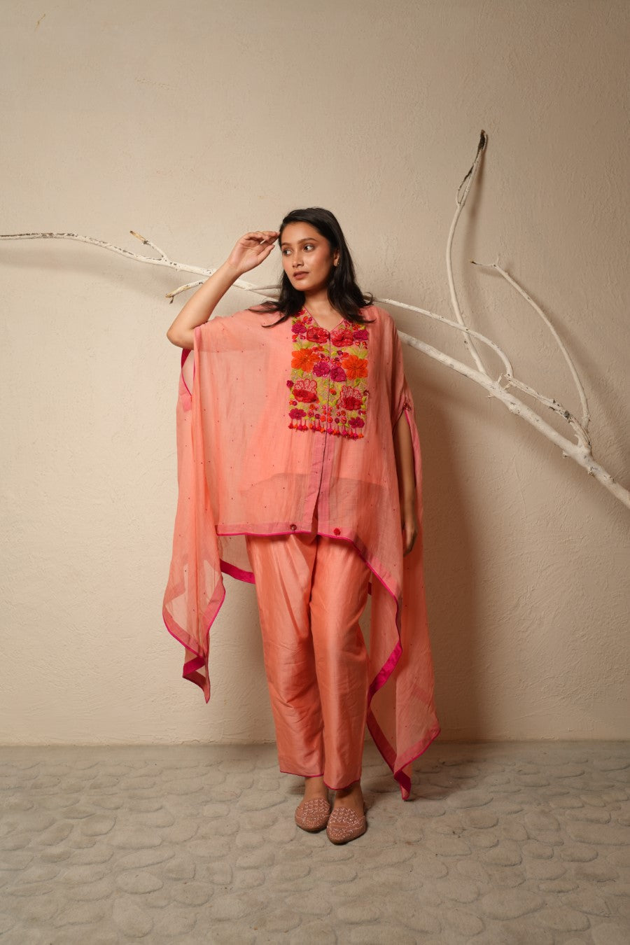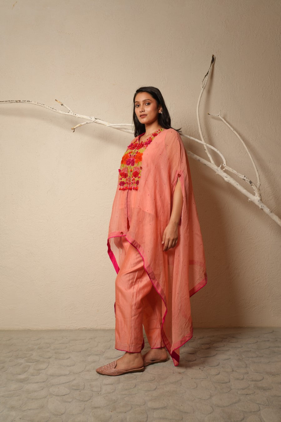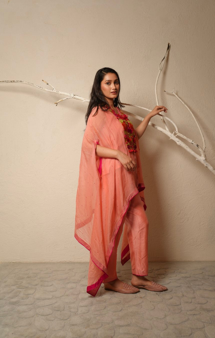 Peach fusion wear cape in fine chanderi paired with silk Chanderi trousers featuring multicoloured embroidery with threads and sequins, with crotchet flower.