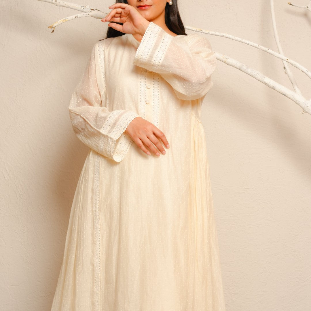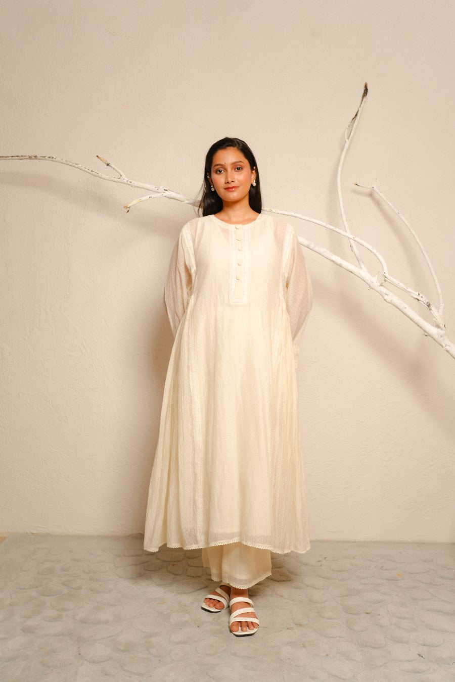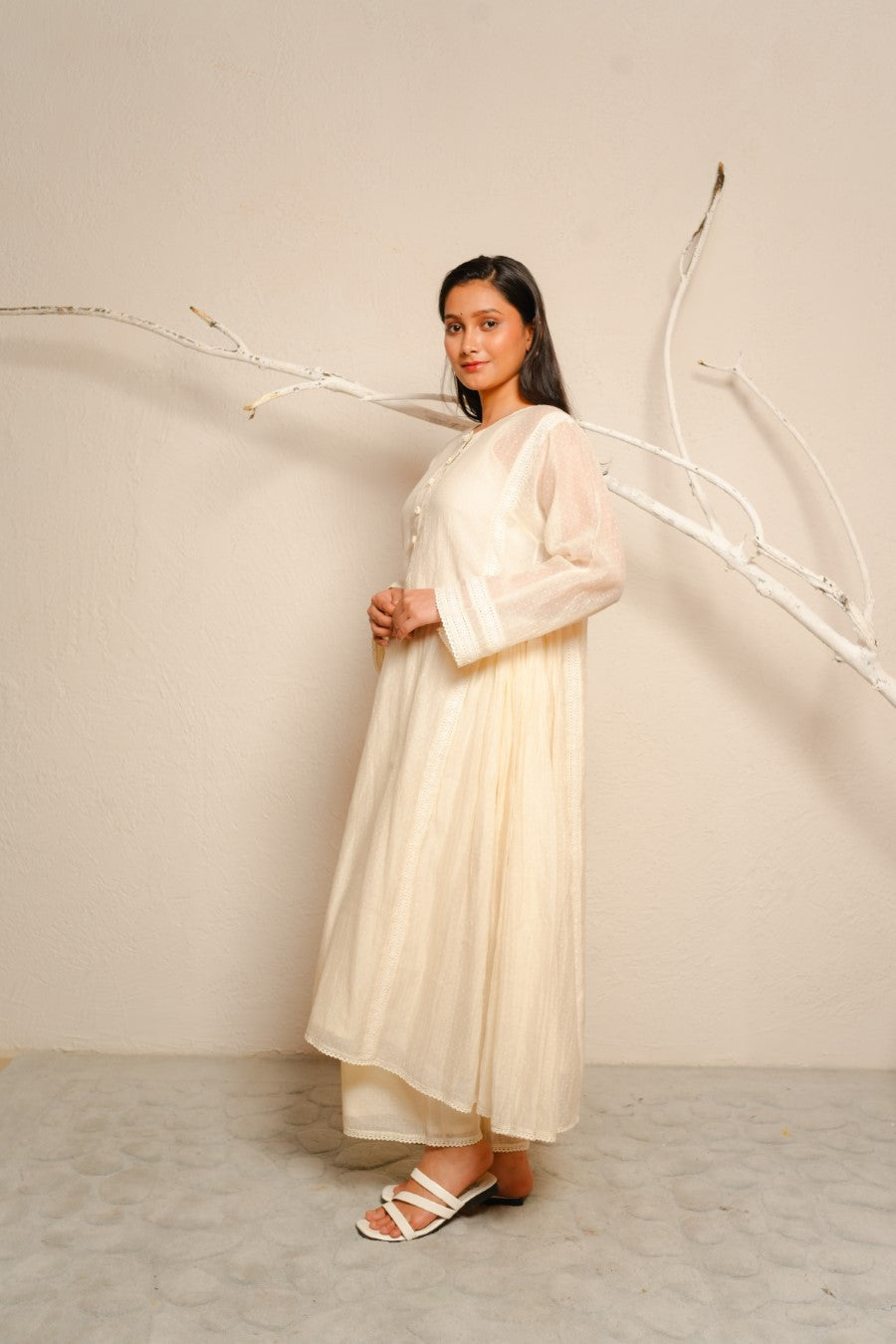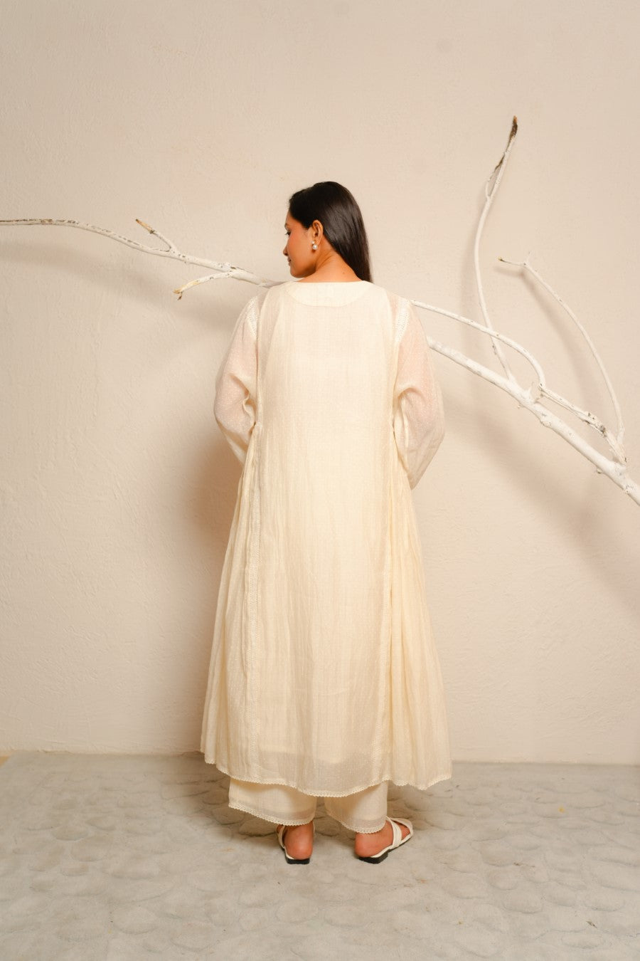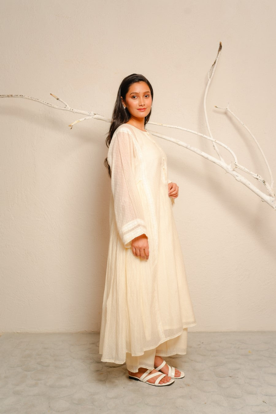 Ivory colour choga style kurta paired with silk Chanderi trousers featuring chikankari work detailed with lace.