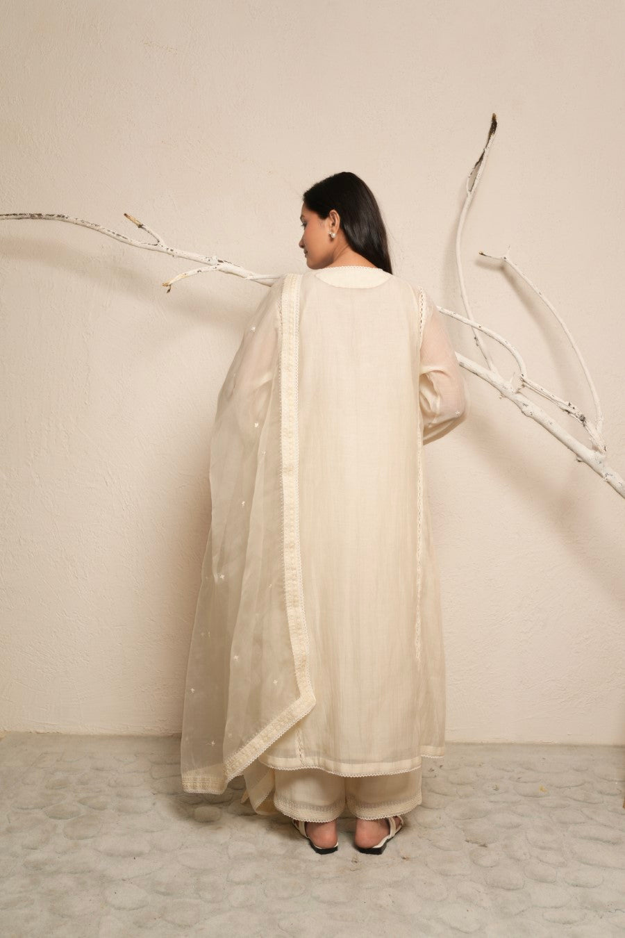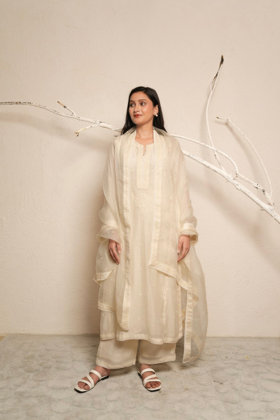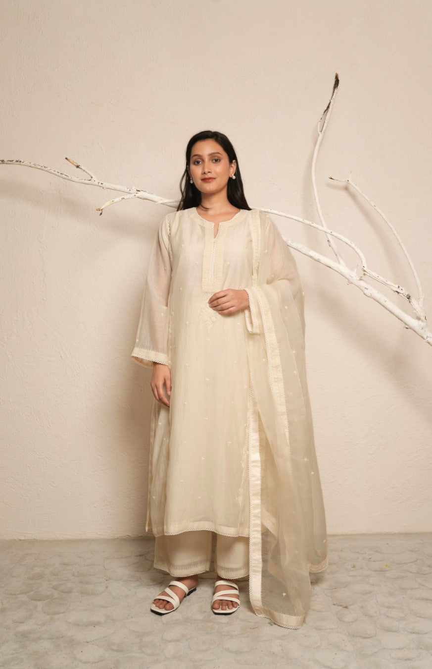 Fabric: kurta - fine chanderi, pant - fine chanderi, dupatta - silk organza