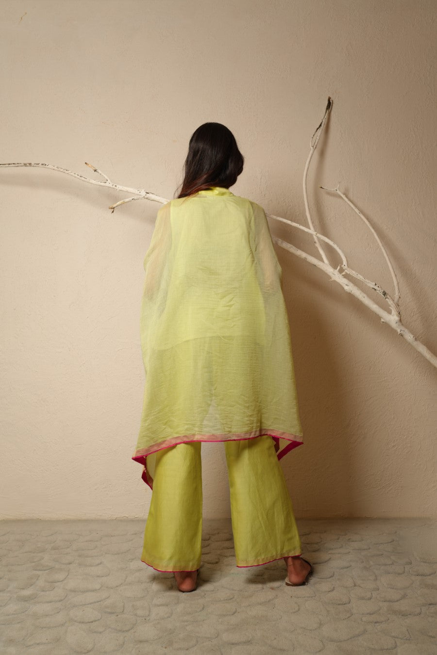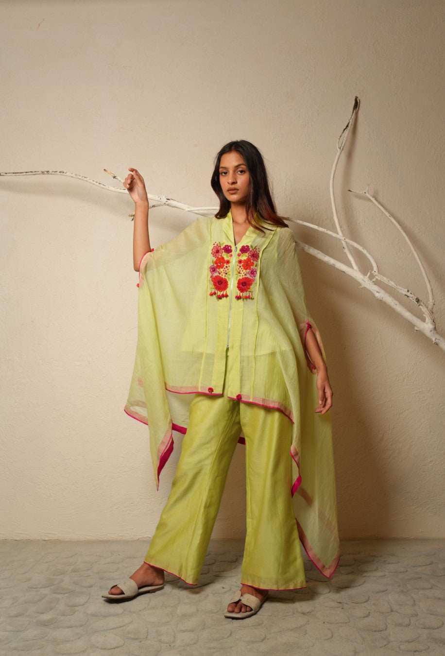 Light green fusion wear cape in fine chanderi paired with silk Chanderi trousers featuring multicoloured embroidery with threads and sequins, with crotchet flower.