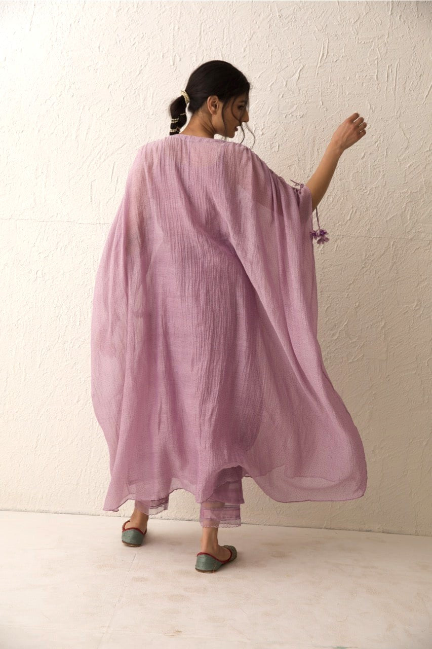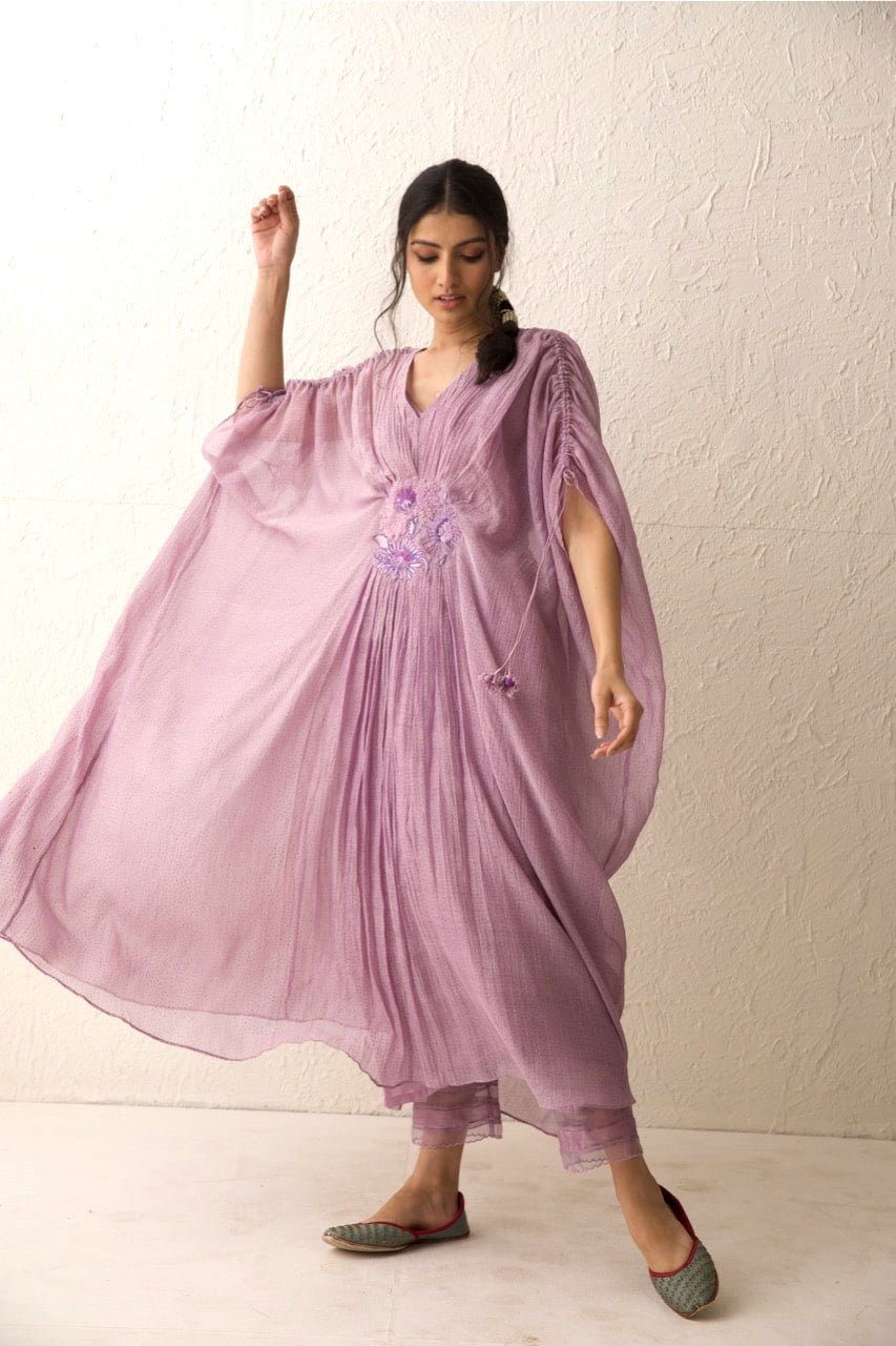 Embrace the carefree spirit of the breezy Chanderi Kaftan in a soothing lavender hue. Its flowing silhouette, adorned with embroidered motifs and playful tassels, evokes the essence of dancing in an open field, where the gentle breeze weaves dreams into reality. Paired with chanderi trousers, this ensemble is a true testament to bohemian elegance.